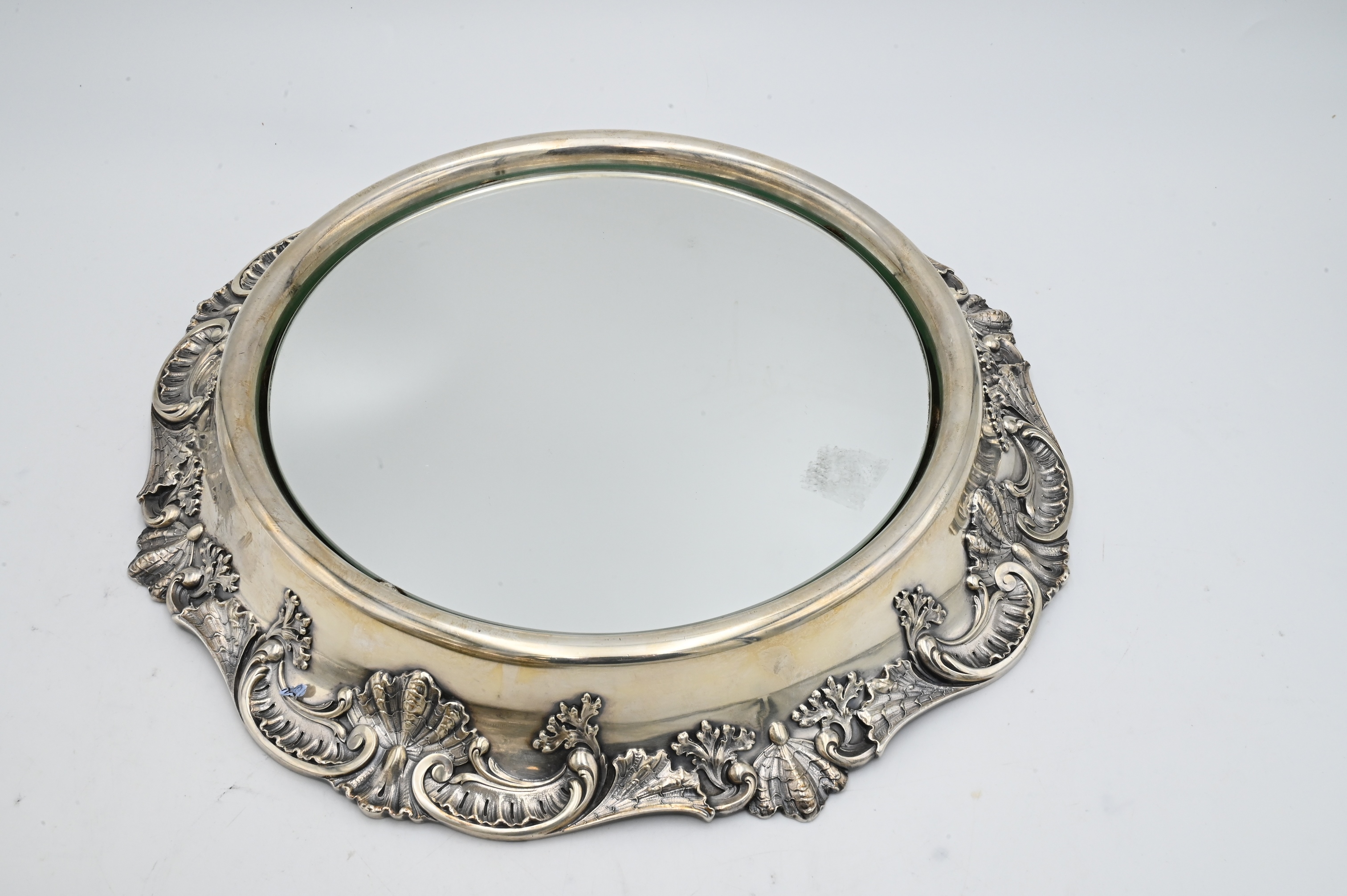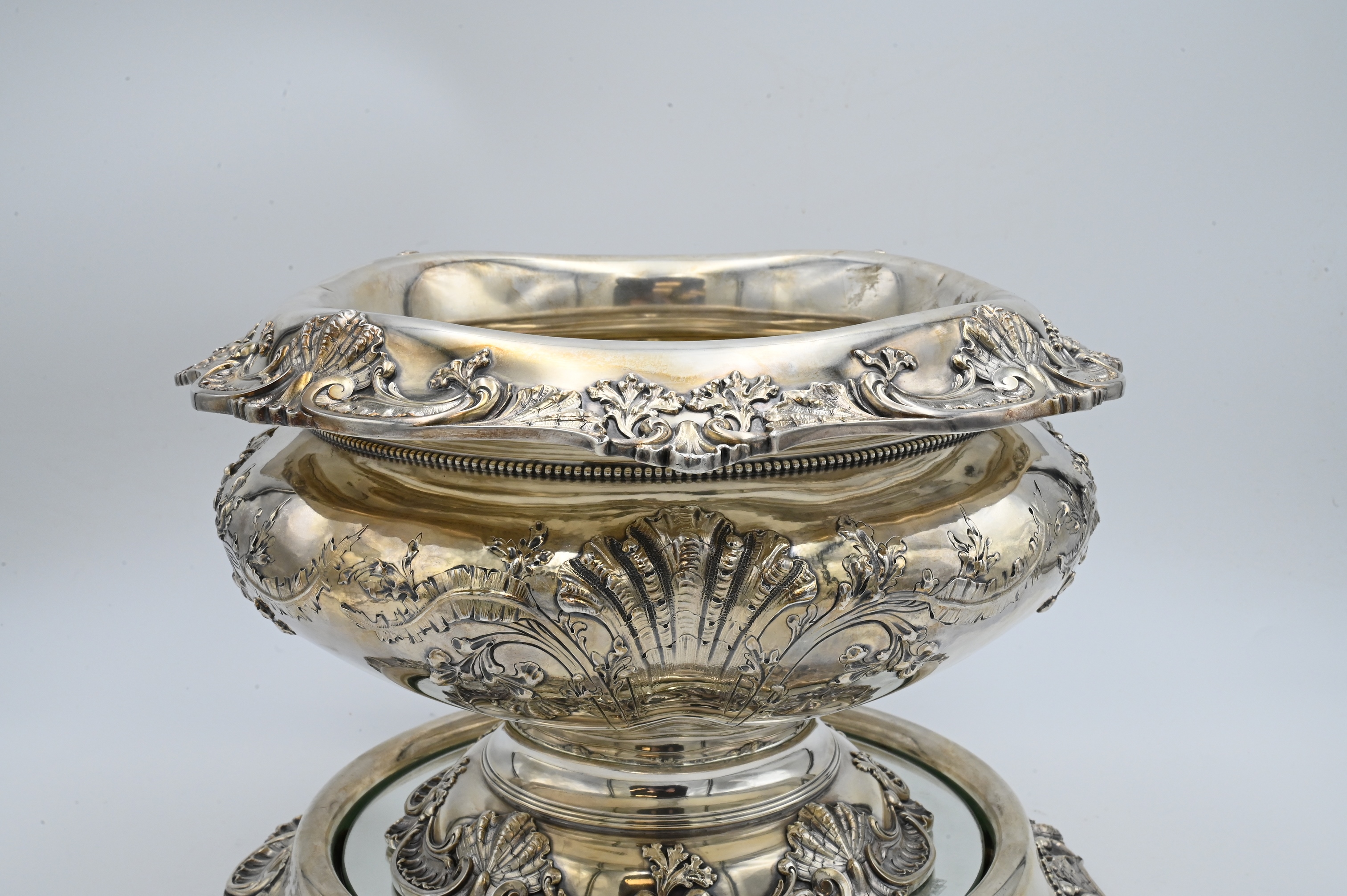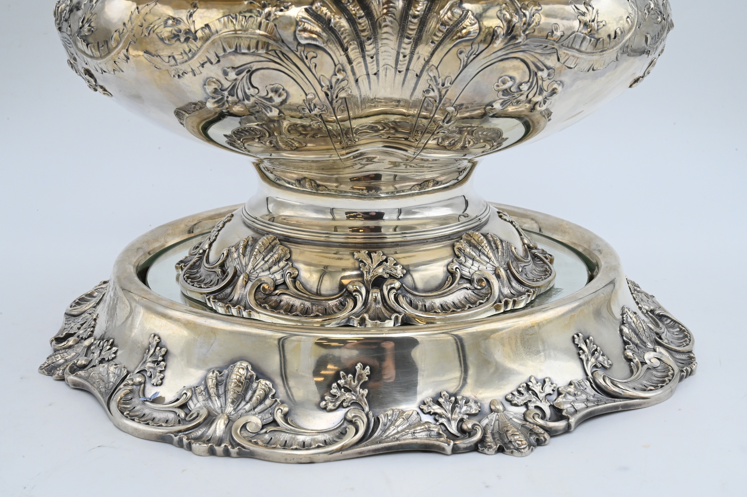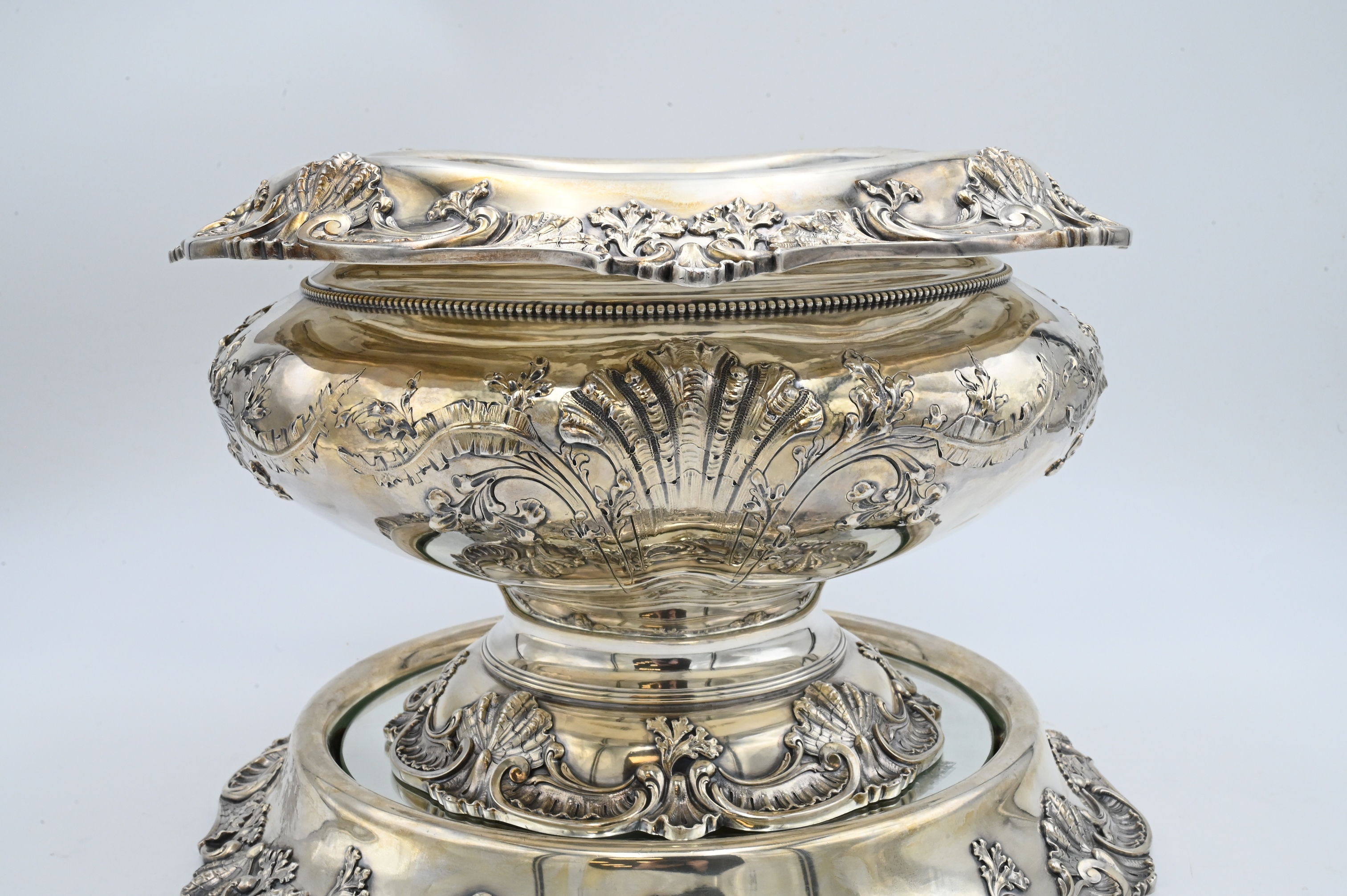 height 9 1/4 inches, diameter 14 inches, 16 pint, plateau diameter 15 inches, bowl 101.6 t.oz., plateau 34.2 t.oz, total weight, 135.8 t. oz.