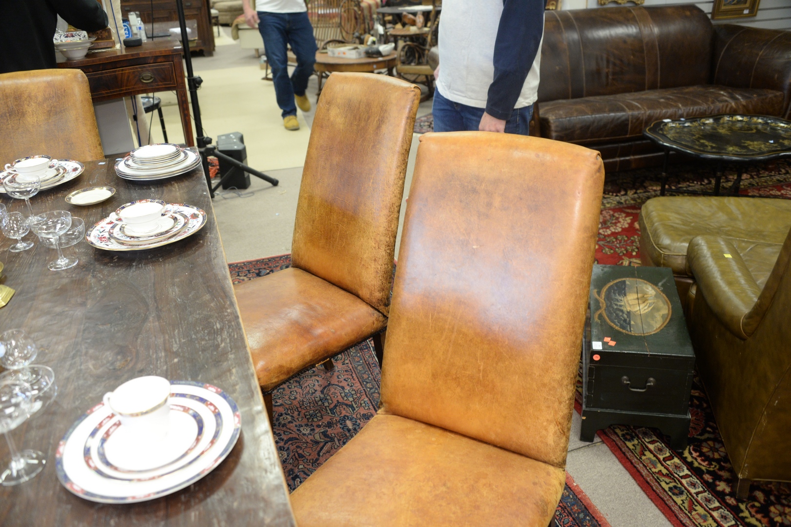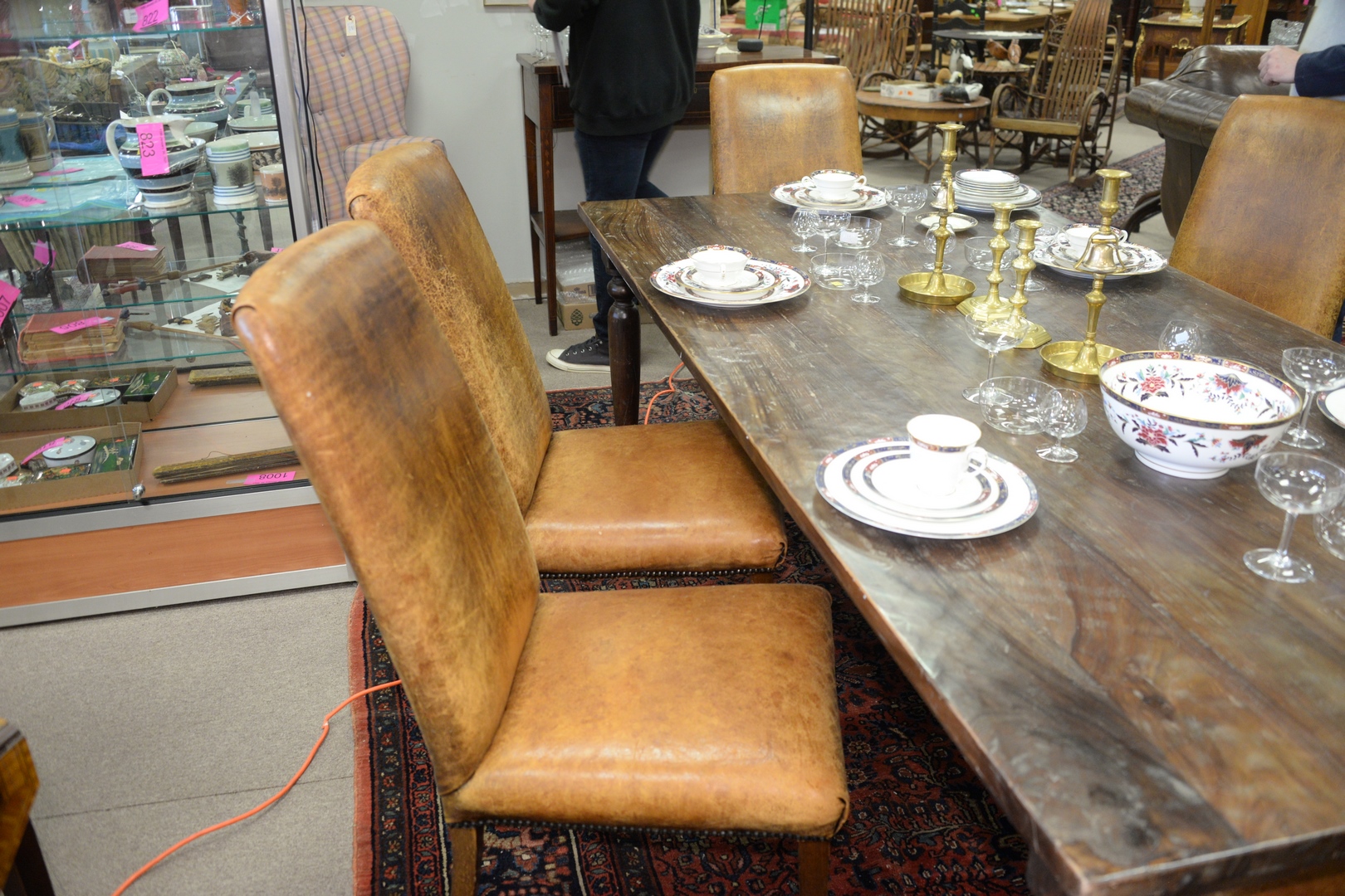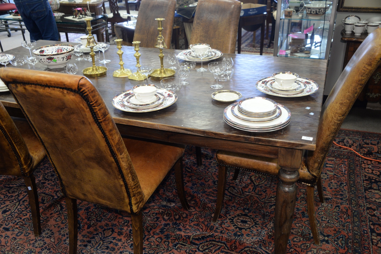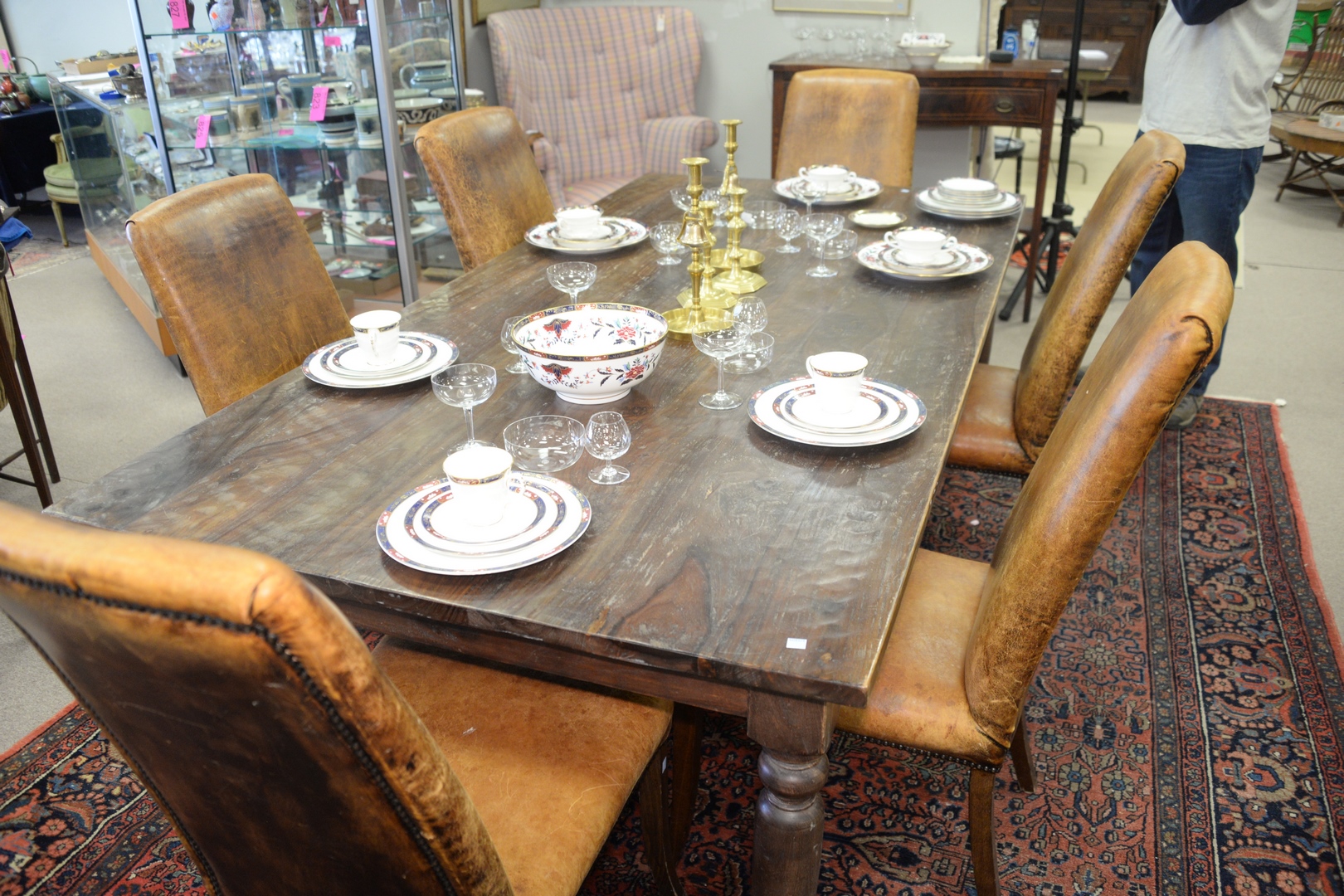 Lot 124: Seven Piece Dining Set to include farm style table with planed top along with six leather upholstered chairs height 30 1/2 inches, …