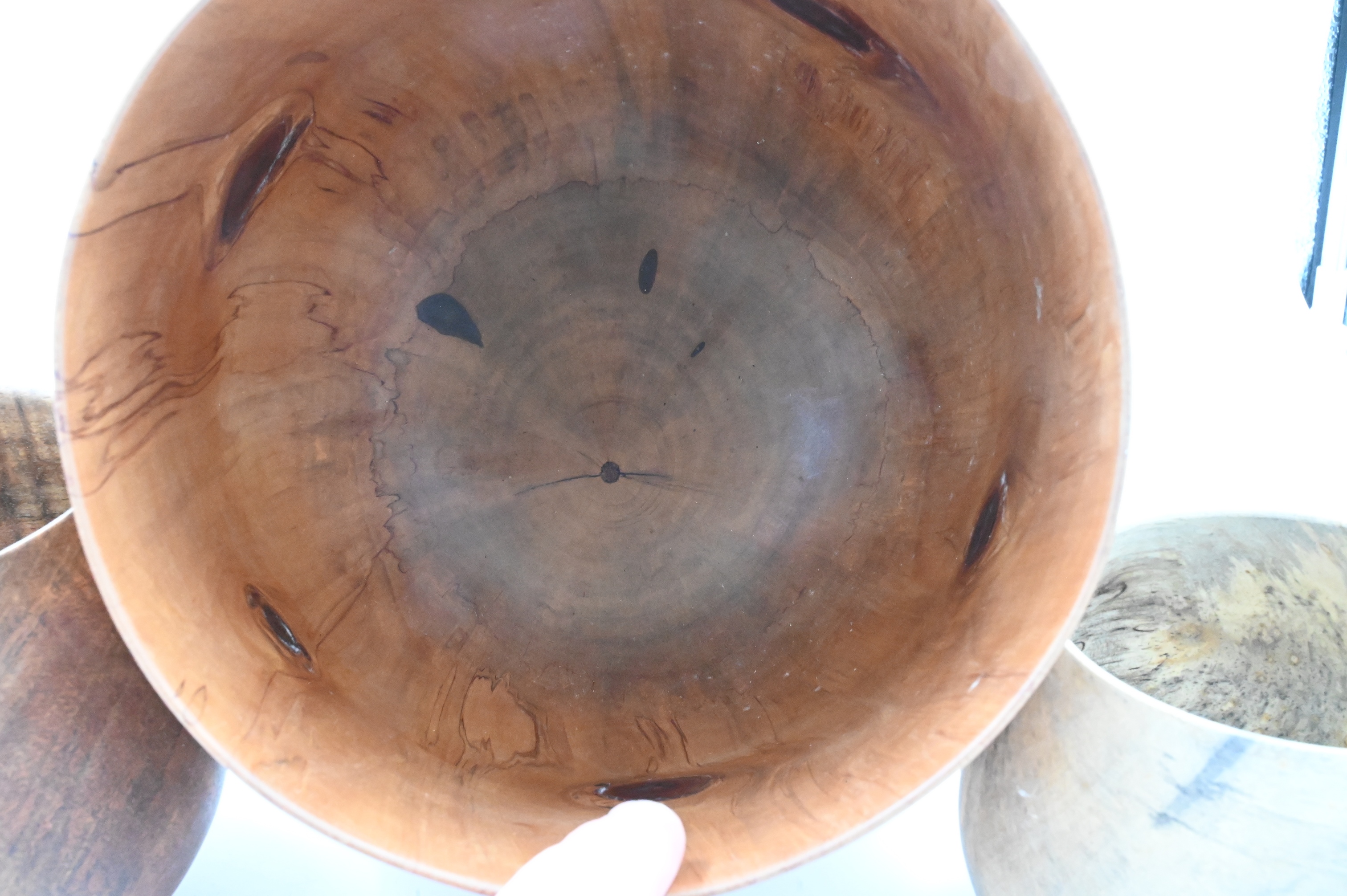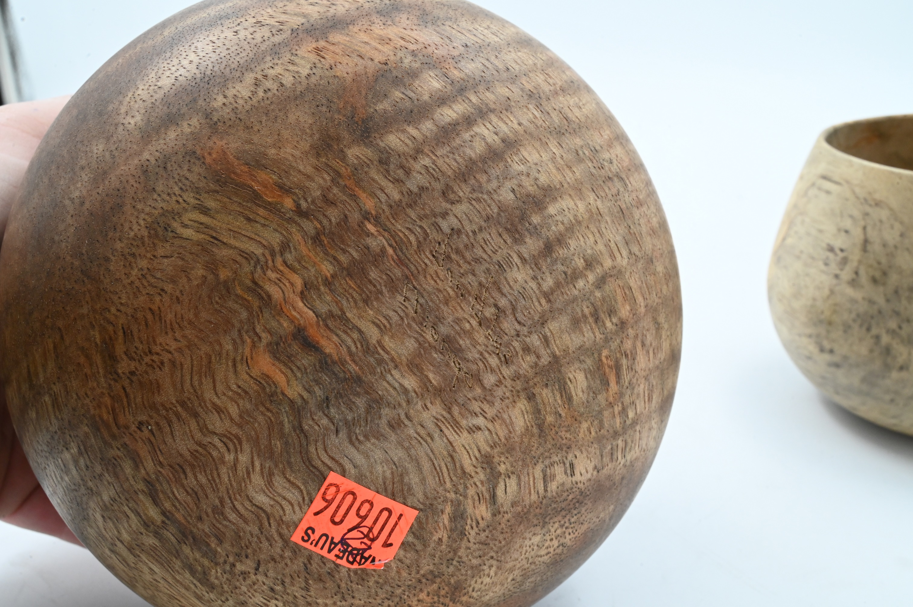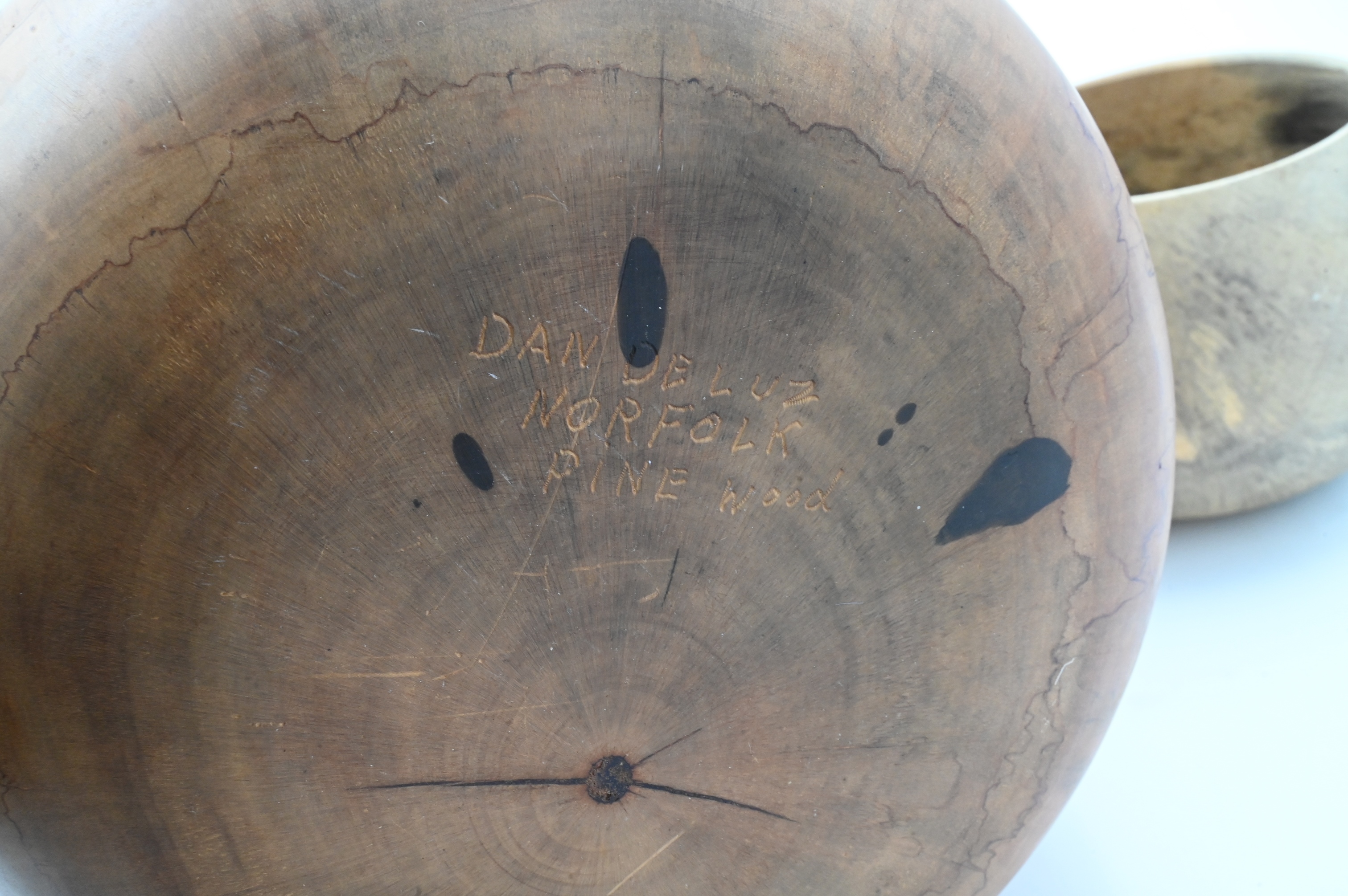 to include large Norfolk pine wood turned bowl, small mango turned wood bowl, along with small kukui turned wood bowl, each inscribed with wood variety and signed Dan DeLuz