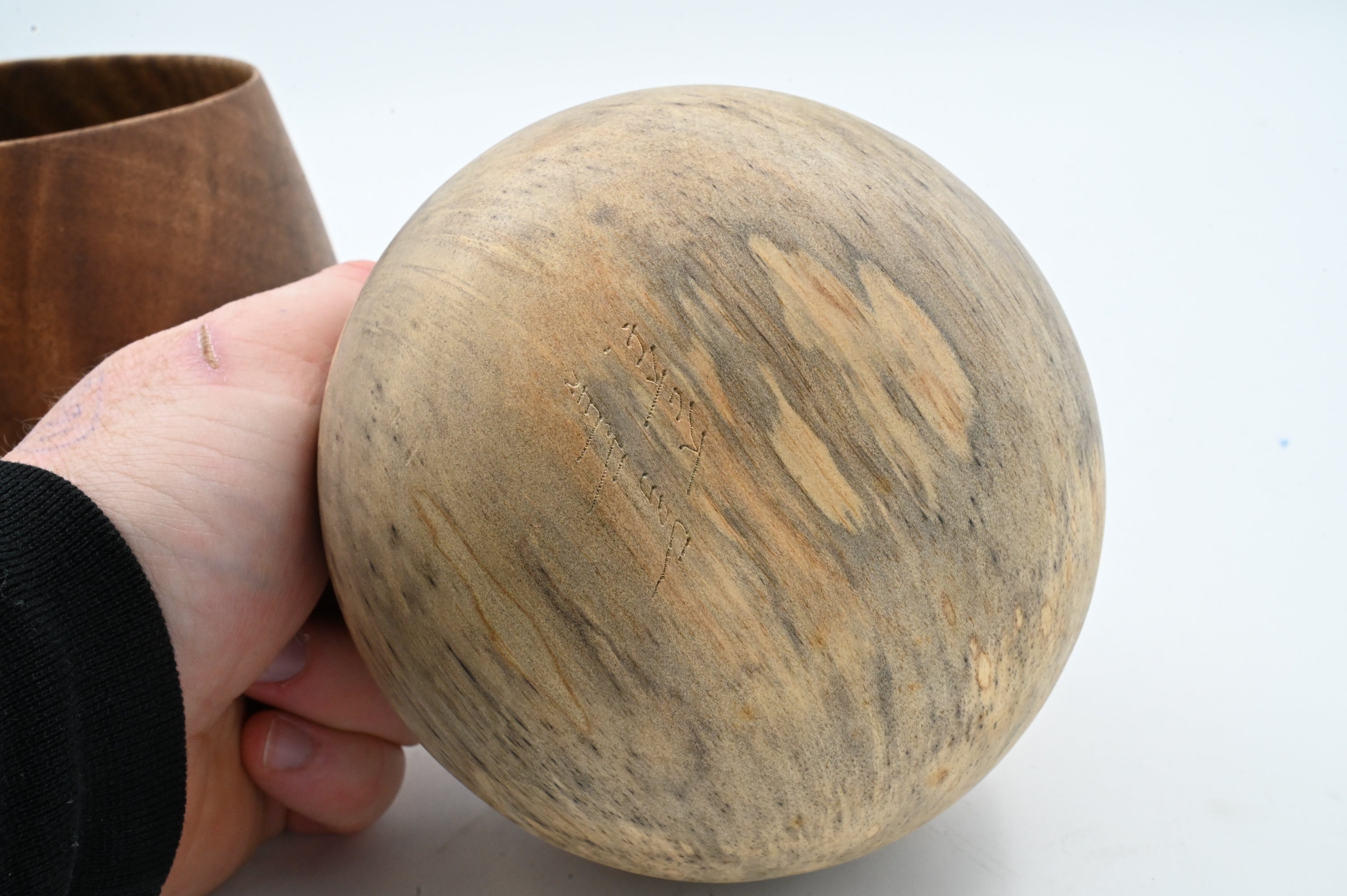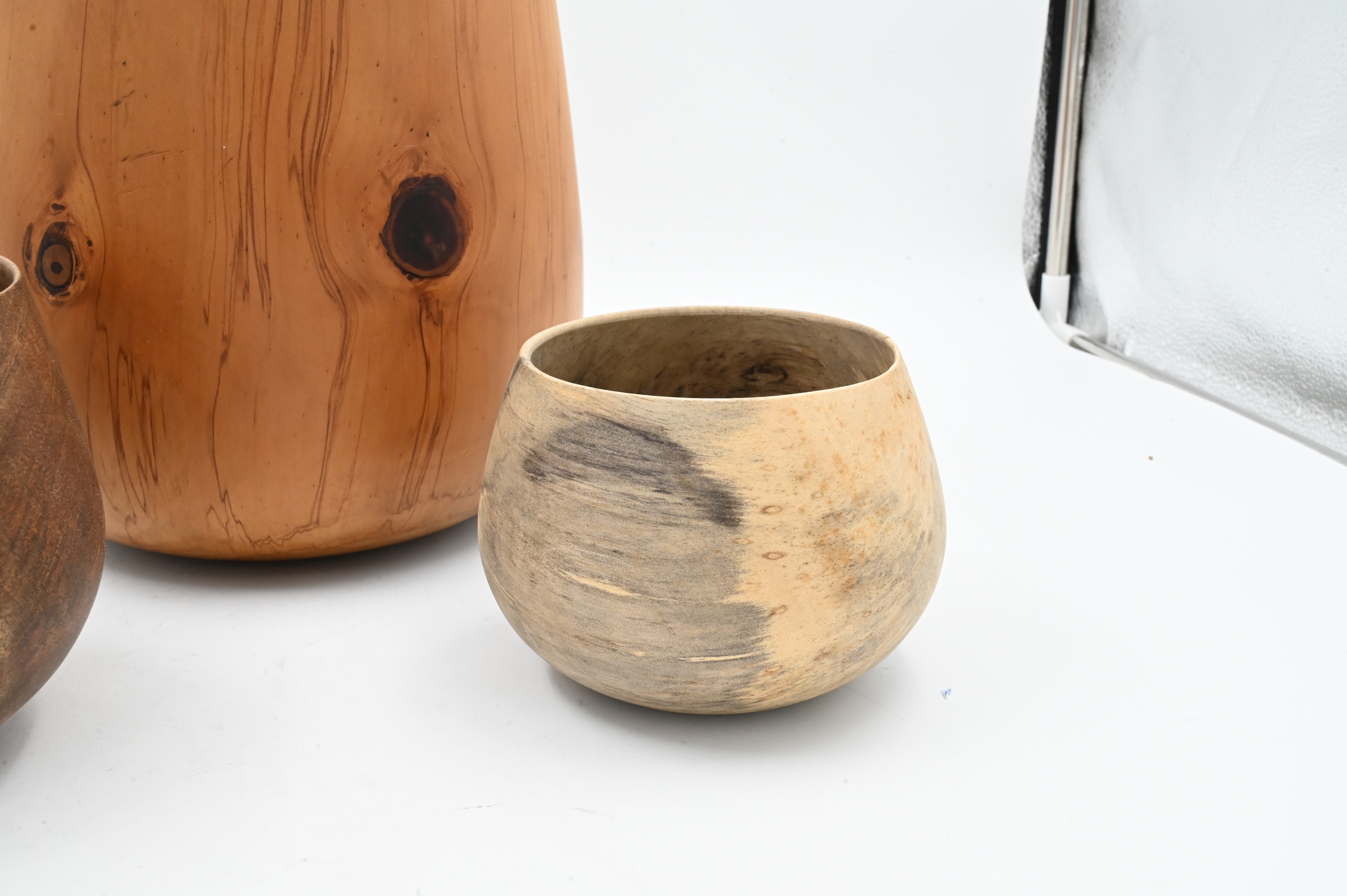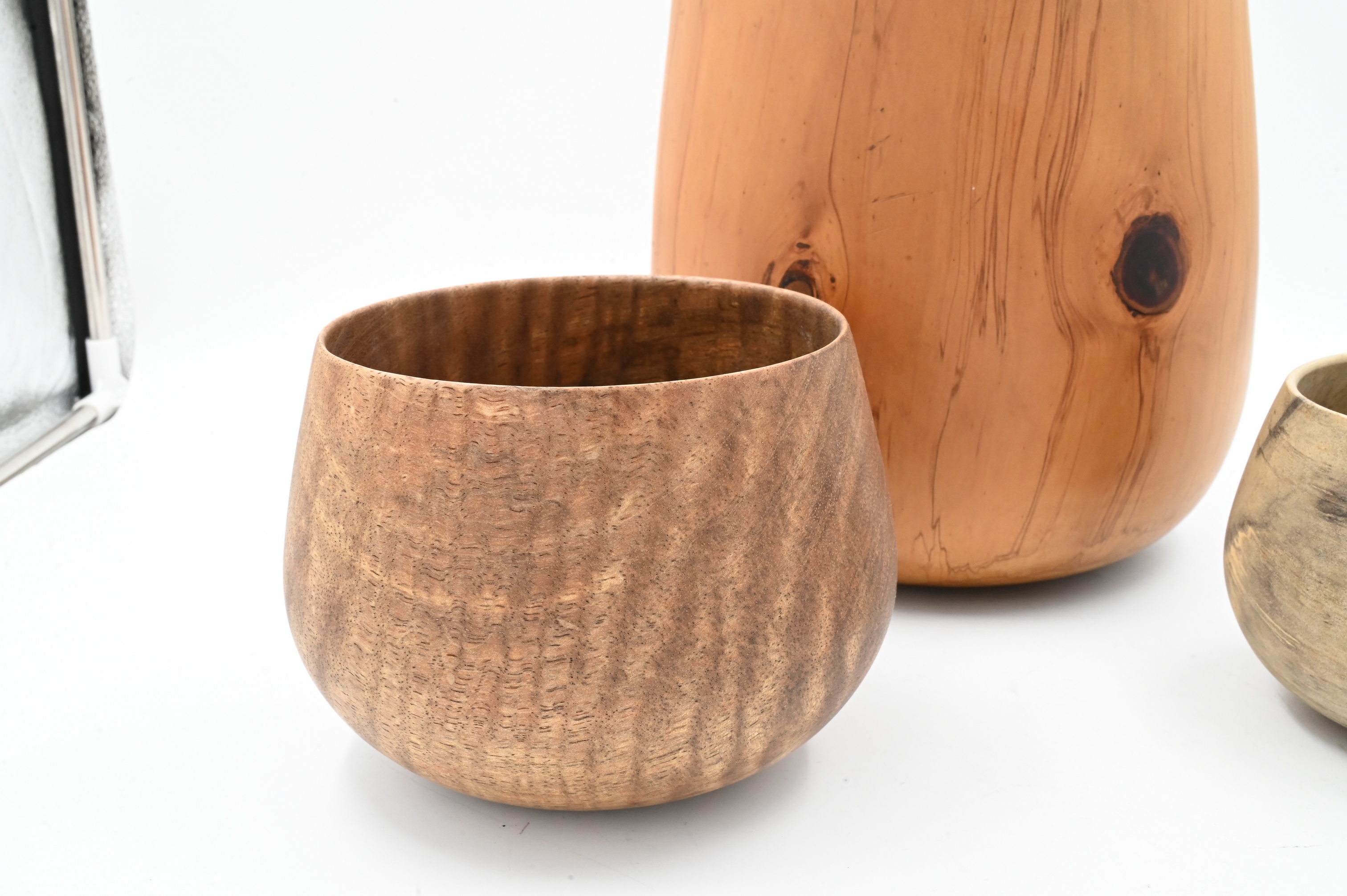to include large Norfolk pine wood turned bowl, small mango turned wood bowl, along with small kukui turned wood bowl, each inscribed with wood variety and signed Dan DeLuz