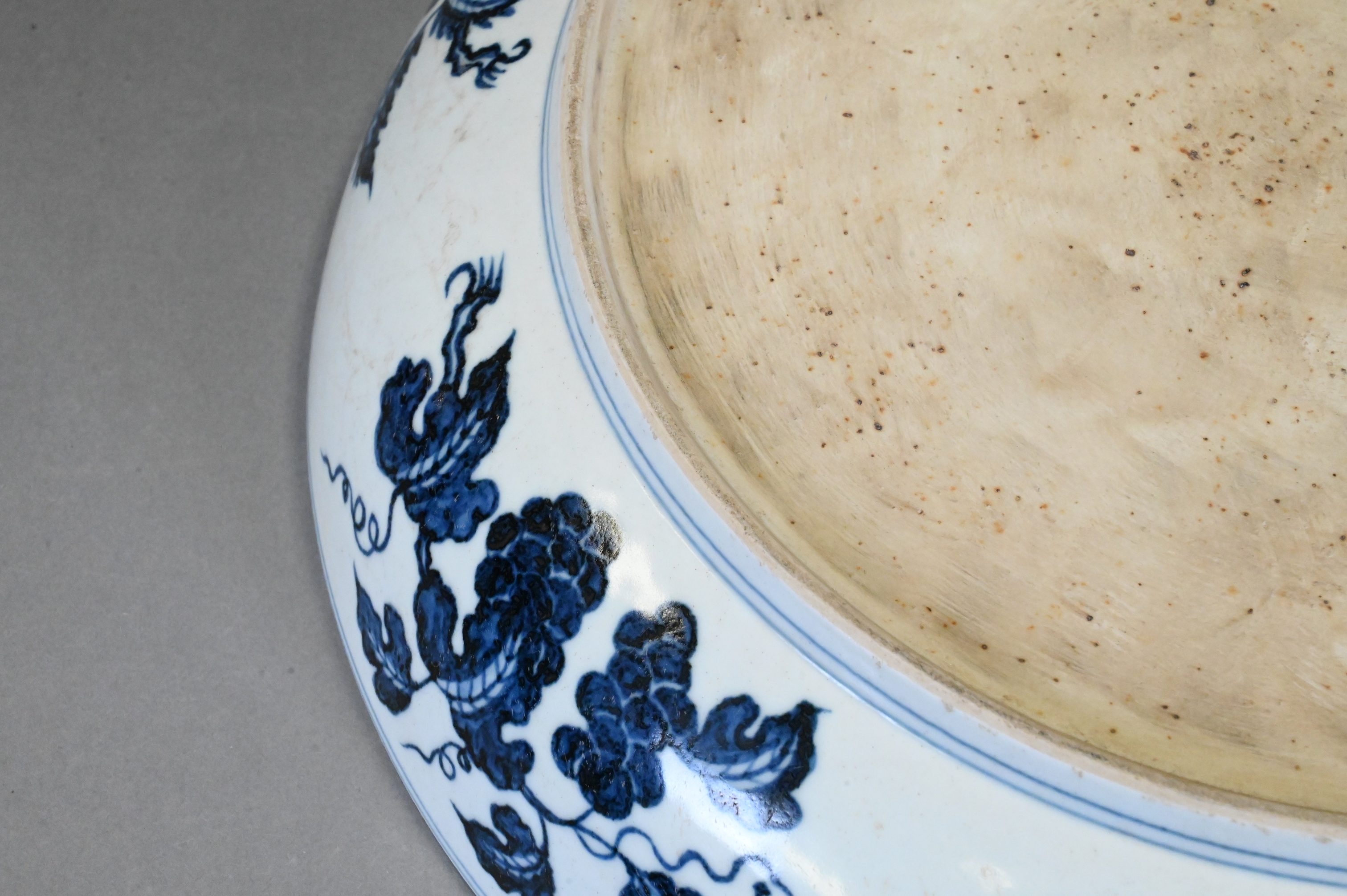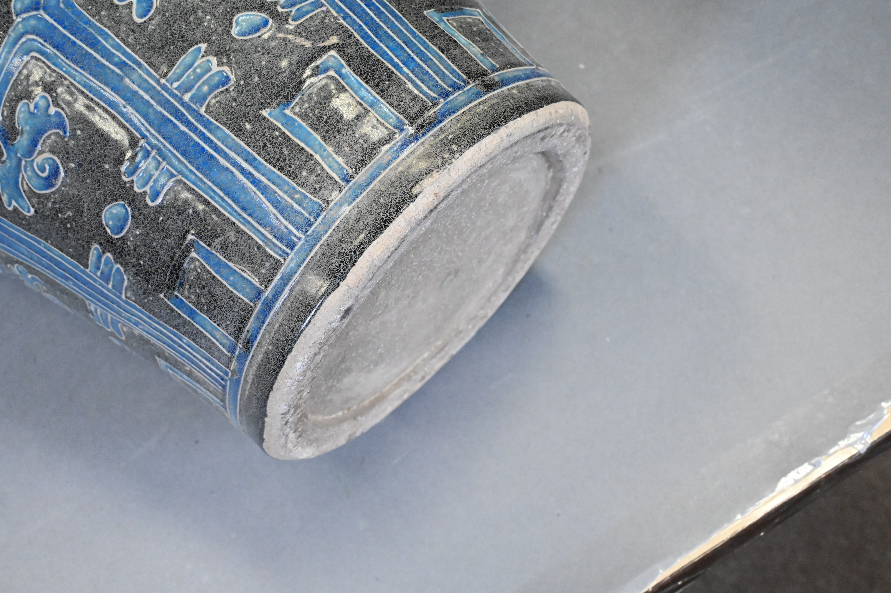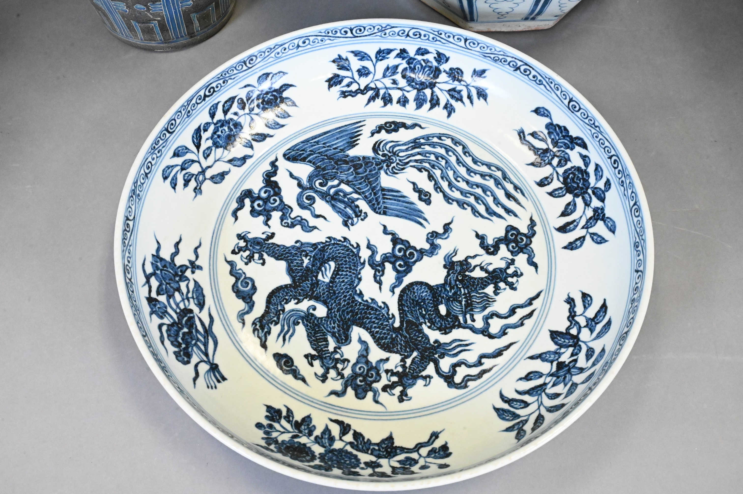 to include a large charger having pheonix and five clawed dragon motif with scrolling border, Chinese Fahua Meiping style vase in blue and gray crackle glaze having raised slip line motif of scrolling vine and flowers on tapering body, as well as a large Yuan style jar having bull / pig figural handles and decorative cartouches to body