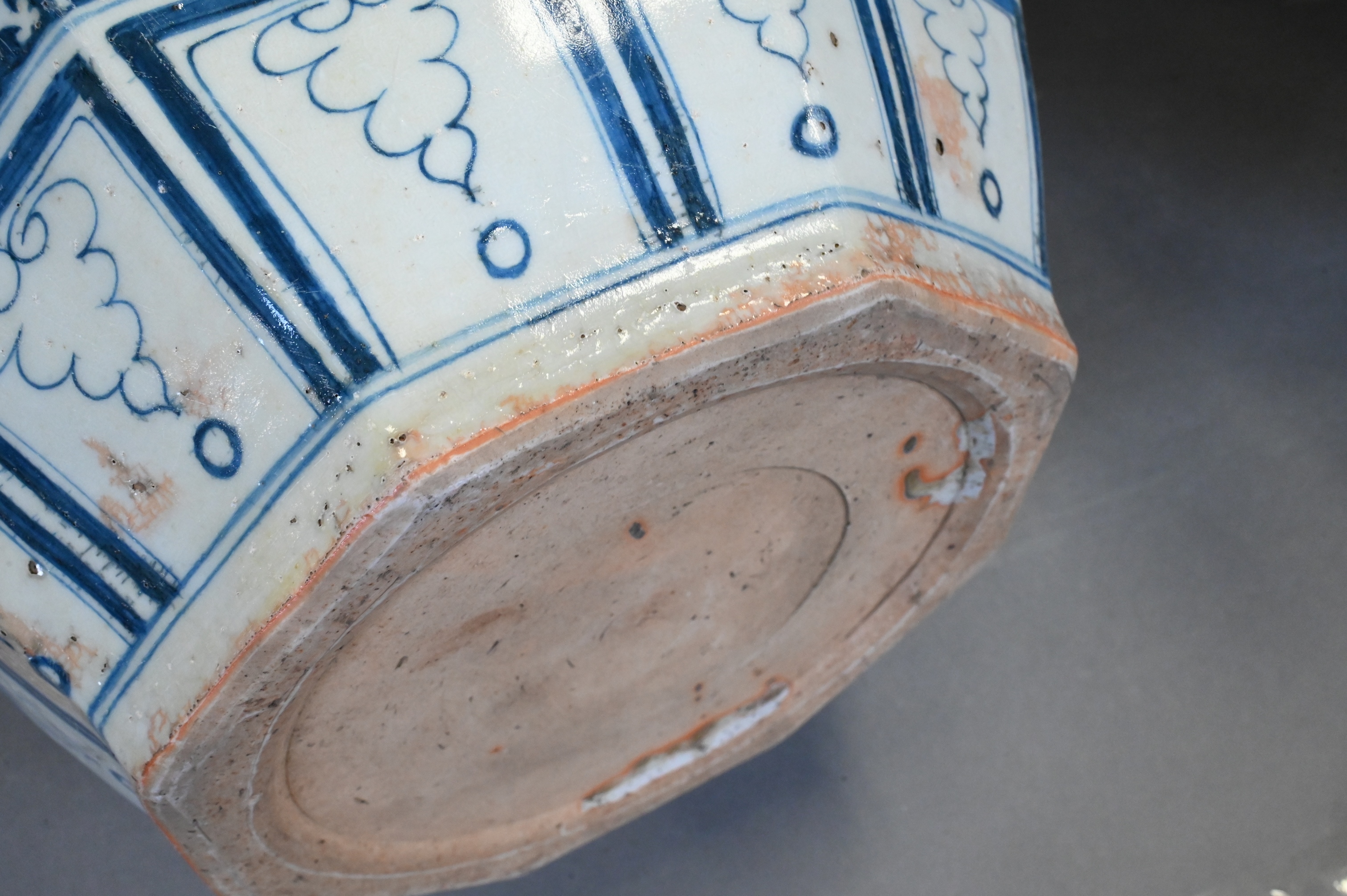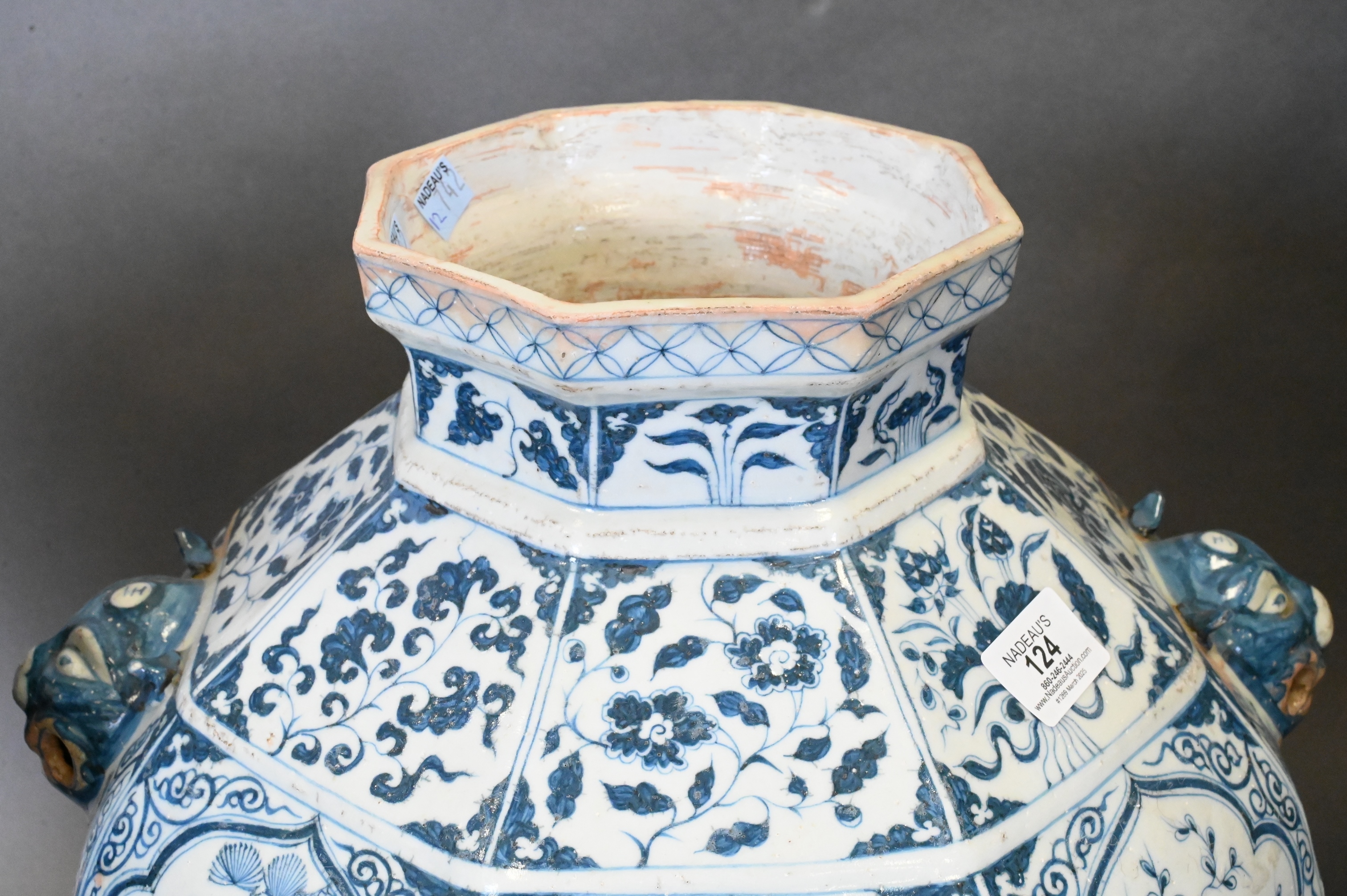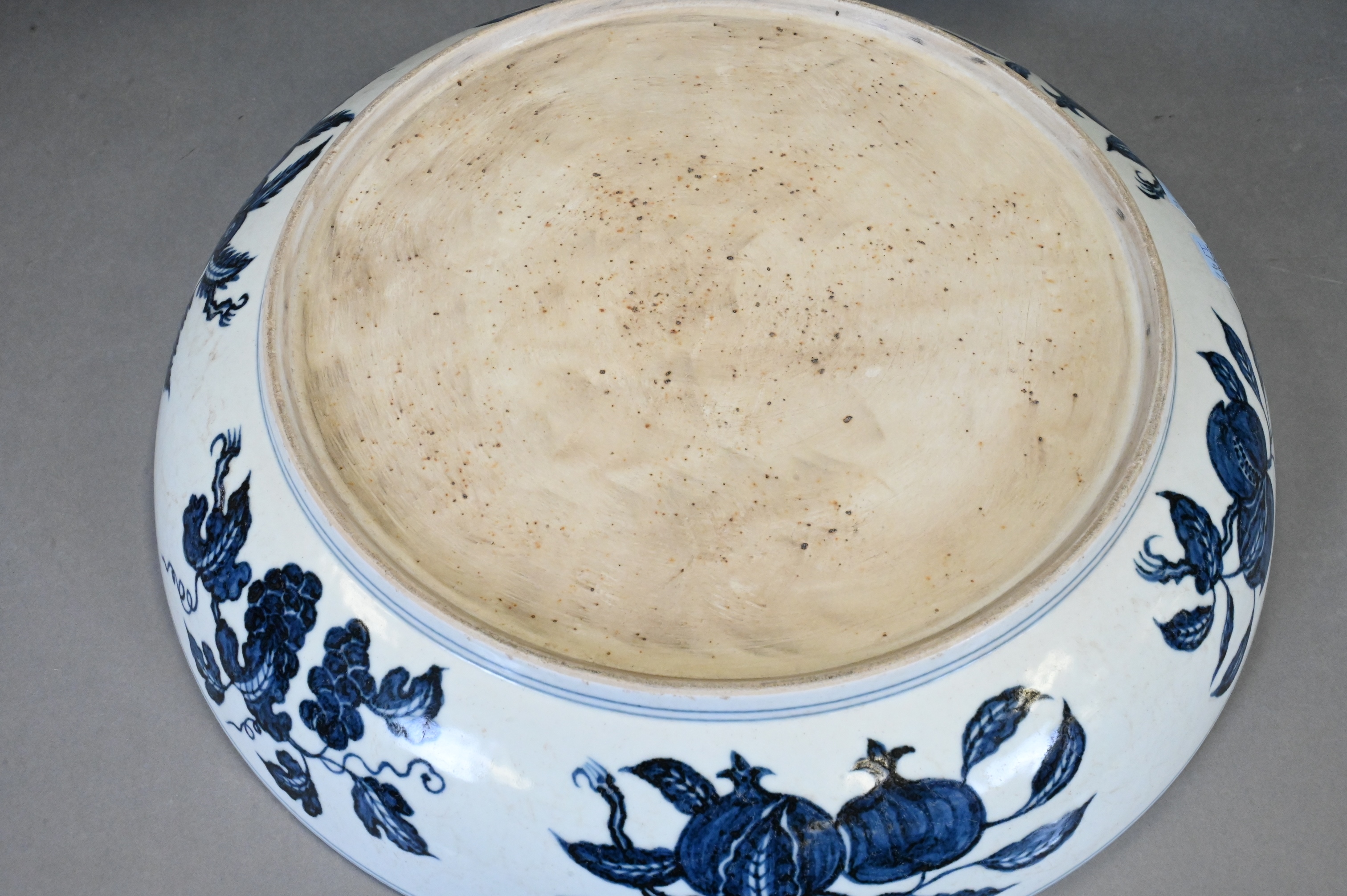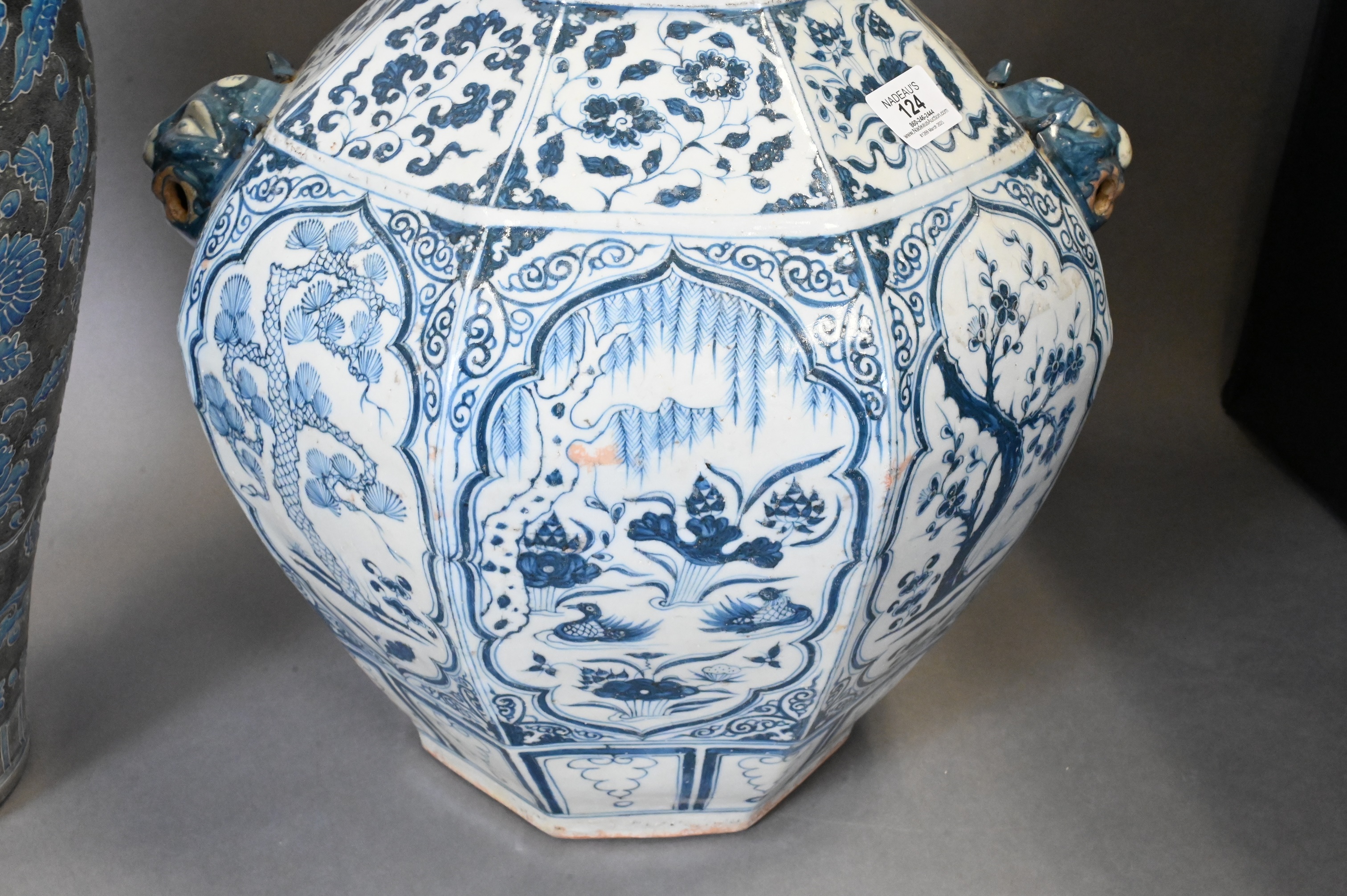 to include a large charger having pheonix and five clawed dragon motif with scrolling border, Chinese Fahua Meiping style vase in blue and gray crackle glaze having raised slip line motif of scrolling vine and flowers on tapering body, as well as a large Yuan style jar having bull / pig figural handles and decorative cartouches to body