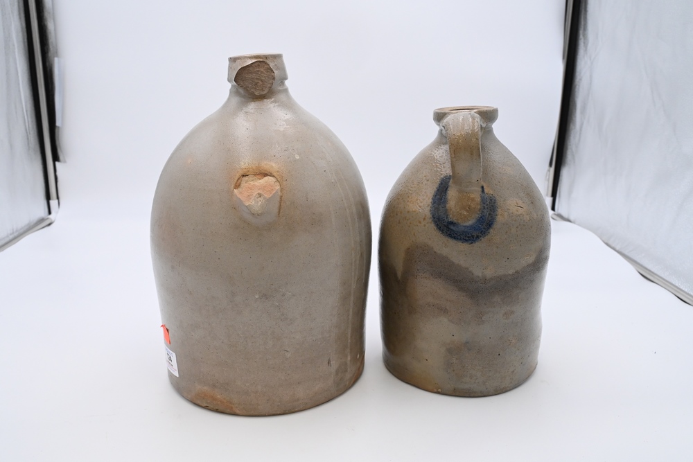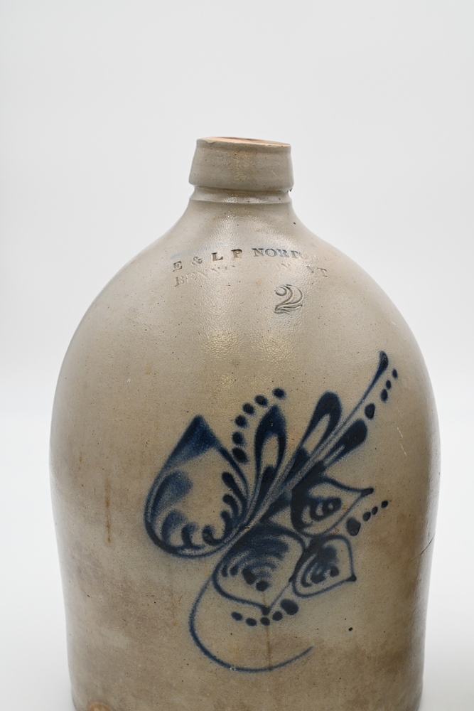 Lot 124: Two Piece Stoneware Lot to include an E and LP Norton two gallon jug having cobalt flower marked “E and LP Norton, Bennington, VT” along with a Nichols and Boynton jug having cobalt design marked “Nichols and Boynton Burlington, VT” height 14 inches Provenance: Estate of Bruce Sasalla, East Hartford, Connecticut.