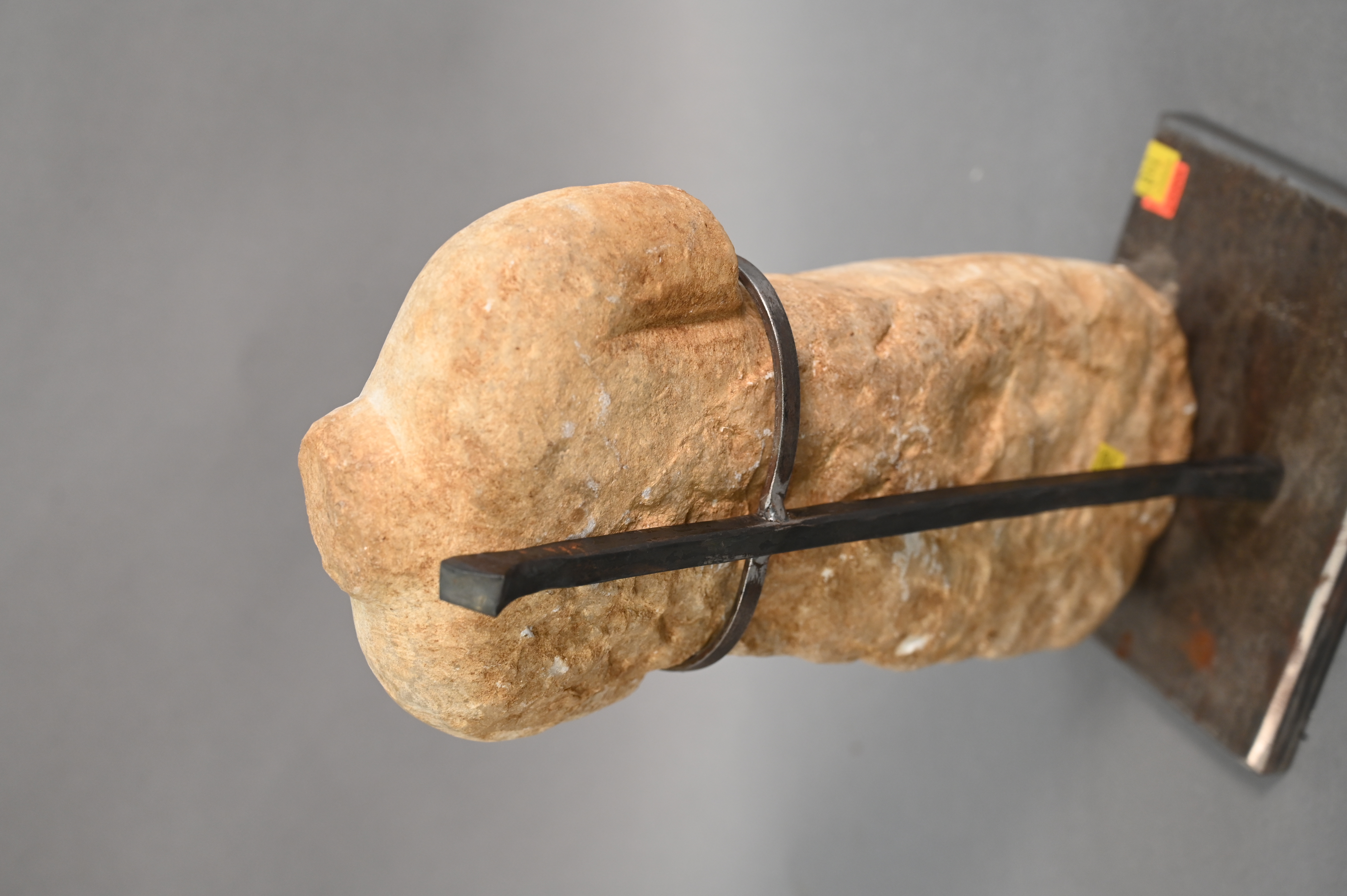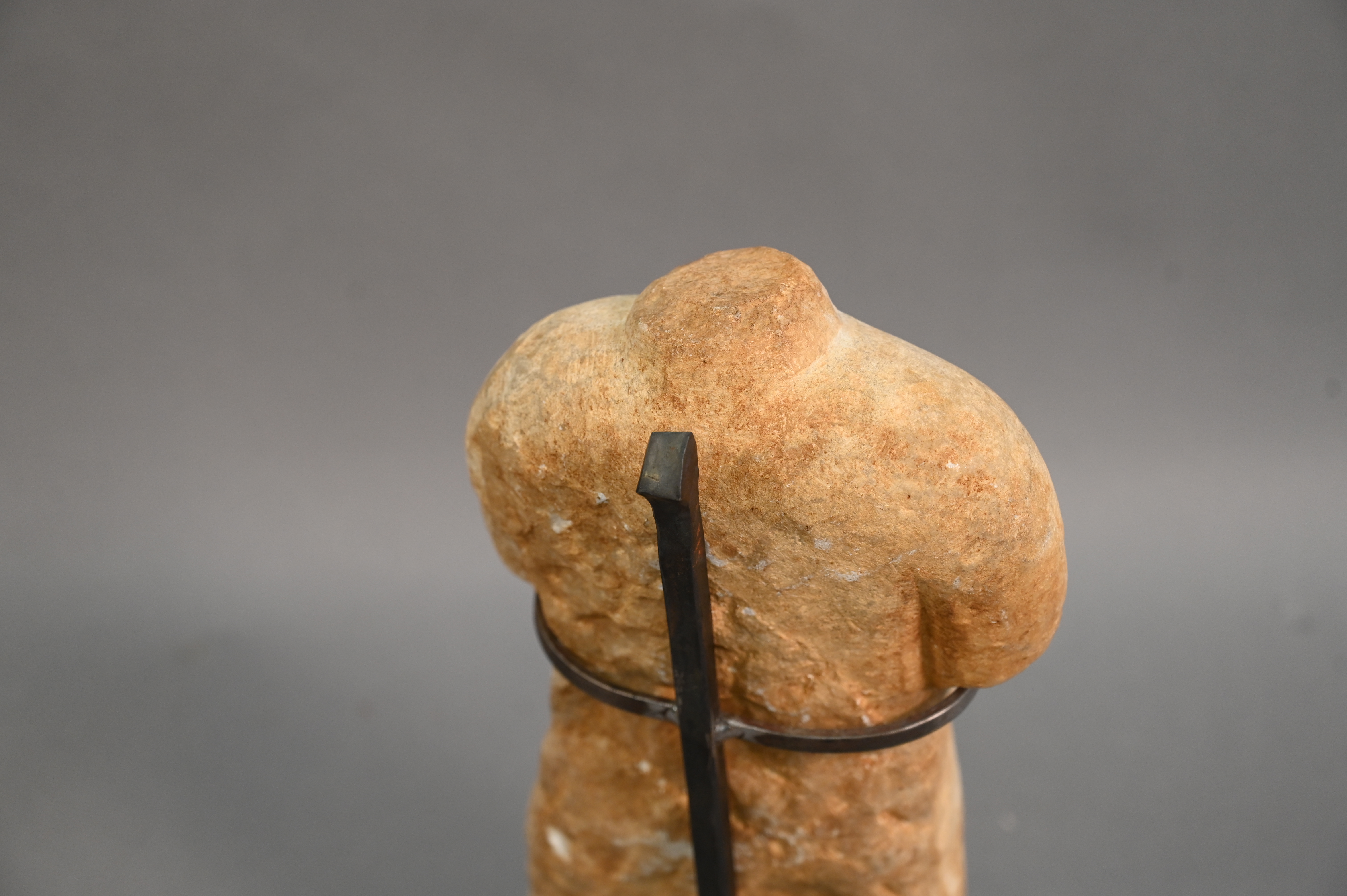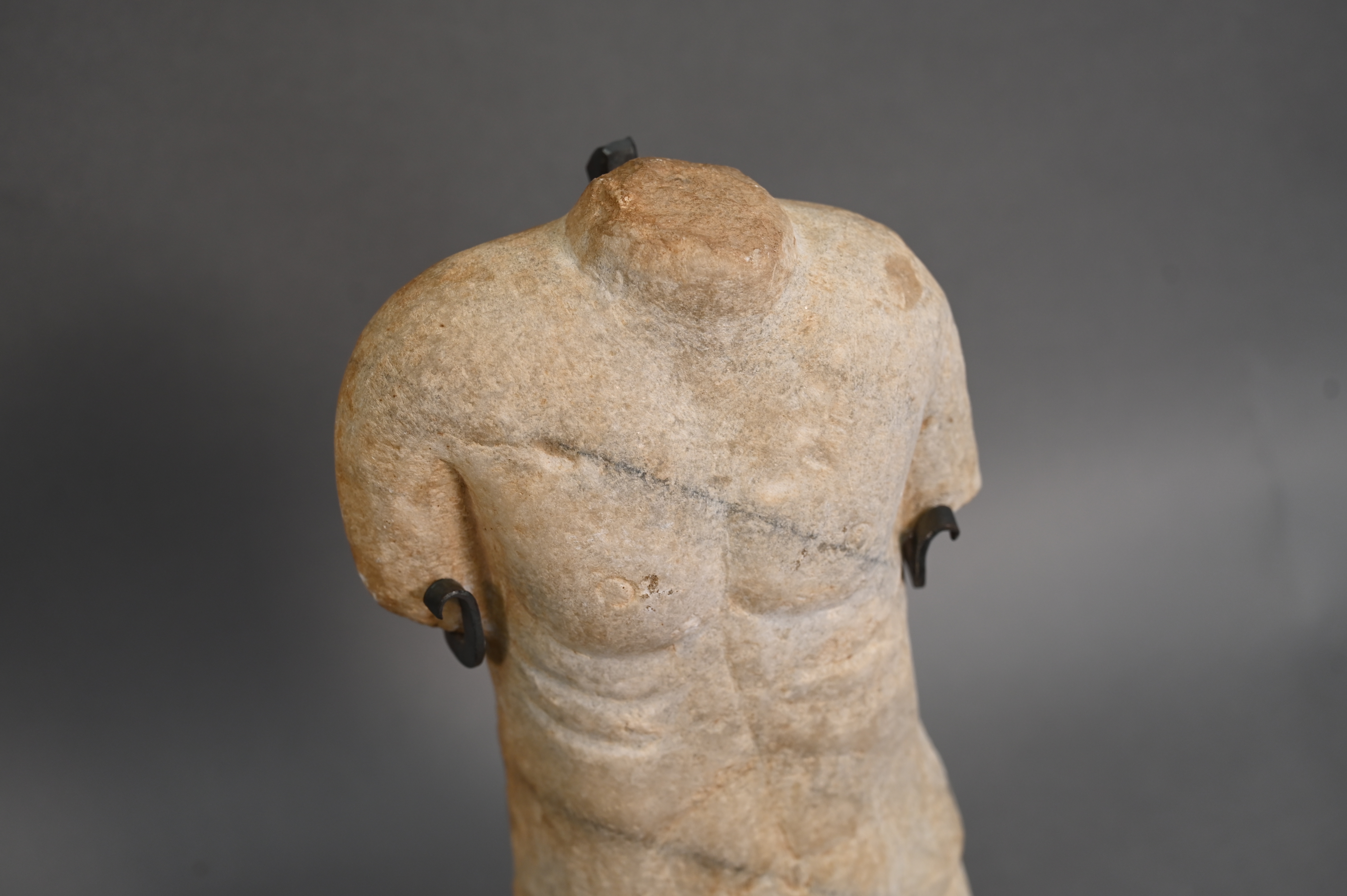 Marble Torso of Adonis, having a custom iron stand, purchased in Baalbek Lebanon at the site of the cult of Adonis in 1969, height 15 inches.