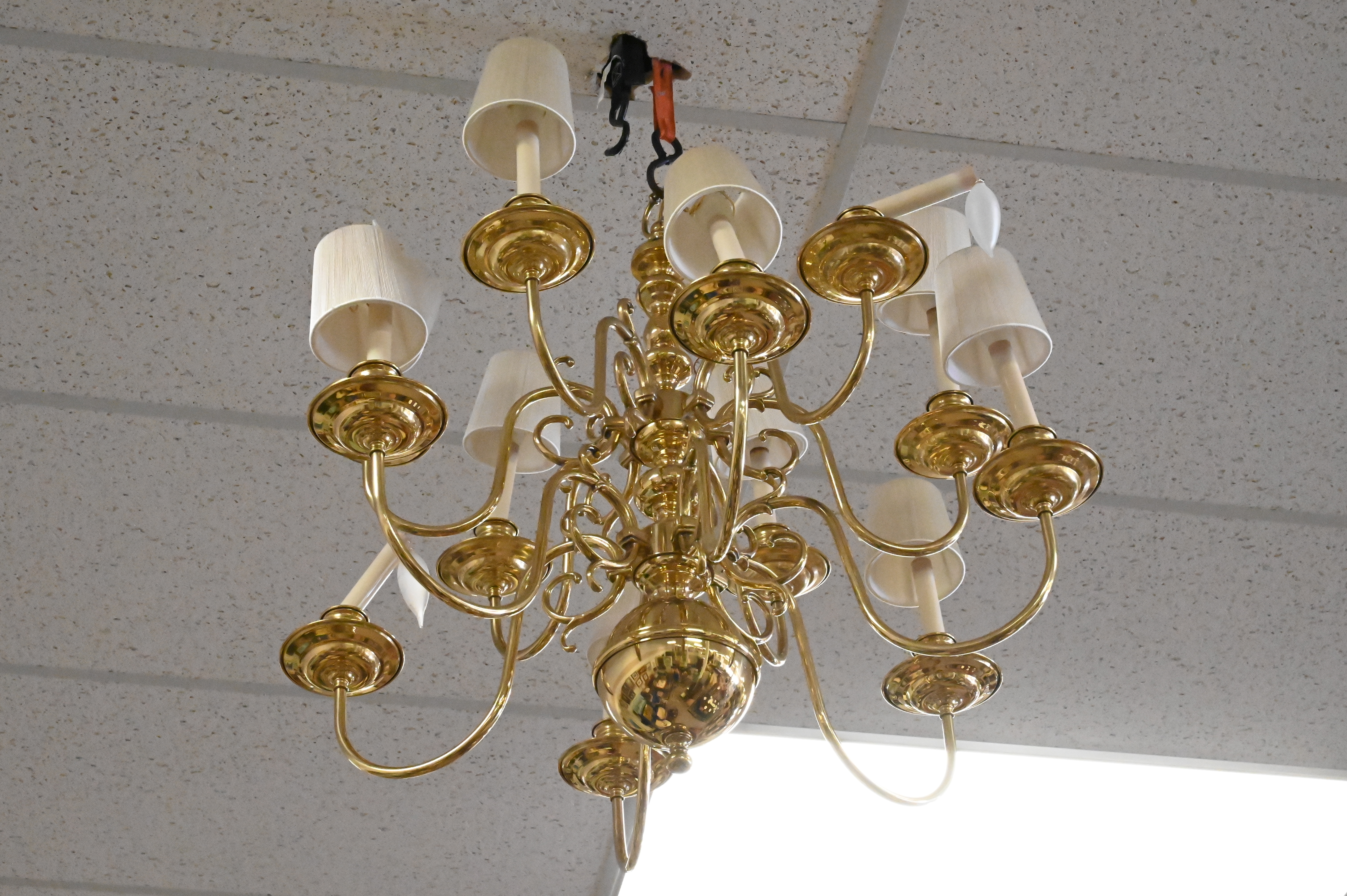 12 Light Brass Chandelier, having scrolled arms, approximate height 30 inches, approximate diameter 32 inches.