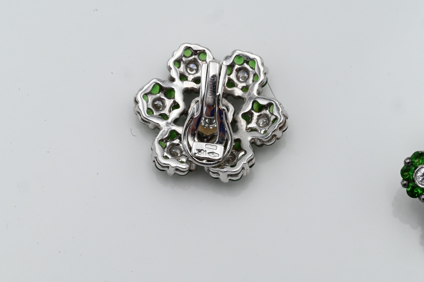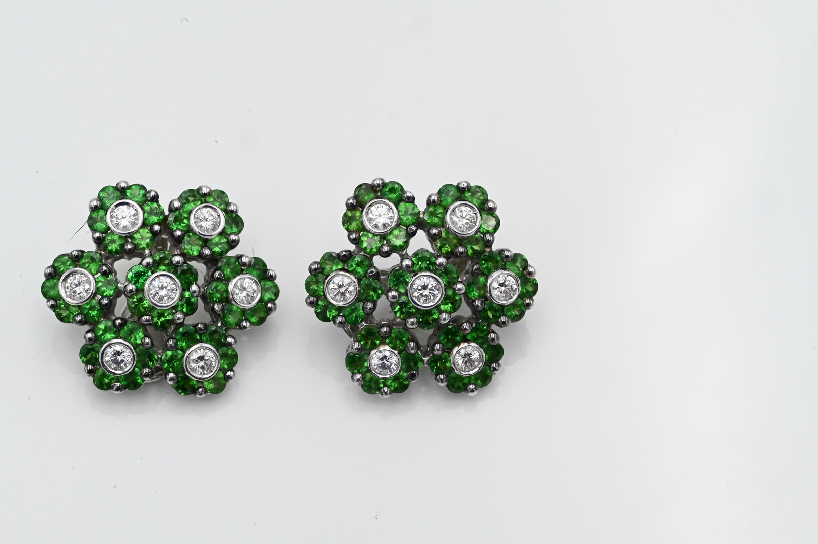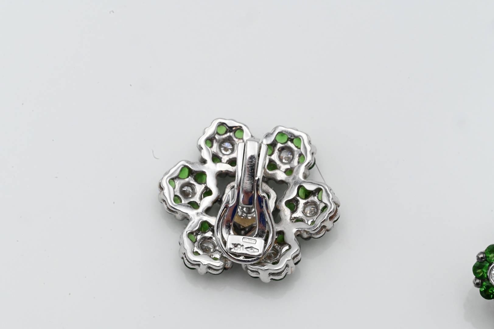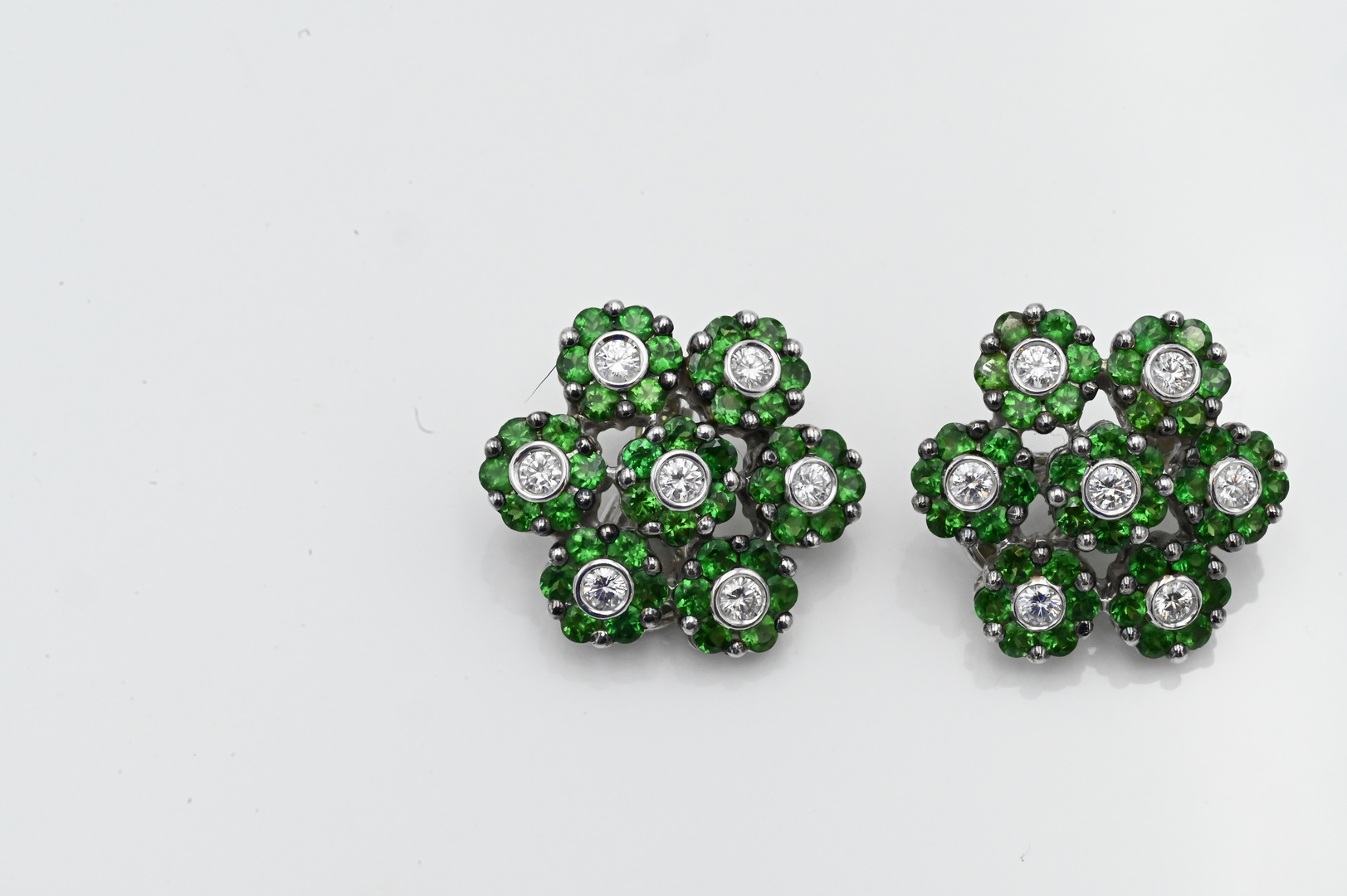 18 Karat White Gold Earrings having seven wheels set with green stones, centered with diamonds diameter 1 inch, 16.5 grams Condition: good condition, marked 18K 750