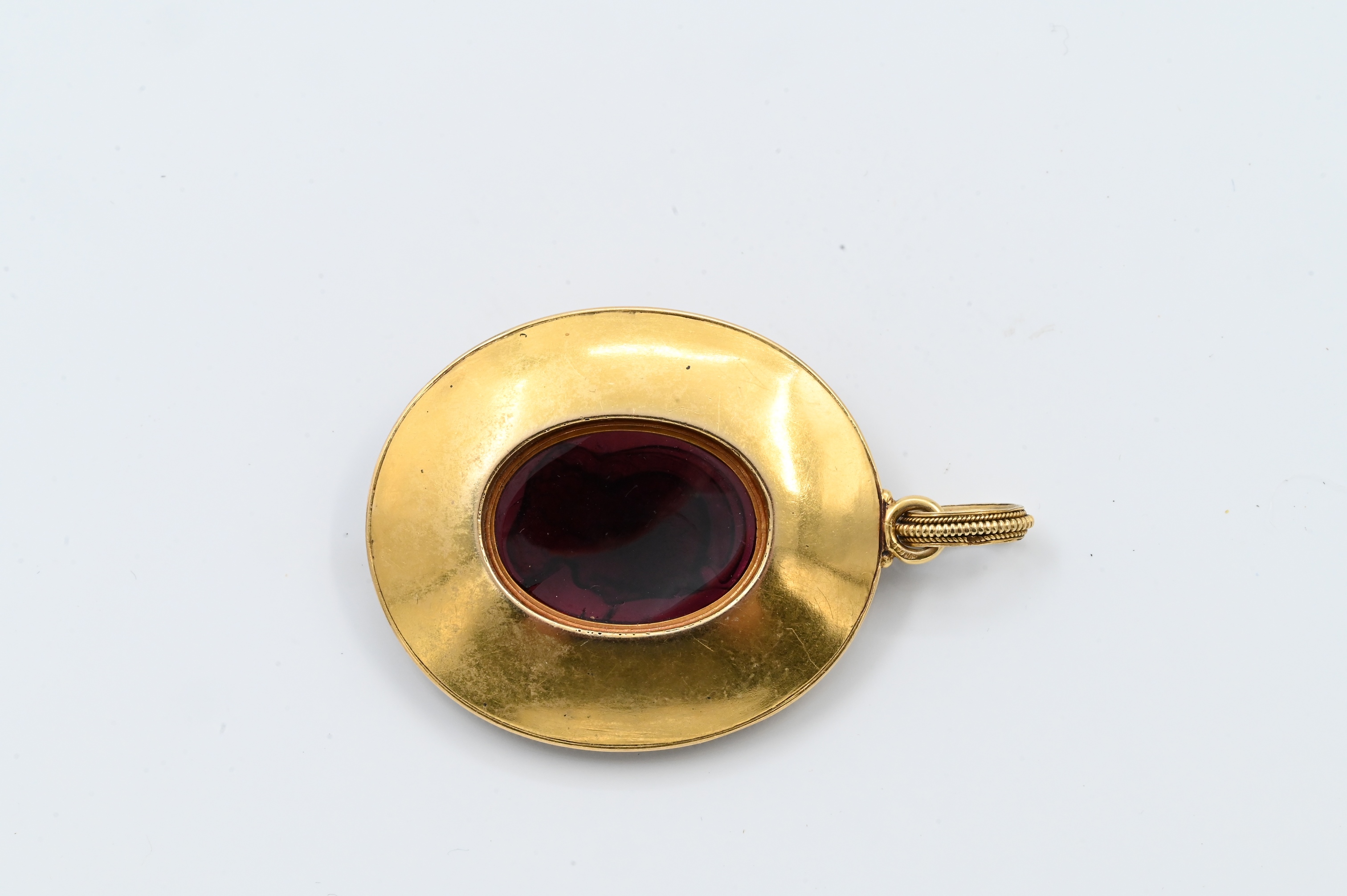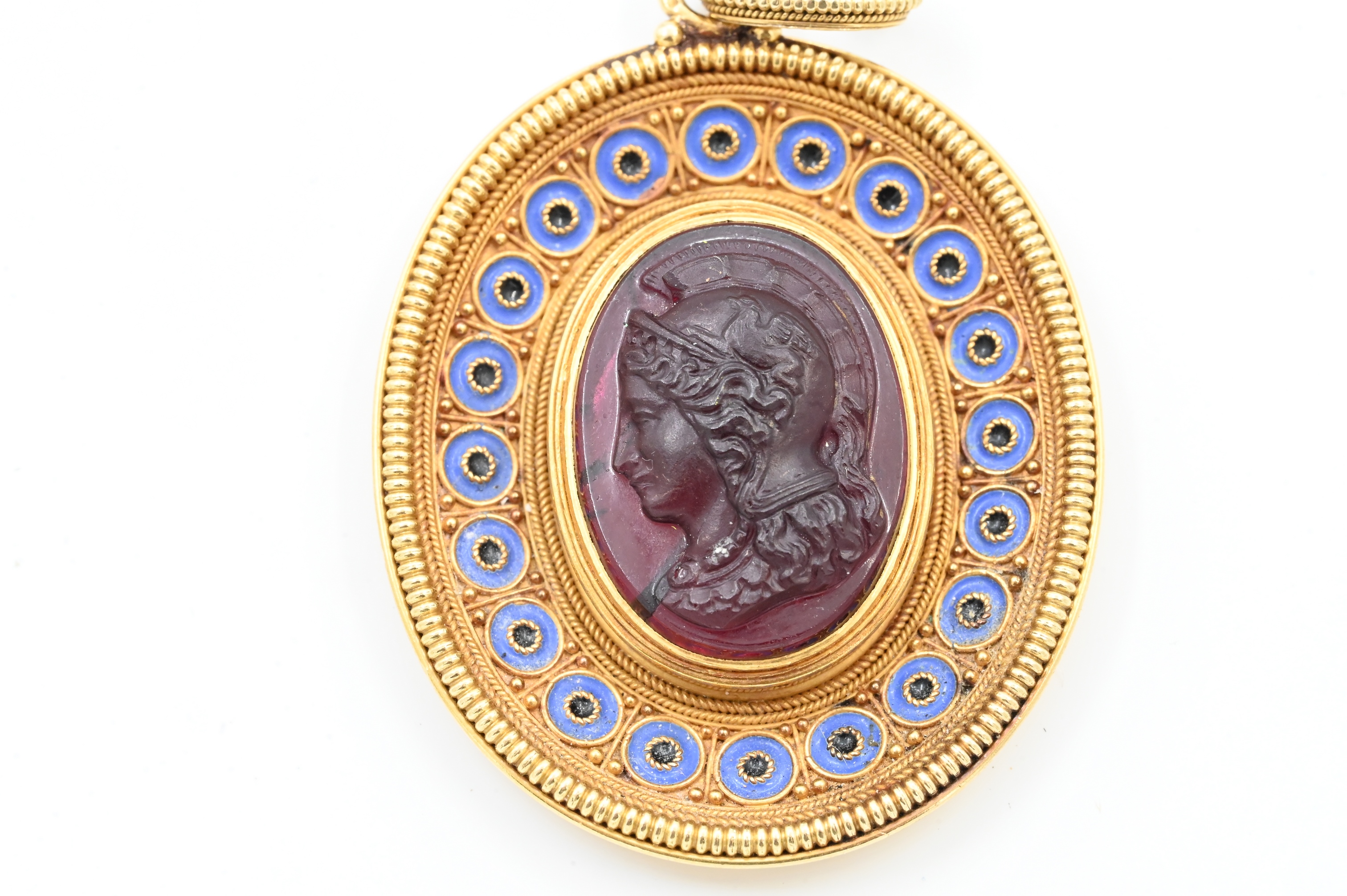 cameo of a Roman soldier on amethyst surrounded by blue and black circle enamel