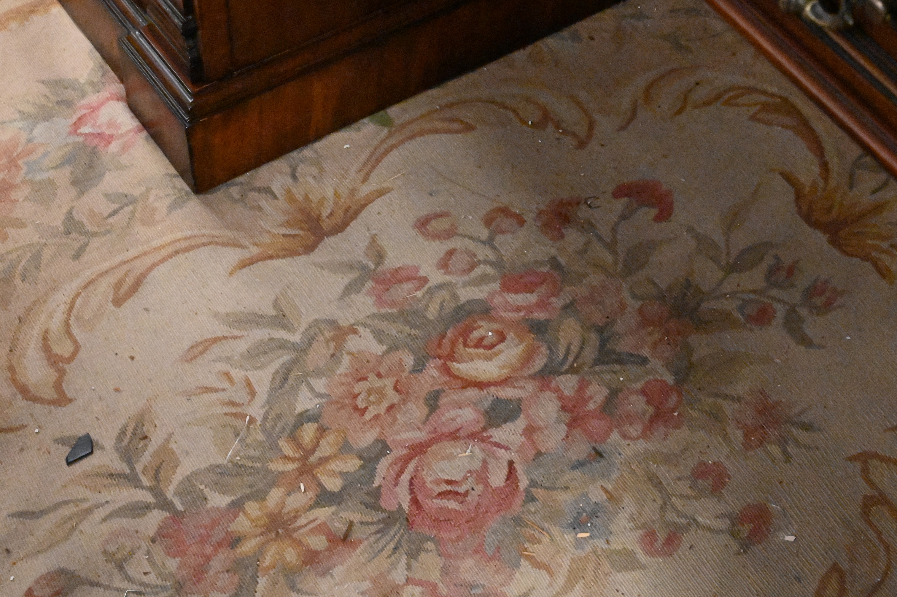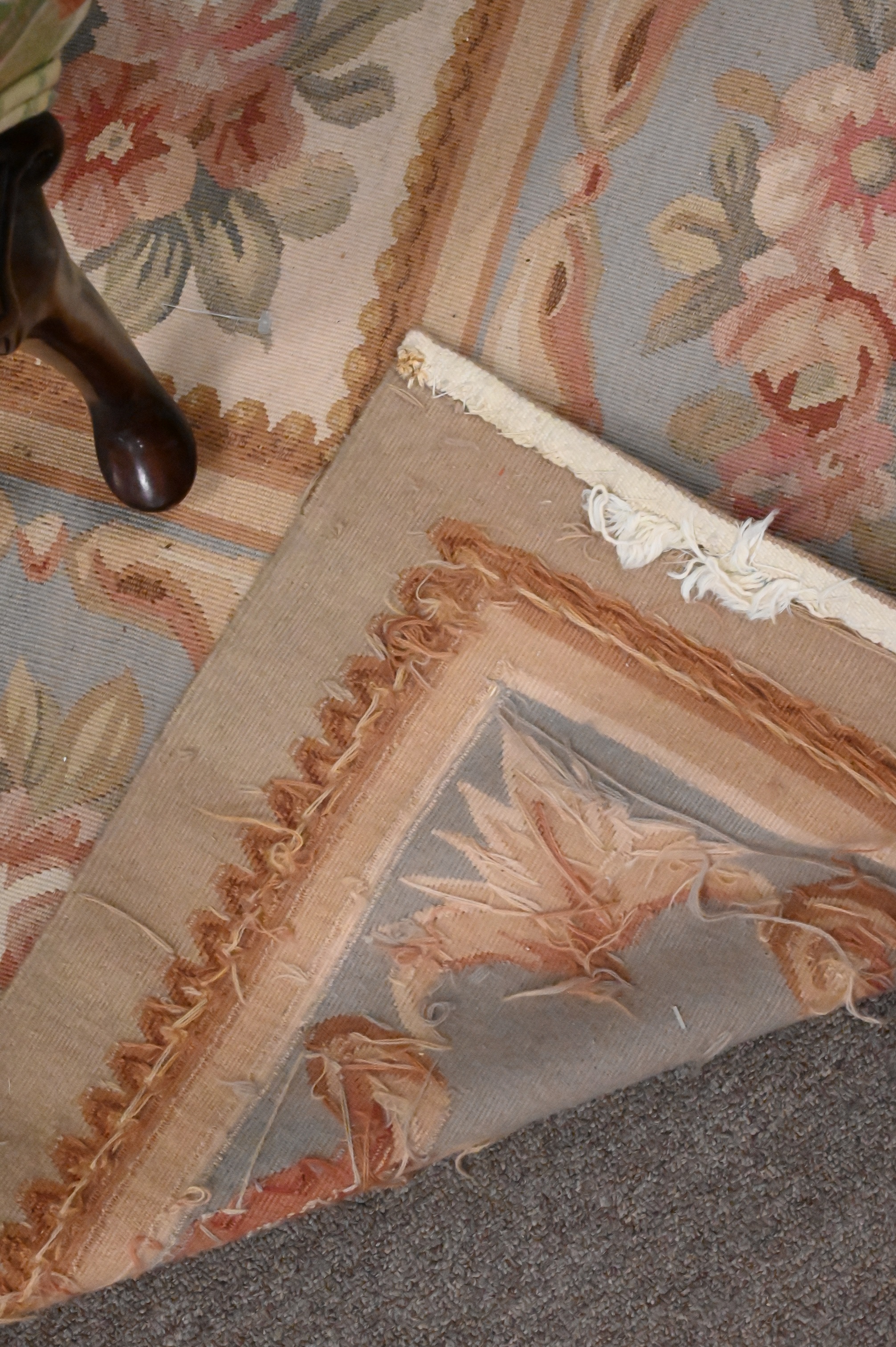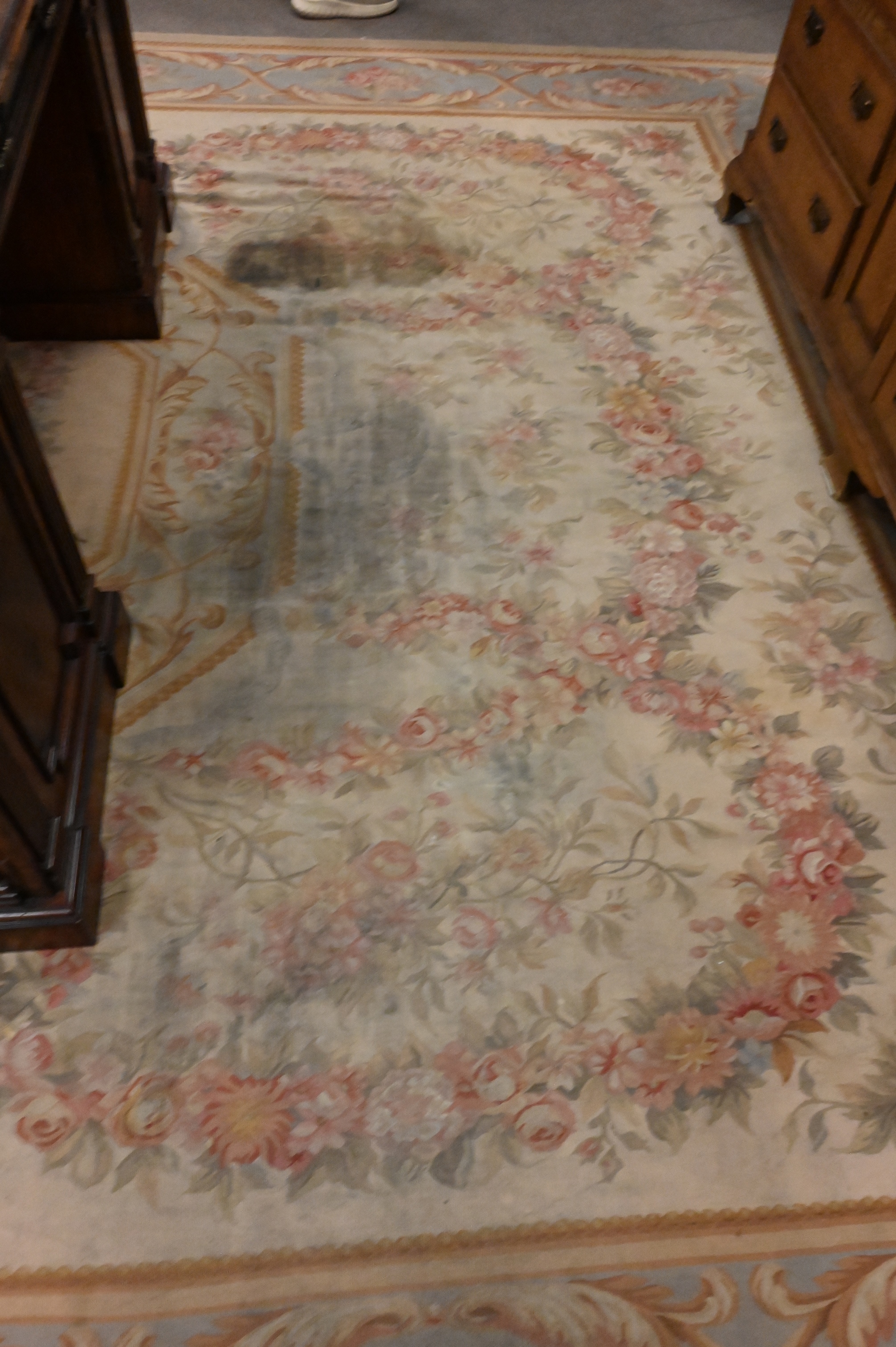 Aubusson Style Room Size Rug, 11′ 8″ x 18′, large area with staining (2′ x 8′ area)