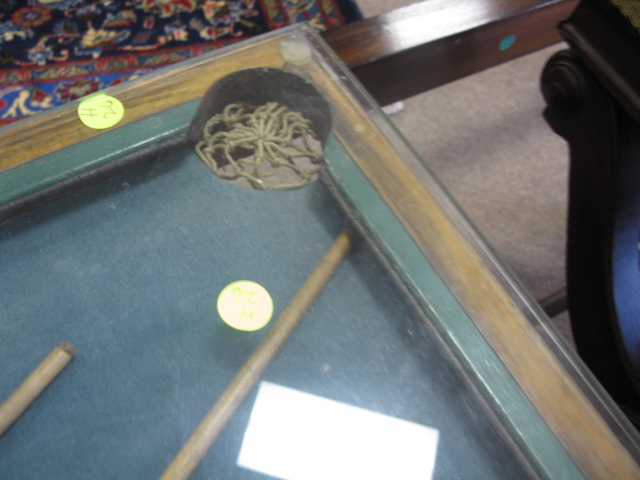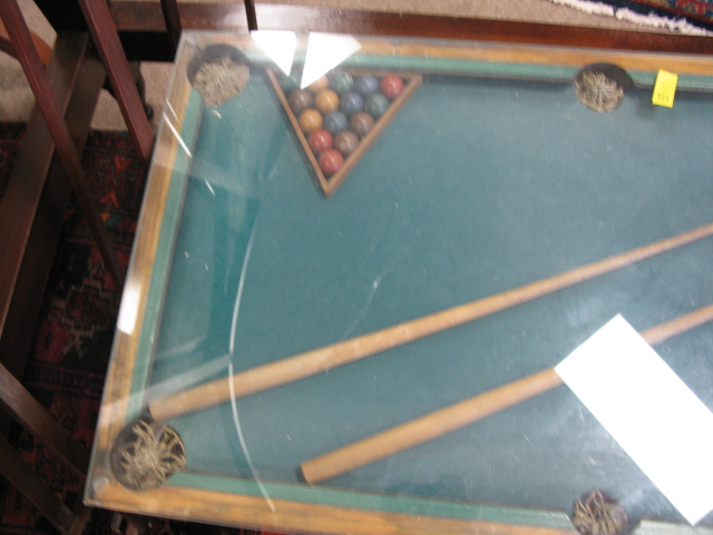 Child’s size pool table late 19th – early 20th century with sticks and balls.