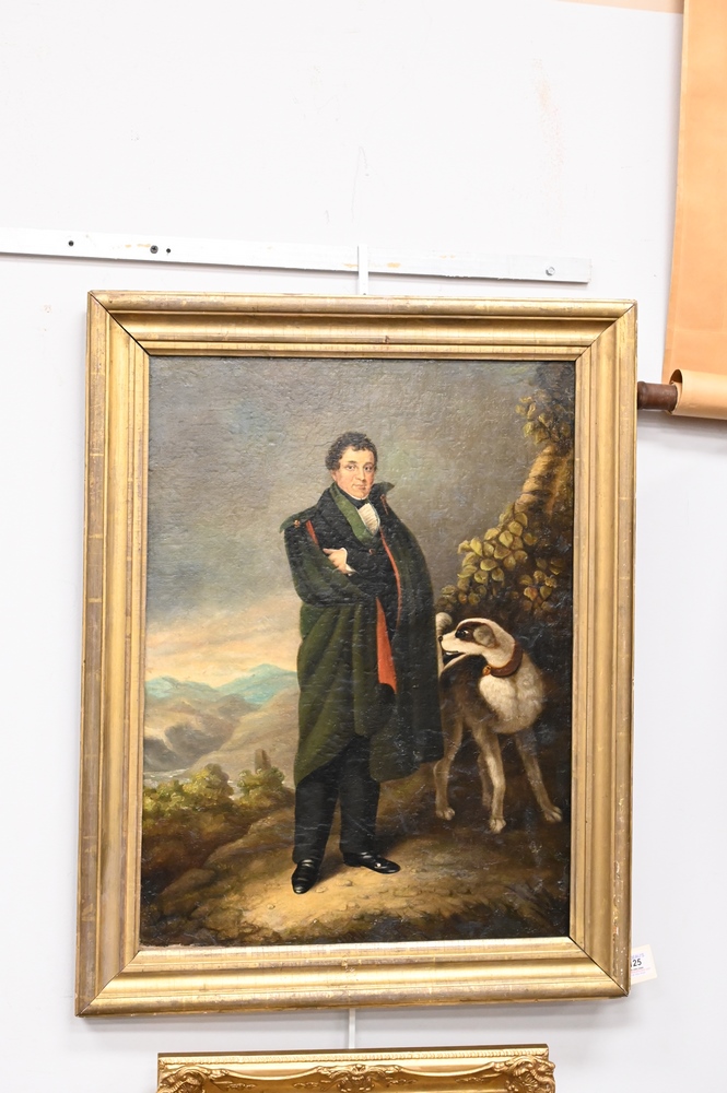 Lot 125: English School, 19th century, portrait of Daniel O’Connell, circa 1840, full length portrait accompanied by white hound, oil on canvas, sight size 24″ x 18″. Provenance: Christie’s East (New York) sale #7831, 1/9/96, lot 165.