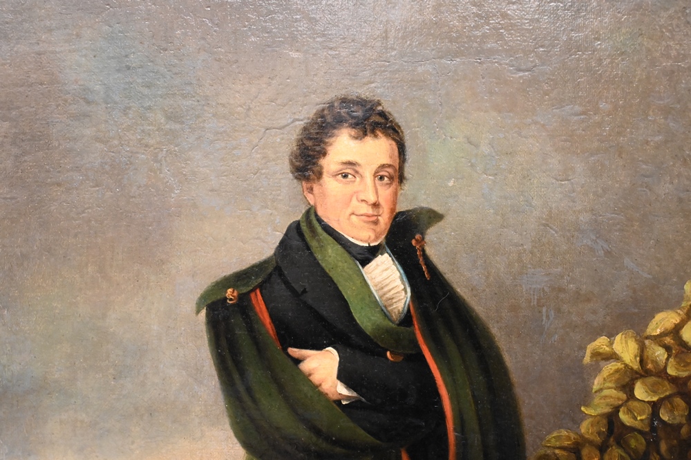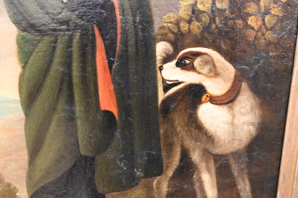English School, 19th century, portrait of Daniel O’Connell, circa 1840, full length portrait accompanied by white hound, oil on canvas, sight size 24″ x 18″. Provenance: Christie’s East (New York) sale #7831, 1/9/96, lot 165.