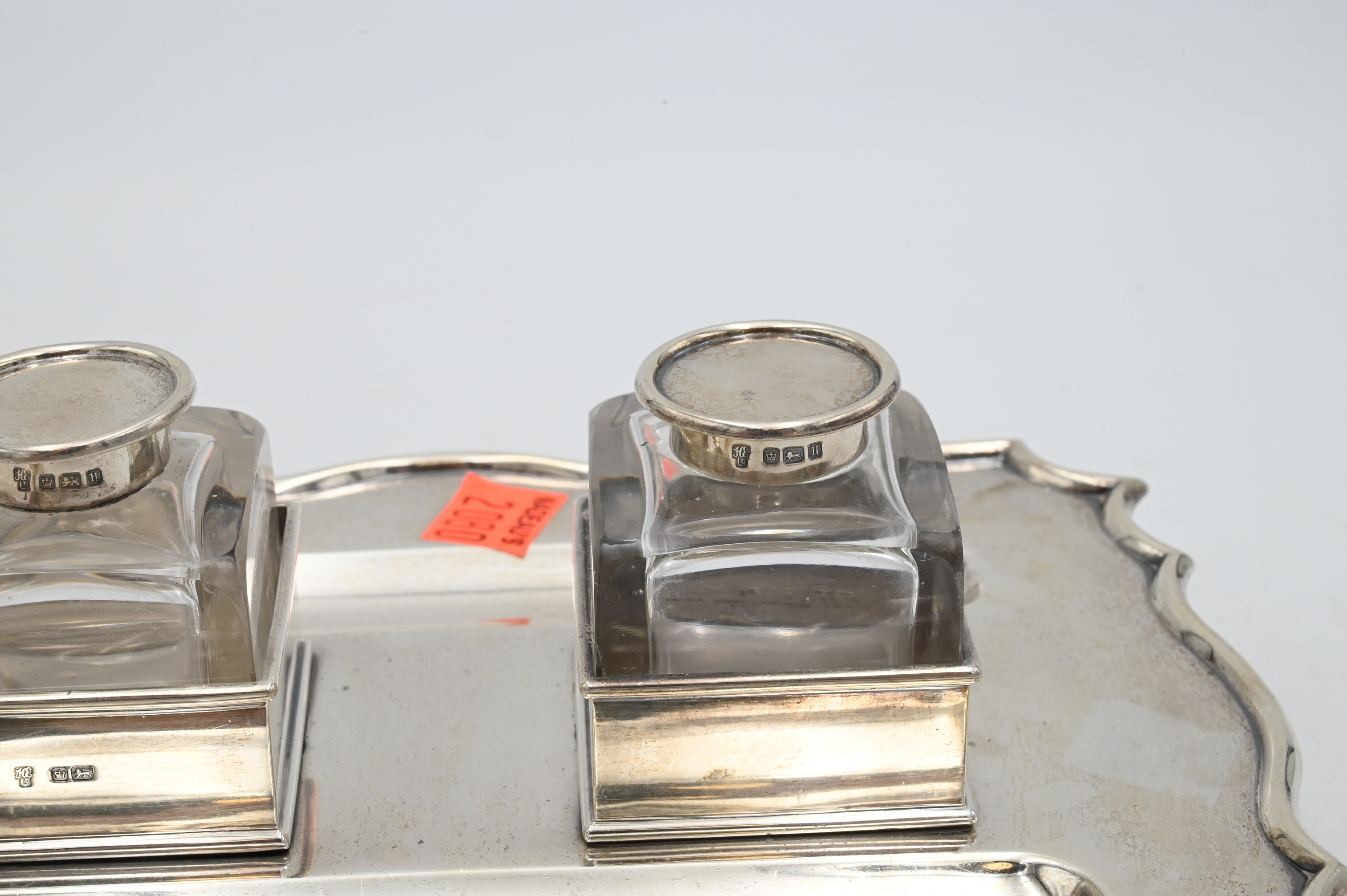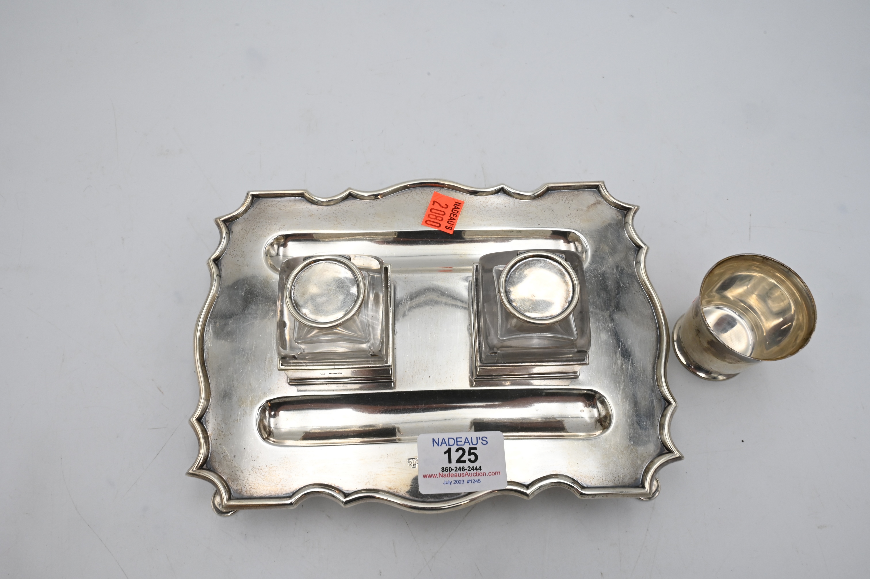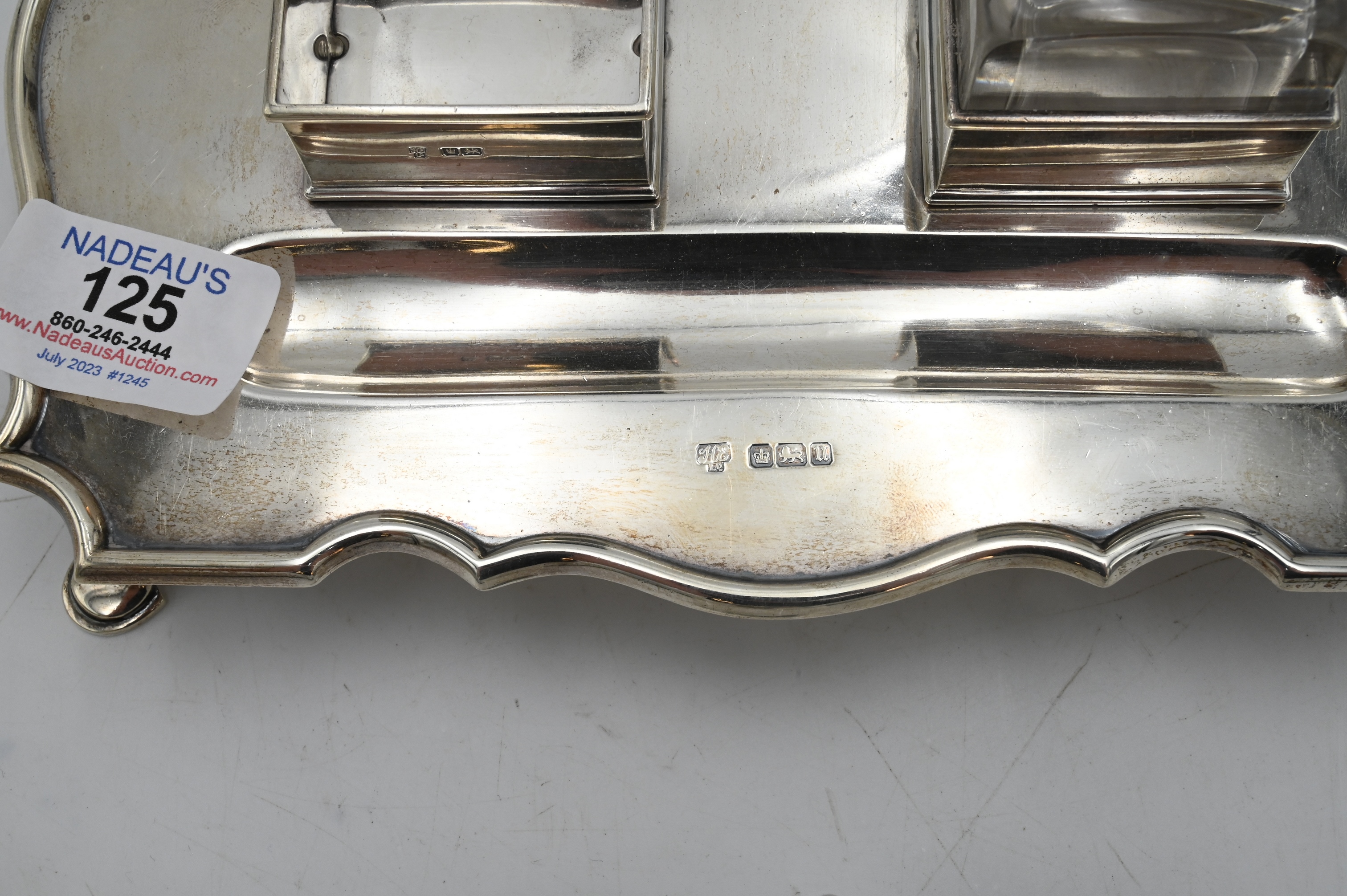English Sterling Silver Ink Set, to include two crystal inkwells set on four feet, height 3 inches, tray top 6 1/2″ x 8 1/2″, 14.4 t.oz.