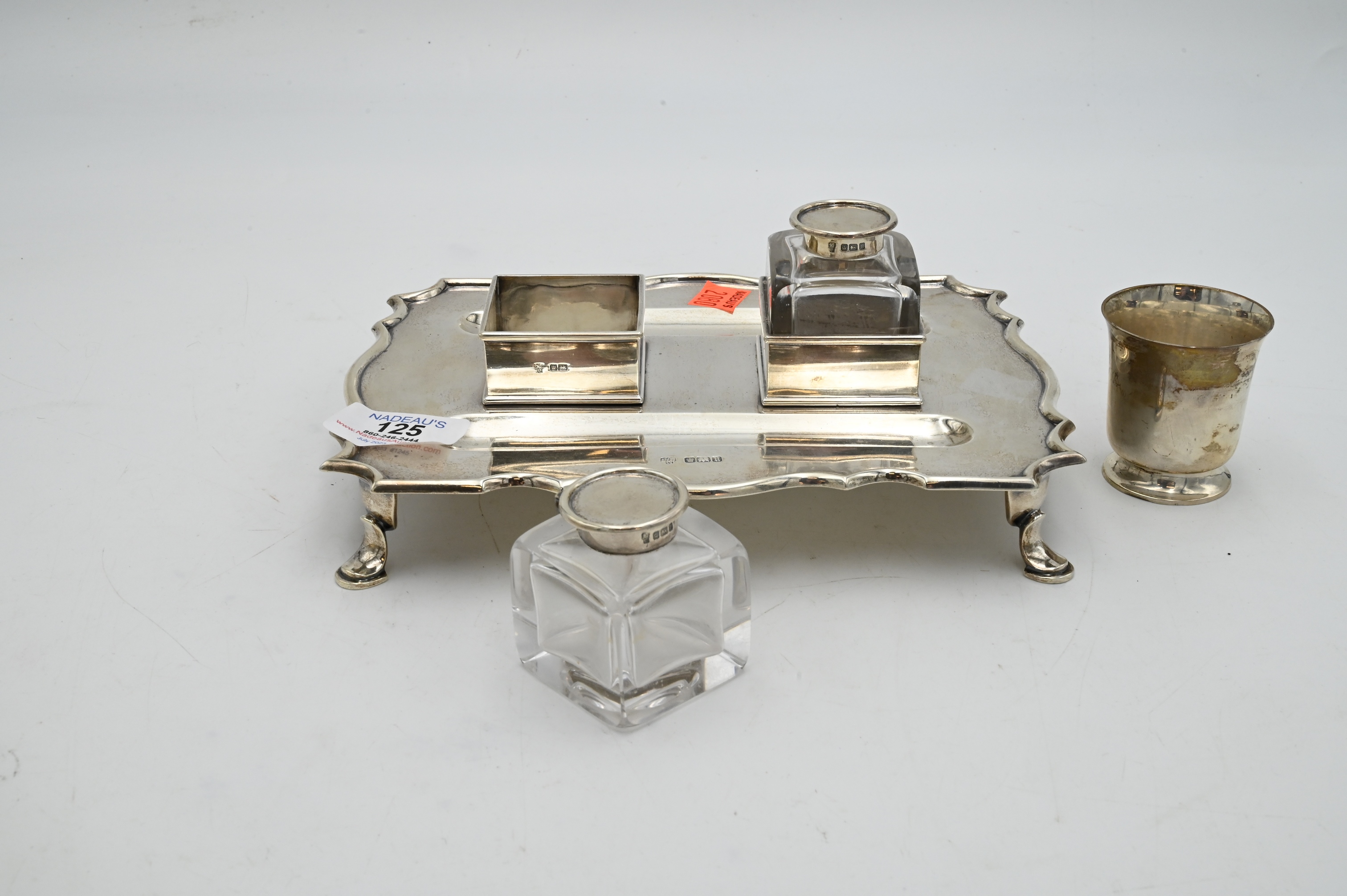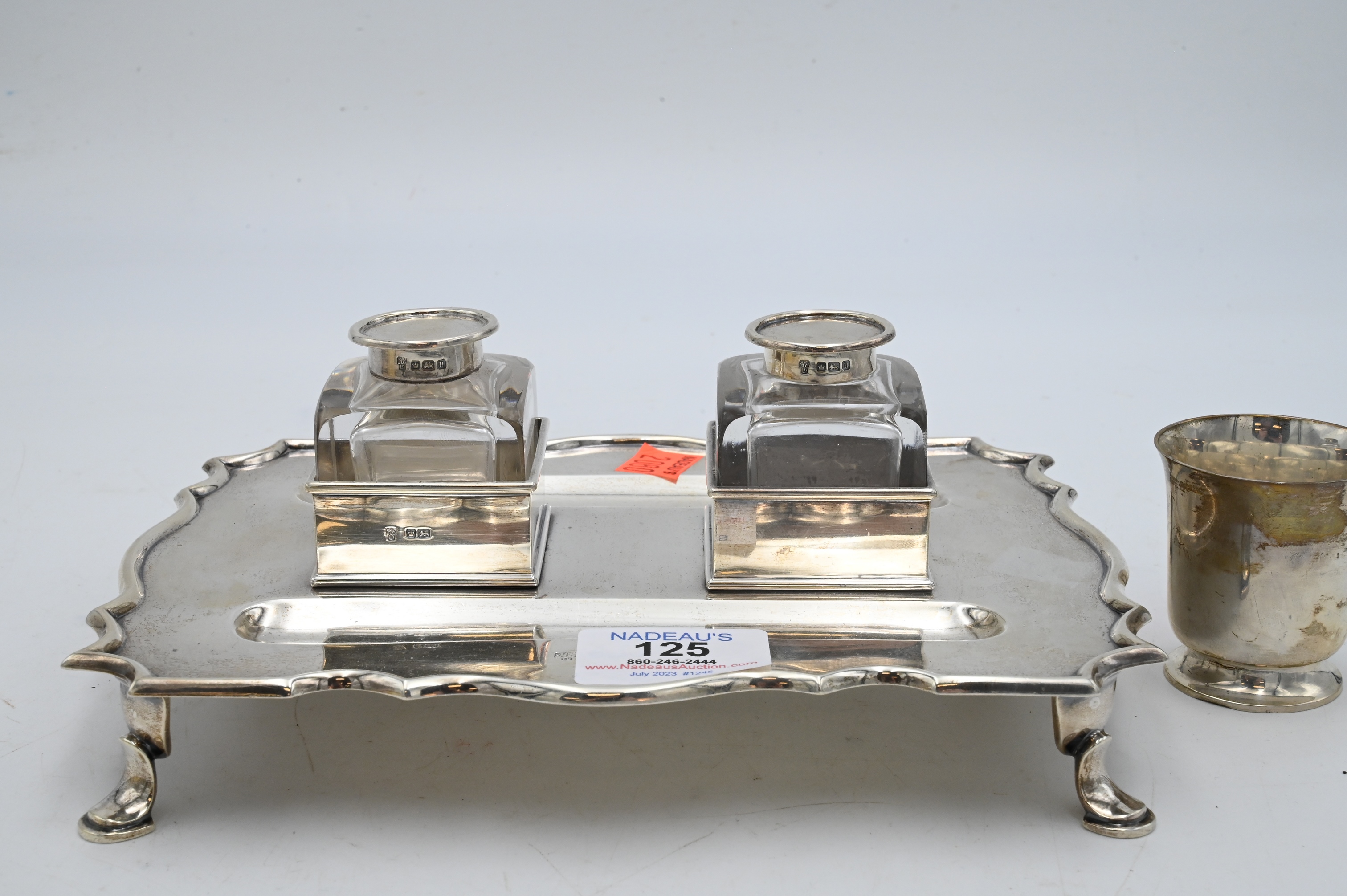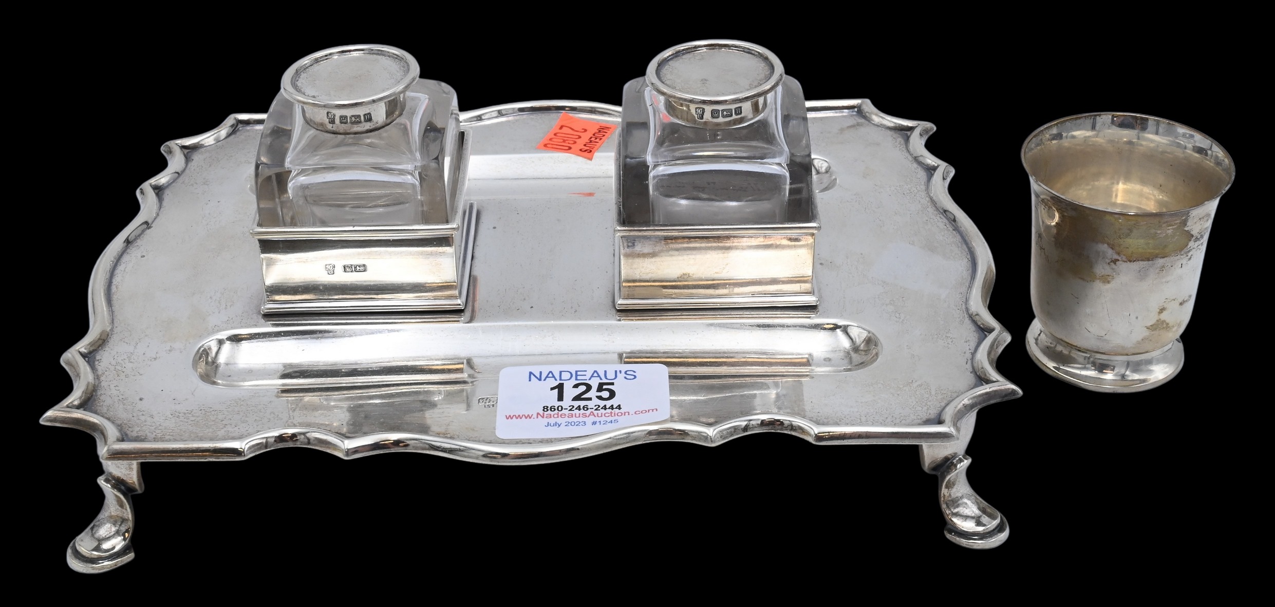 English Sterling Silver Ink Set, to include two crystal inkwells set on four feet, height 3 inches, tray top 6 1/2″ x 8 1/2″, 14.4 t.oz.