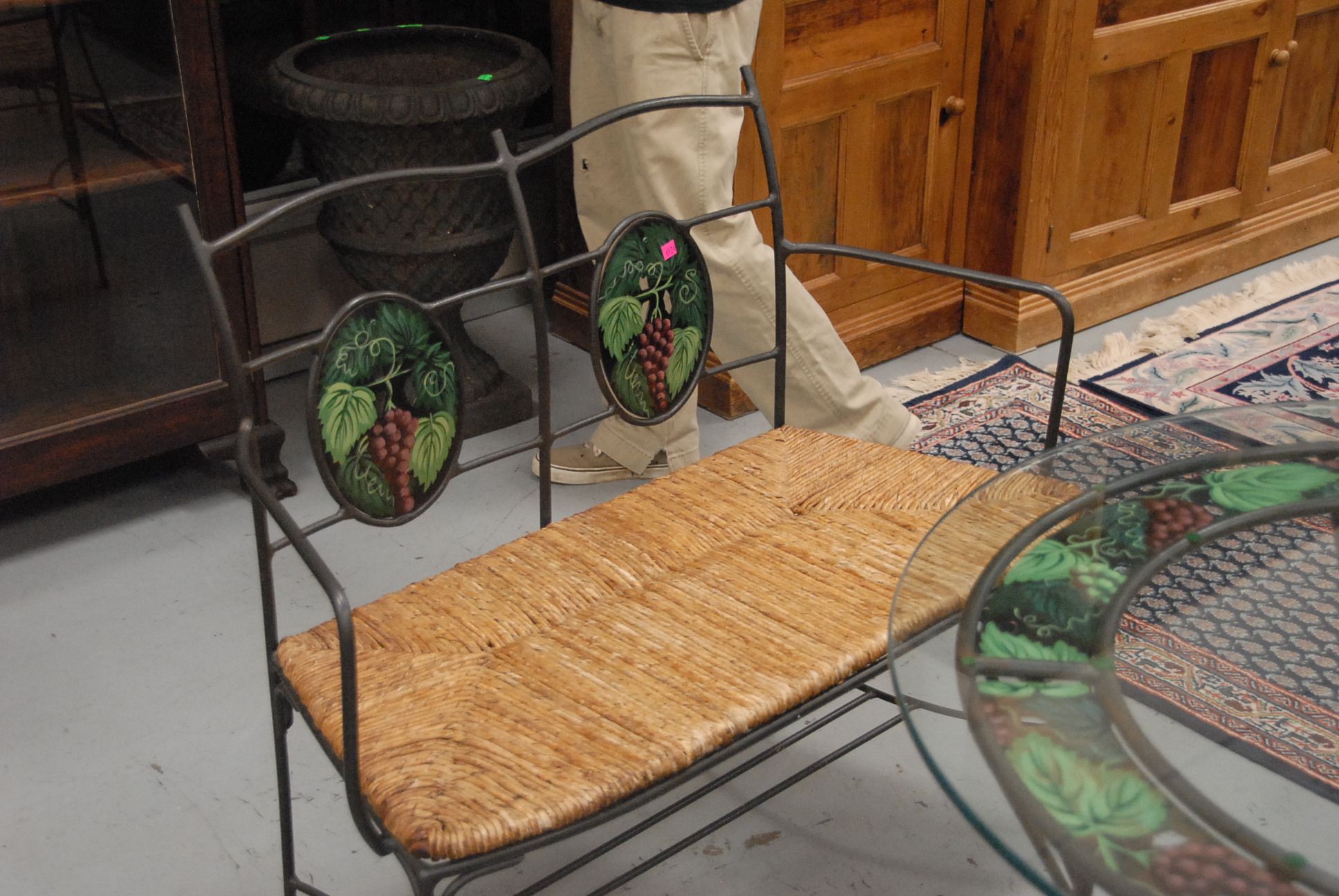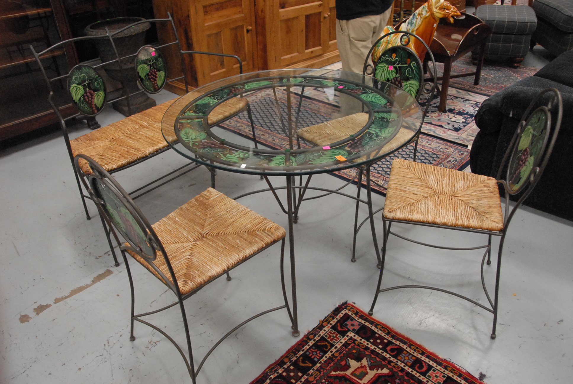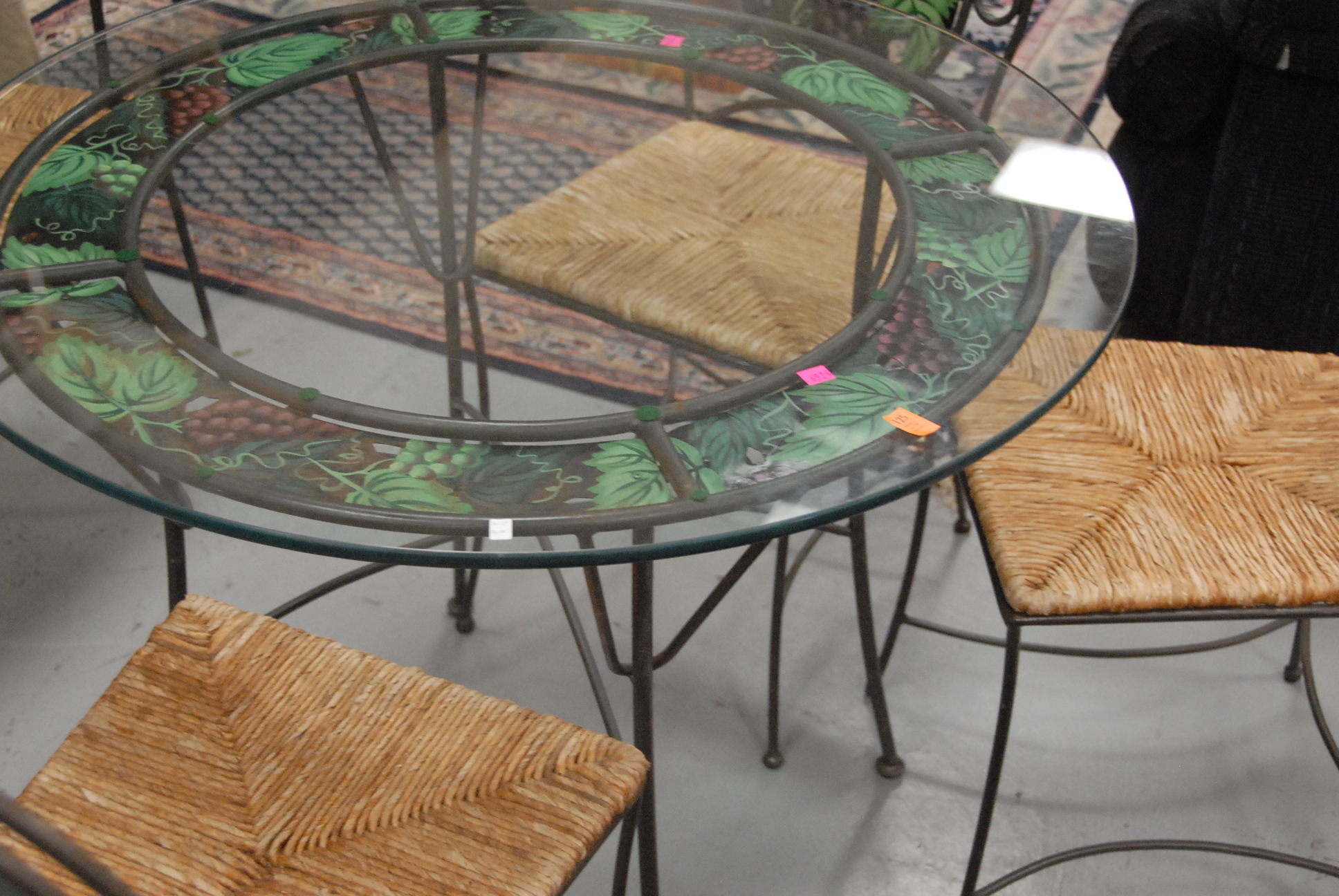 Lot 125: Five piece wrought iron set to include bench, three chairs, and round glass top table, all seats are woven rush in excellent condition.