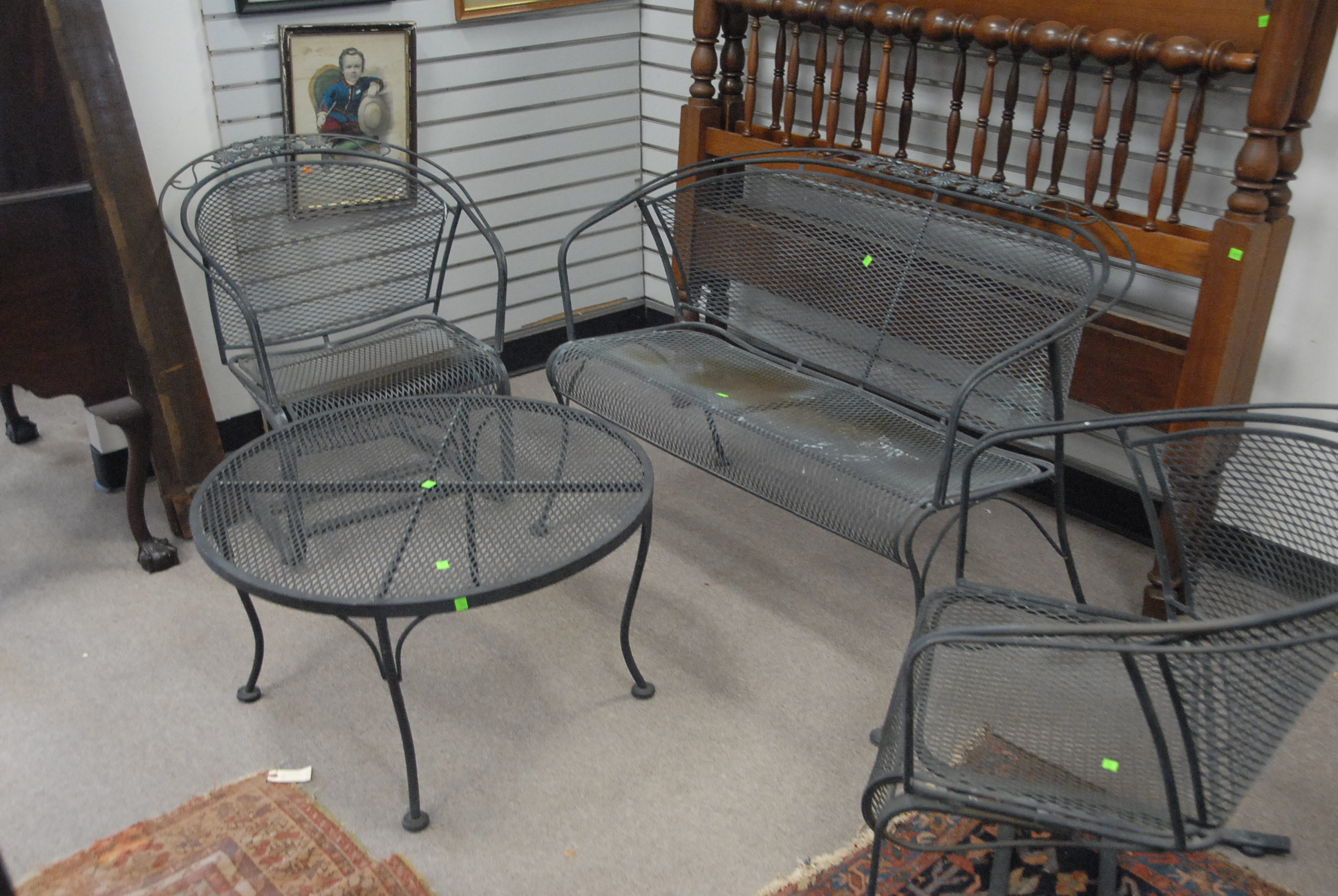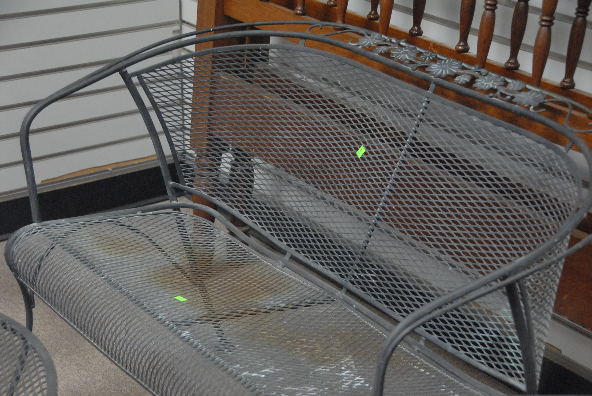 Four piece mesh metal outdoor set to include loveseat, two chairs, and round table.
