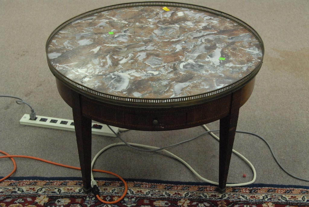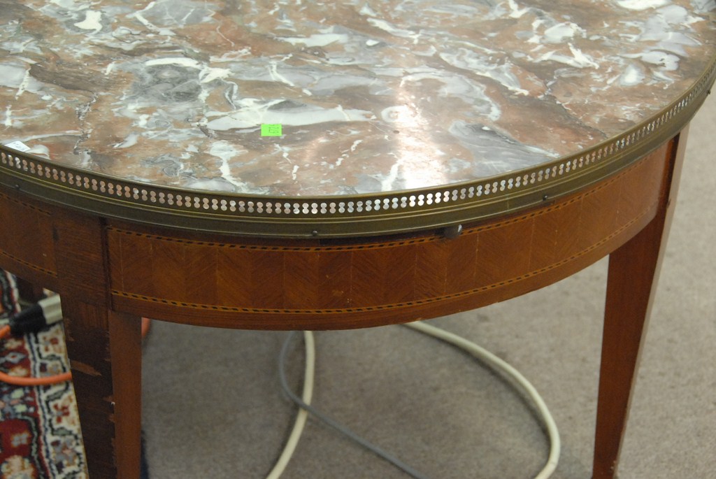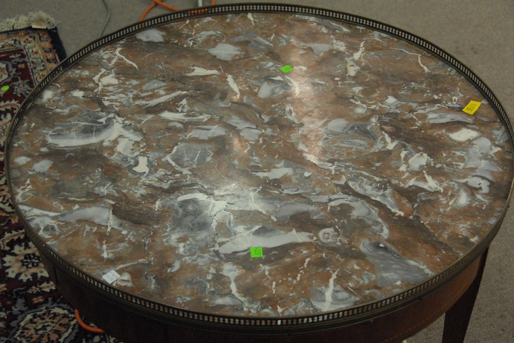 French style round mahogany marble top table with brass gallery, ht. 20 1/2in. dia. 32in.