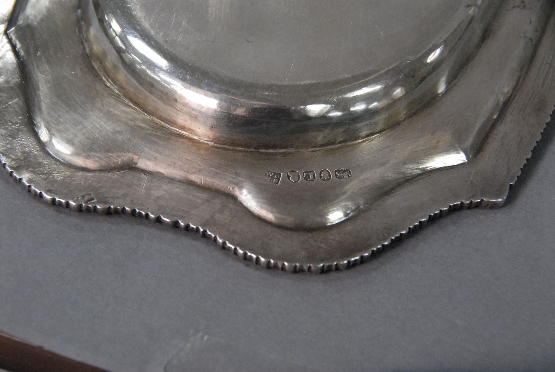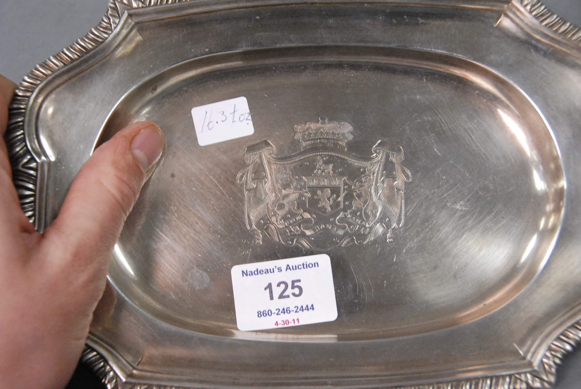 Georgian silver shaped tray with gadrooned border and coat of arms in middle.