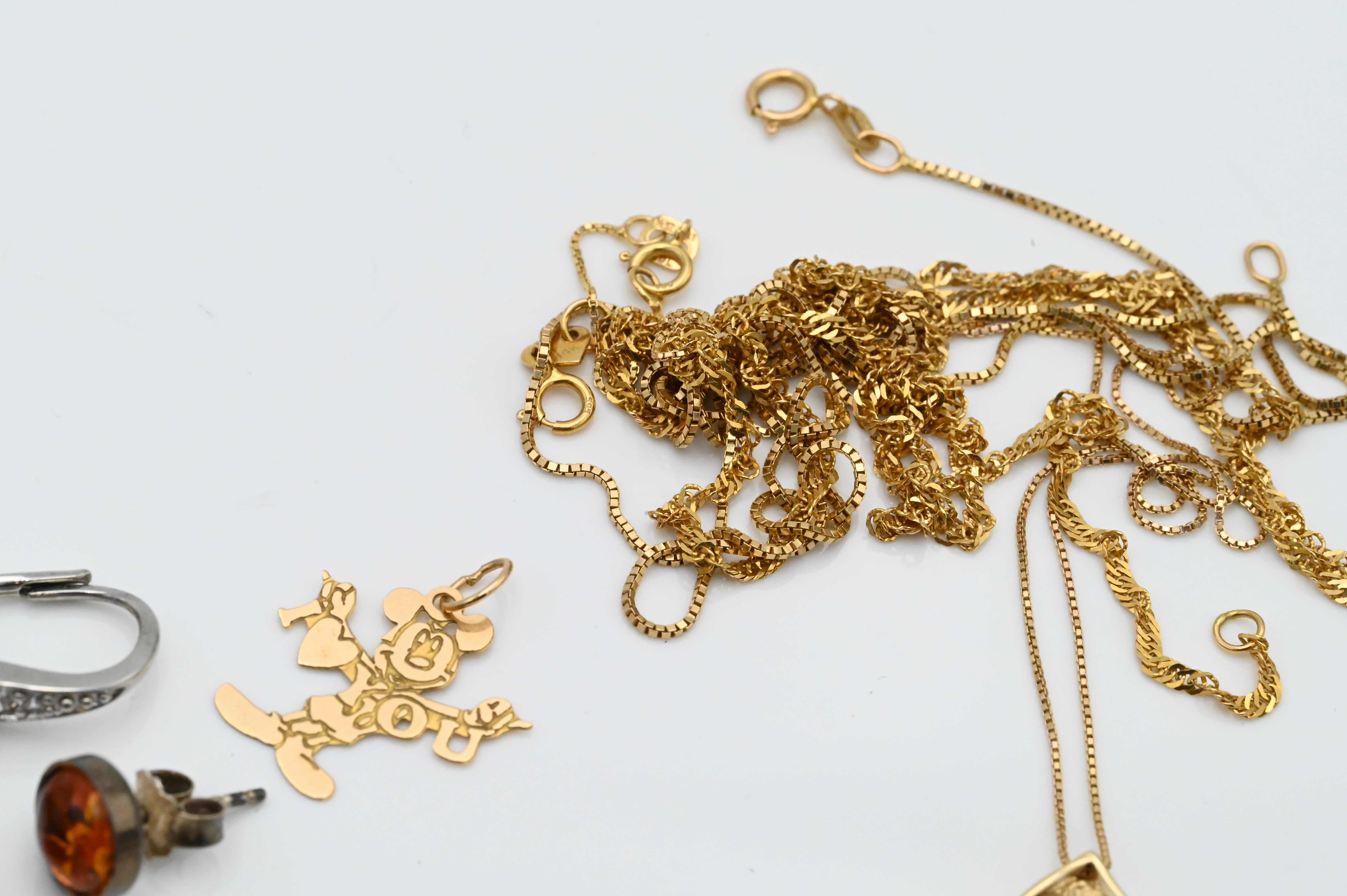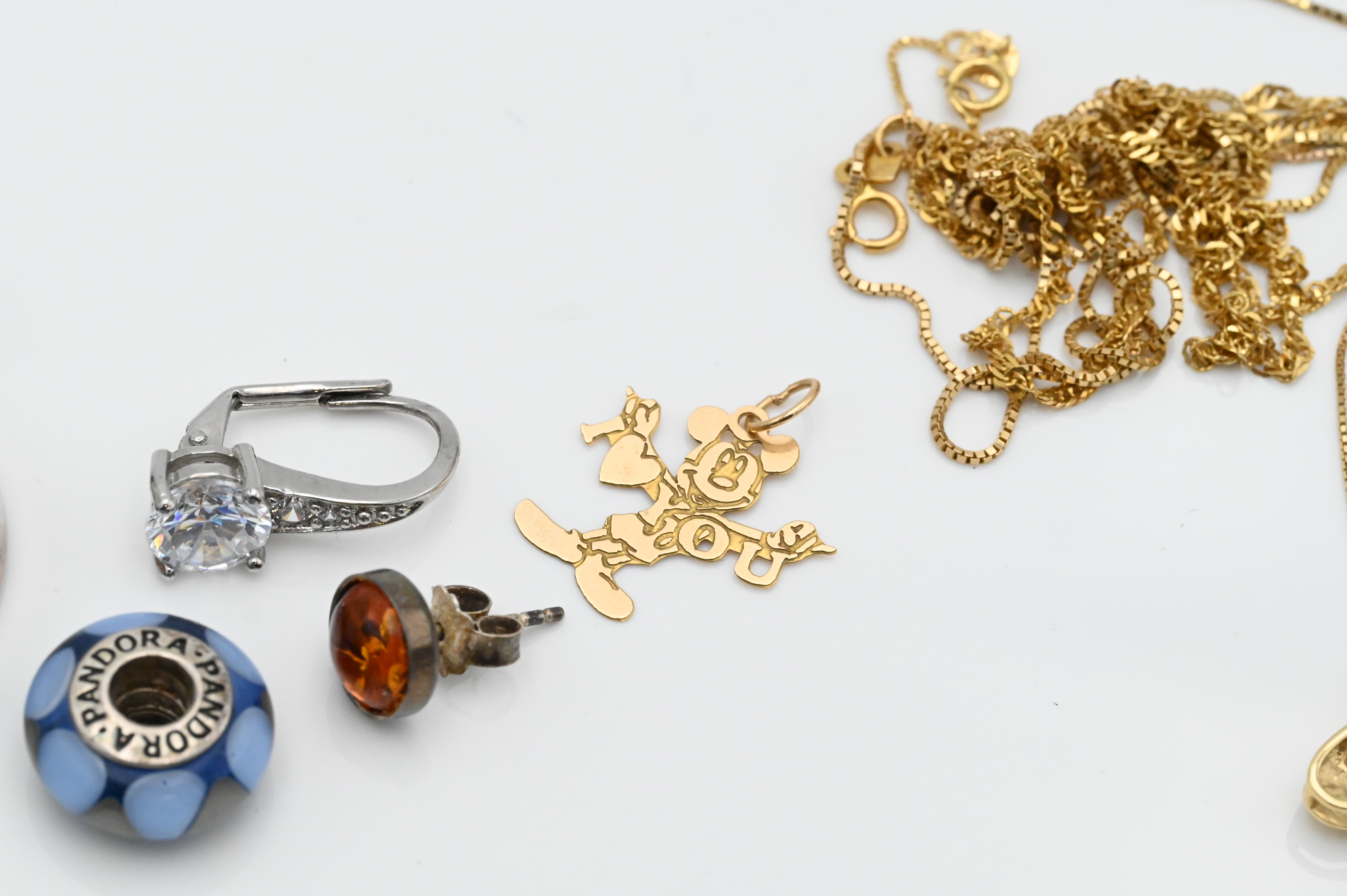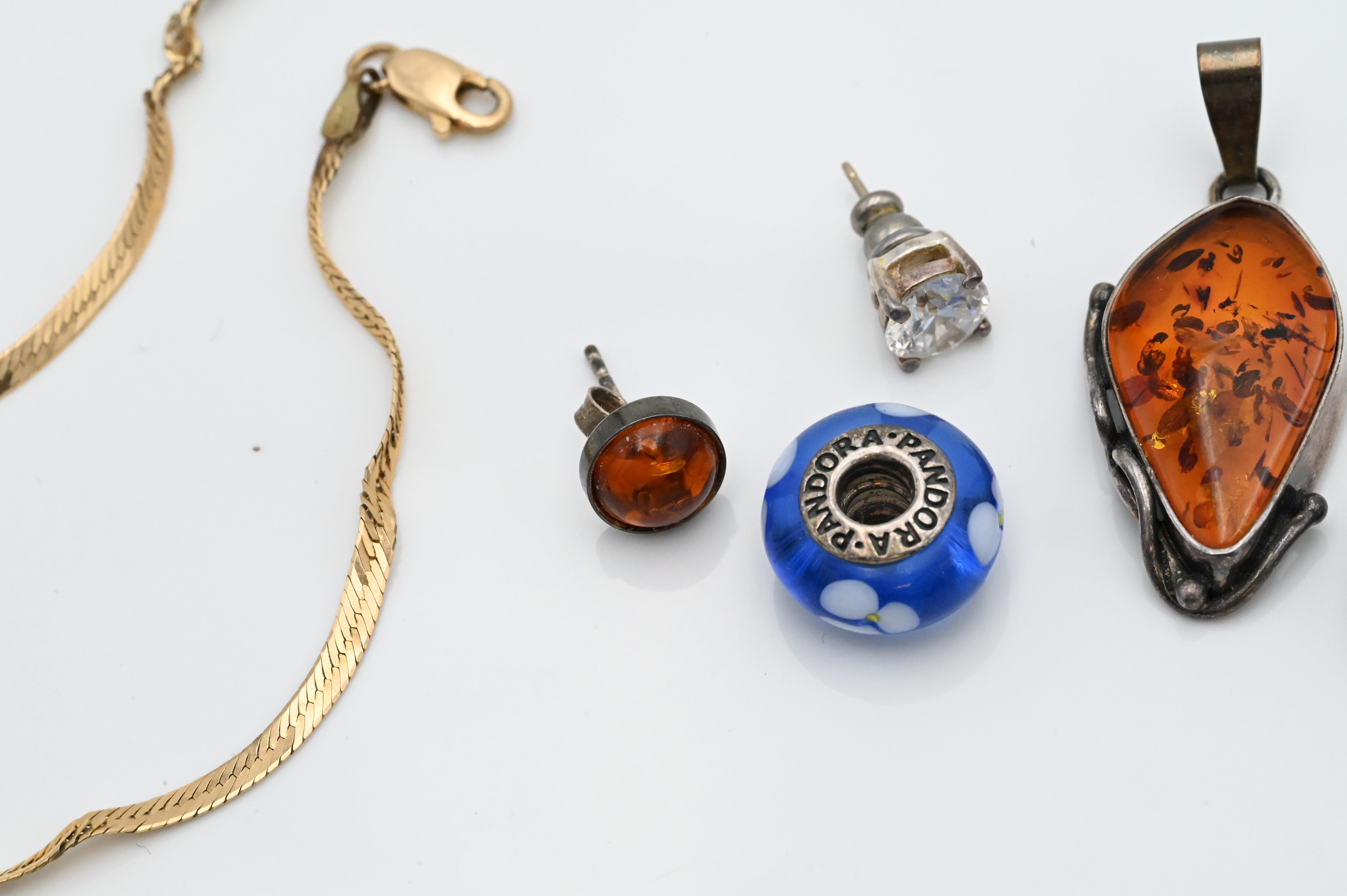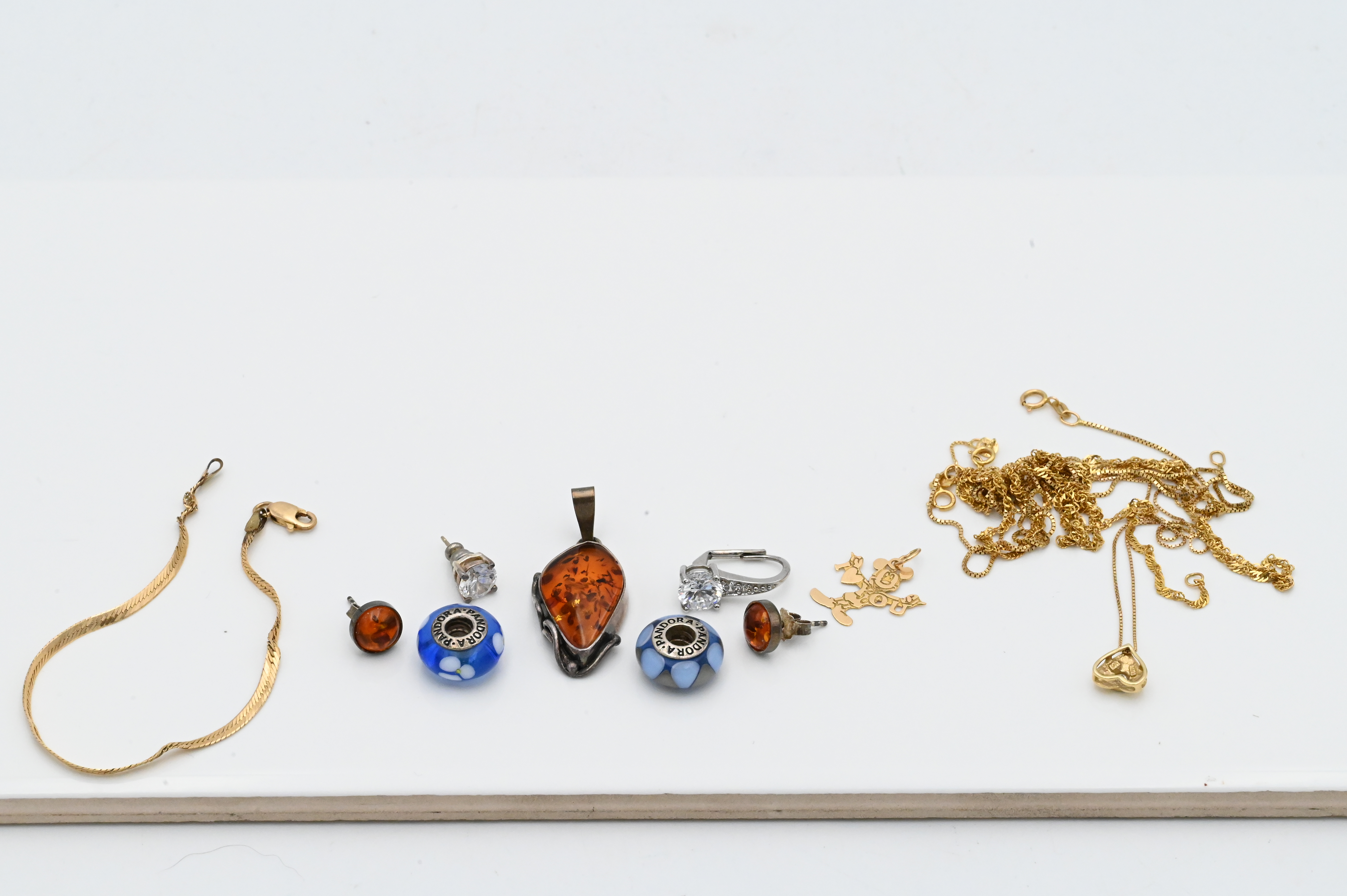 Lot of Miscellaneous Gold, to include an amber pendant and earrings, along with gold chains, along with two Pandora pieces.