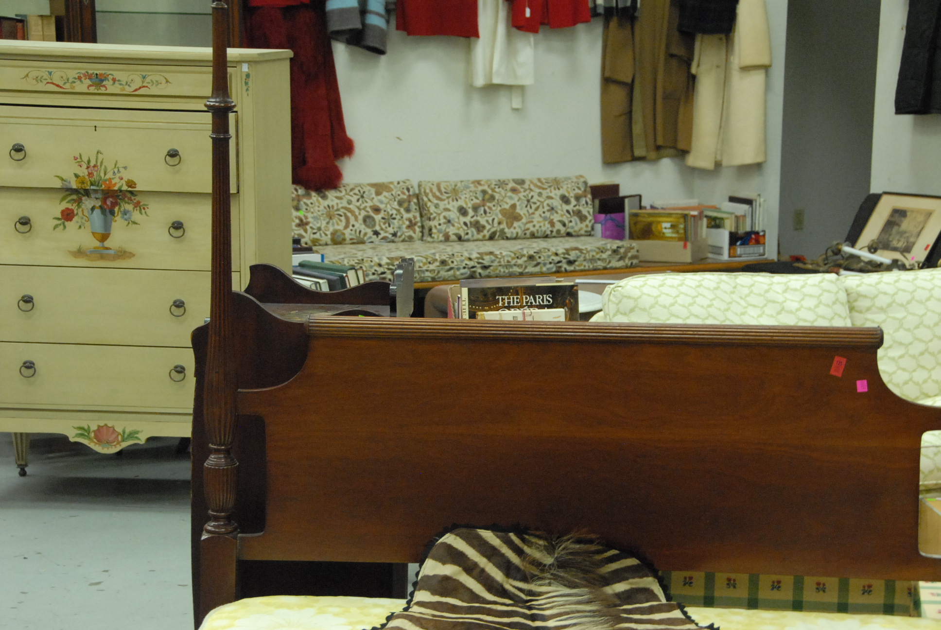 Margolis mahogany double size four post bed with Rabbit Edge custom boxspring and three night tables.