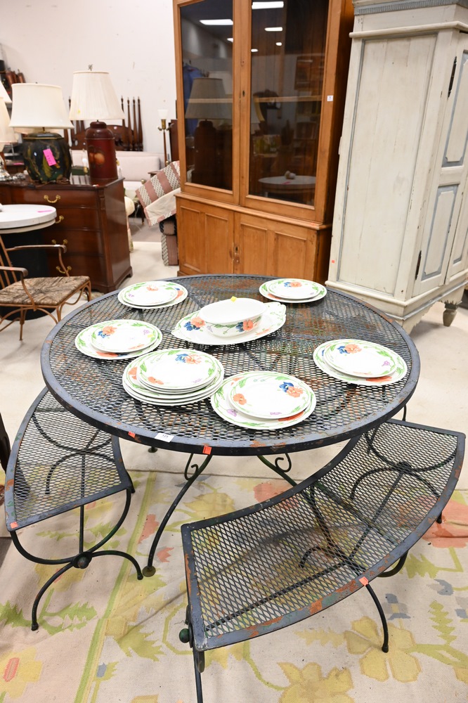 Mesh Iron Round Table, along with three benches, table height 29 inches, table diameter 47 1/2 inches.