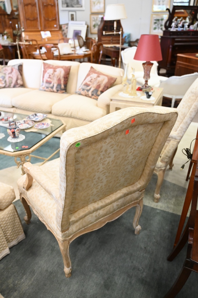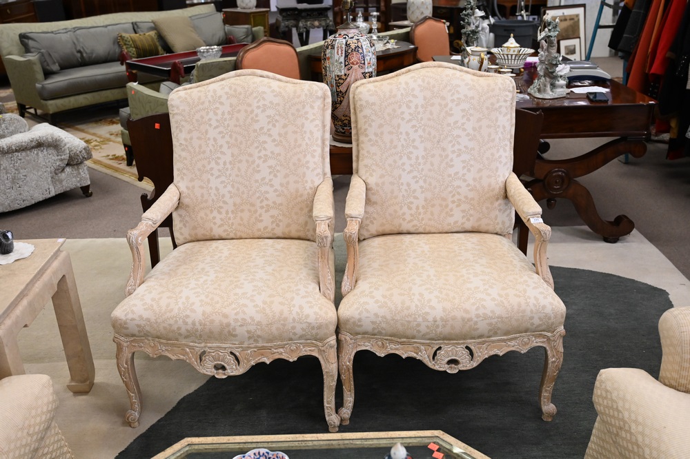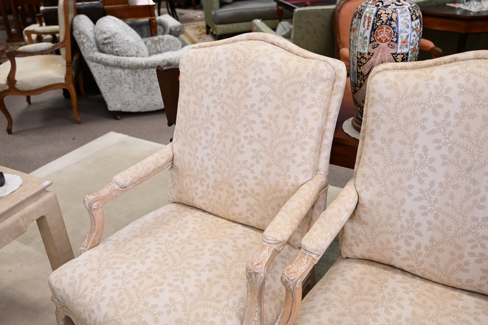 Lot 125: Pair of Michael Taylor Designs Inc., San Francisco Chairs Louis XV style armchairs having custom upholstery, height 42 inches, width 28 inches.