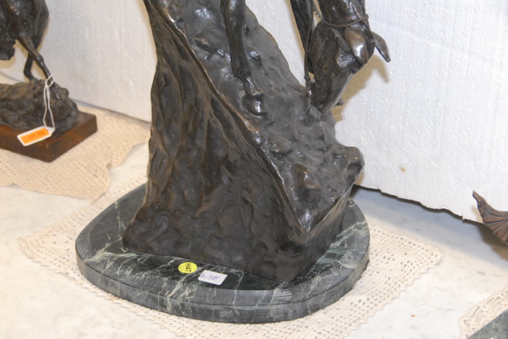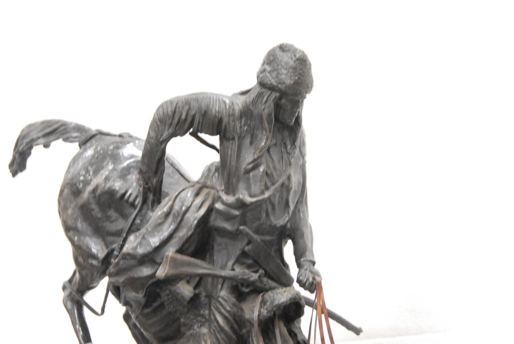 Reproduction Remington bronze of mountain man on horseback.