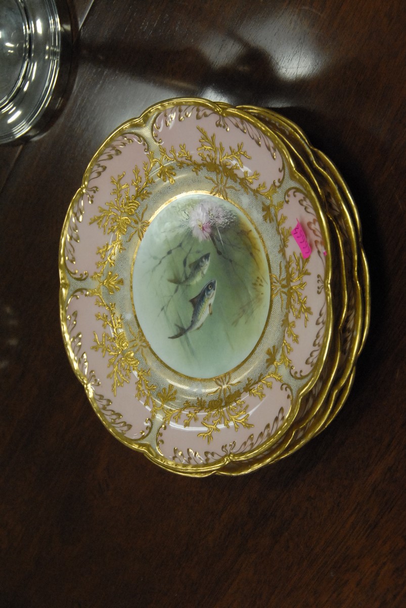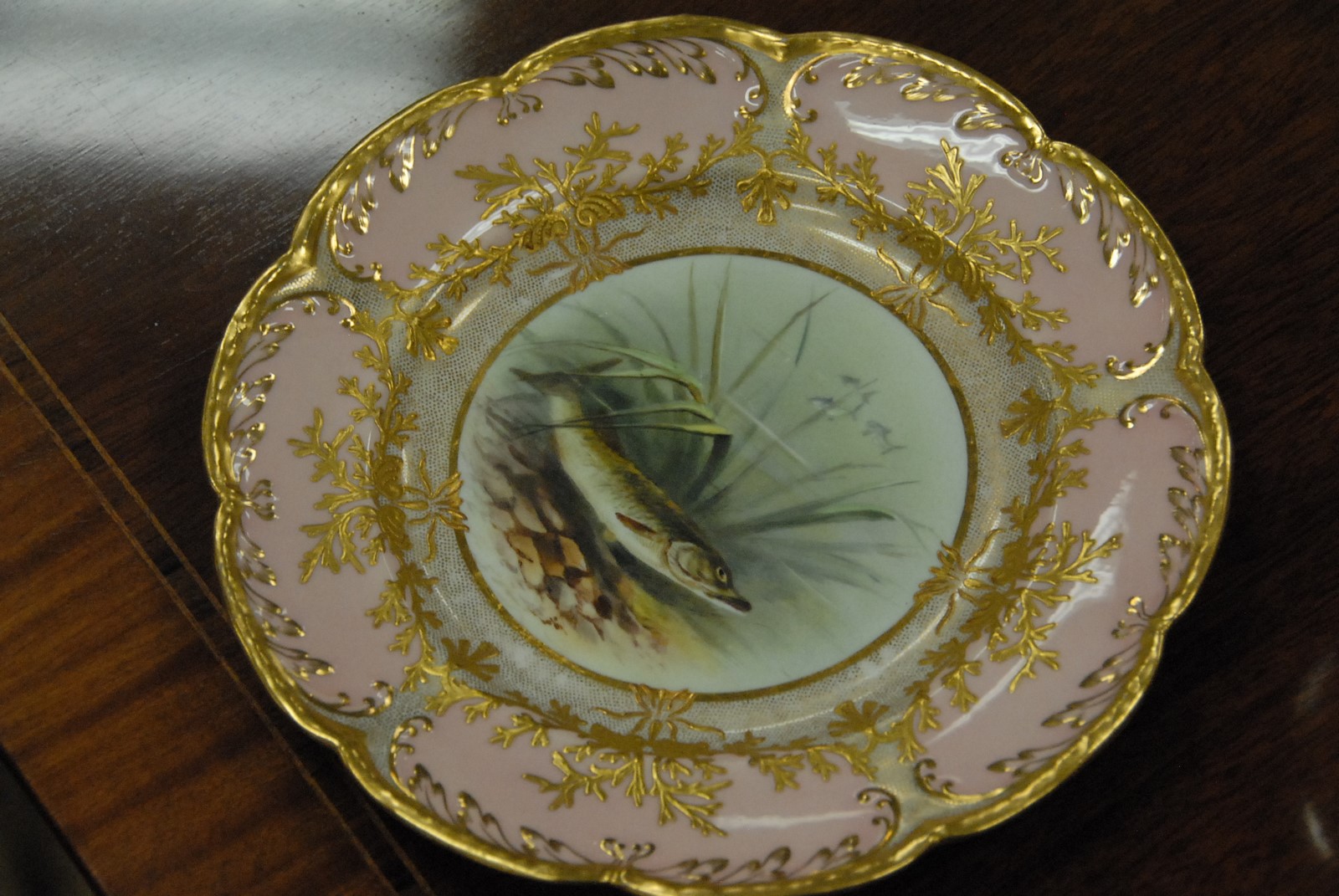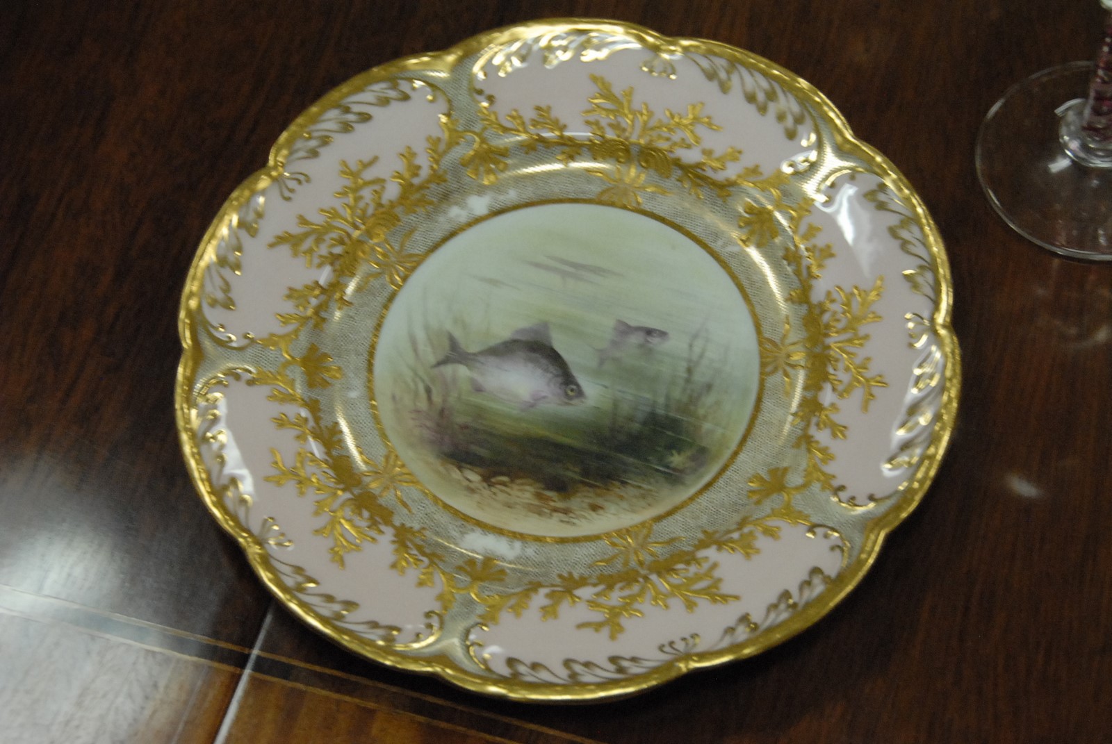 Lot 125: Set of eighteen fish plates, all with hand painted fish scenes and high gold relief on pink panels, Coalport marked Chicago Exhibition 1893 some minor paint loss areas. dia. 9 in.