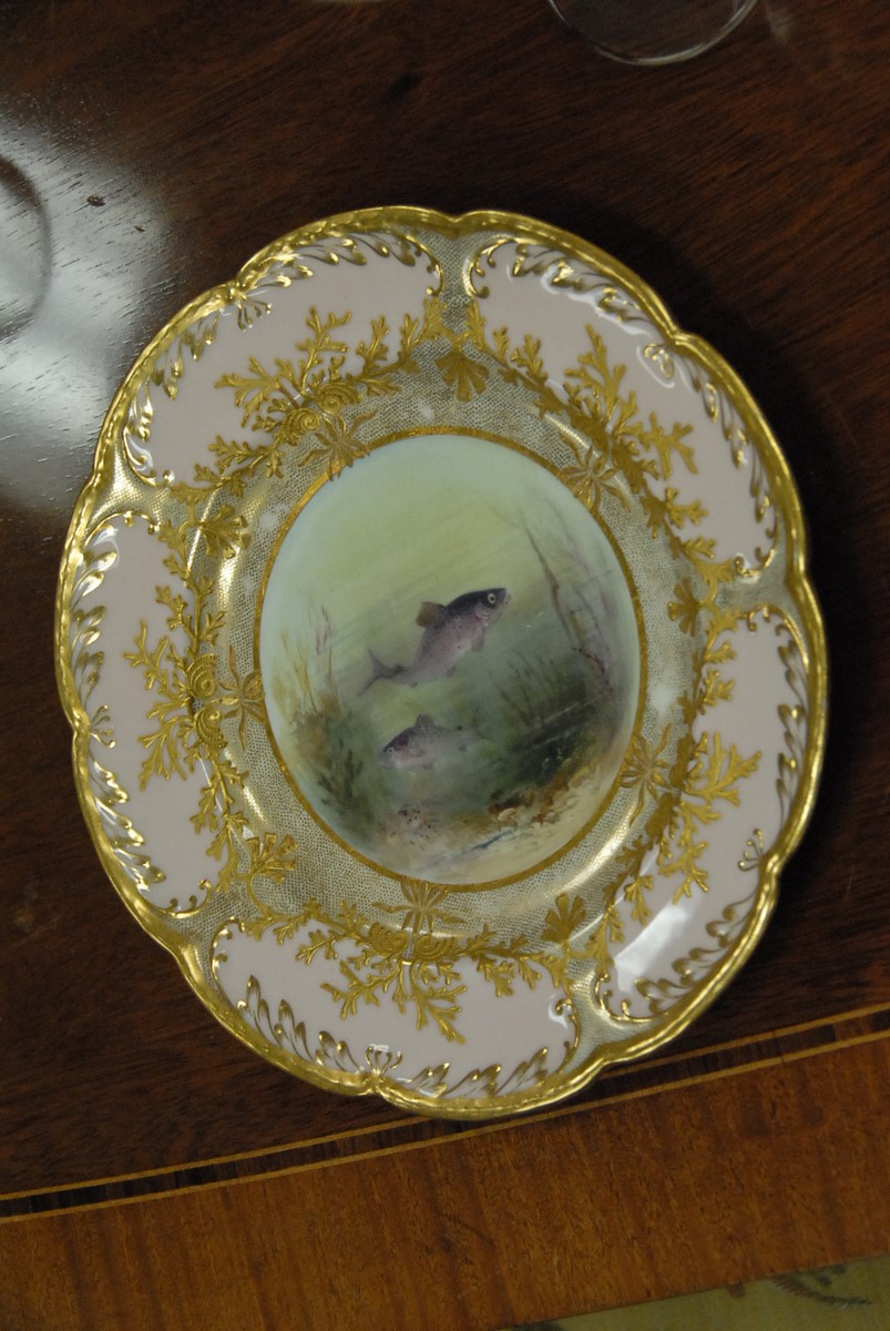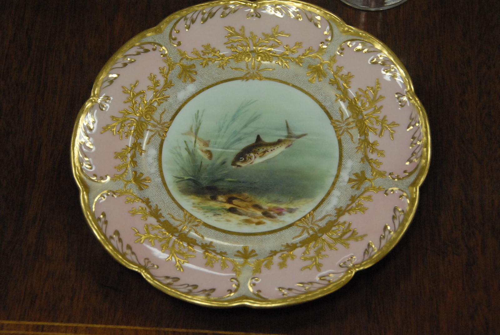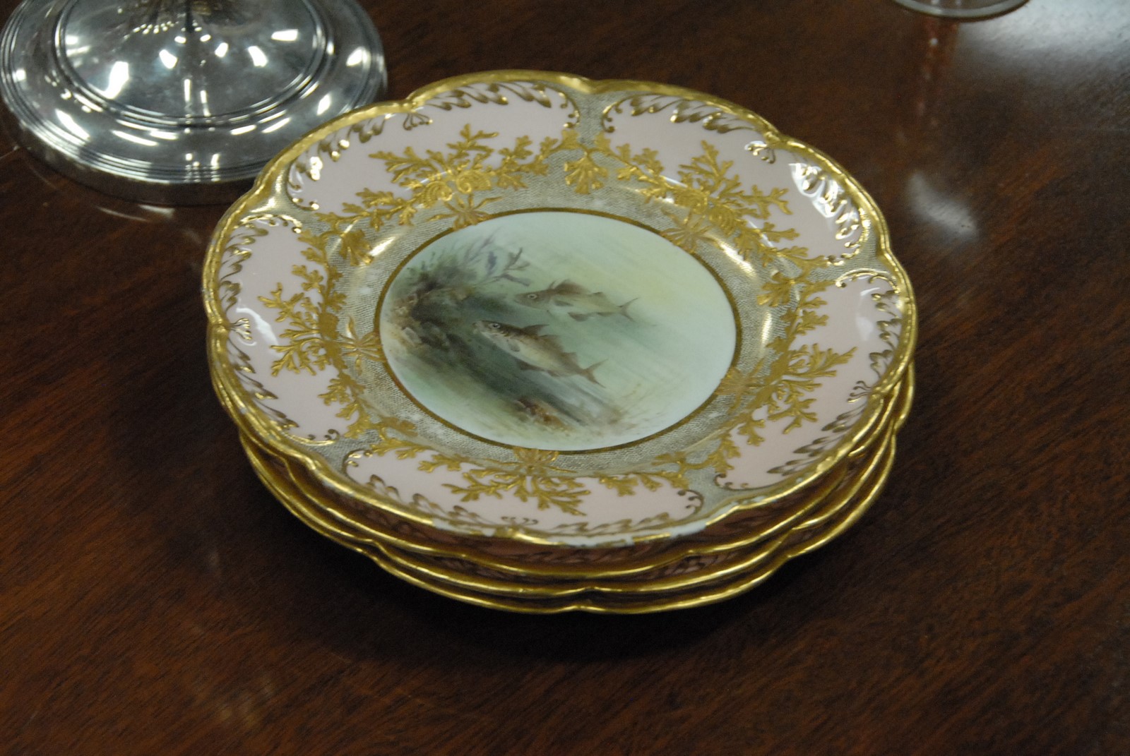 Lot 125: Set of eighteen fish plates, all with hand painted fish scenes and high gold relief on pink panels, Coalport marked Chicago Exhibition 1893 some minor paint loss areas. dia. 9 in.