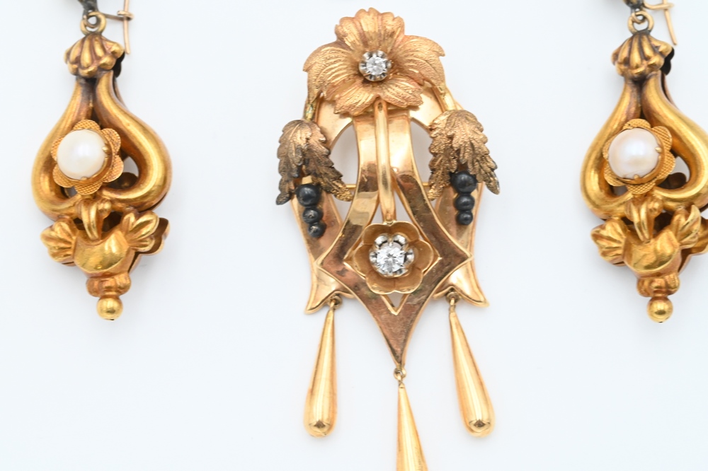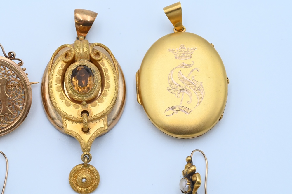 Lot 125: Six Piece Victorian Gold Jewelry Lot, to include a pair of pierced earrings set with pearls; two lockets, one set with citrine; alon…