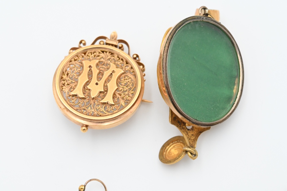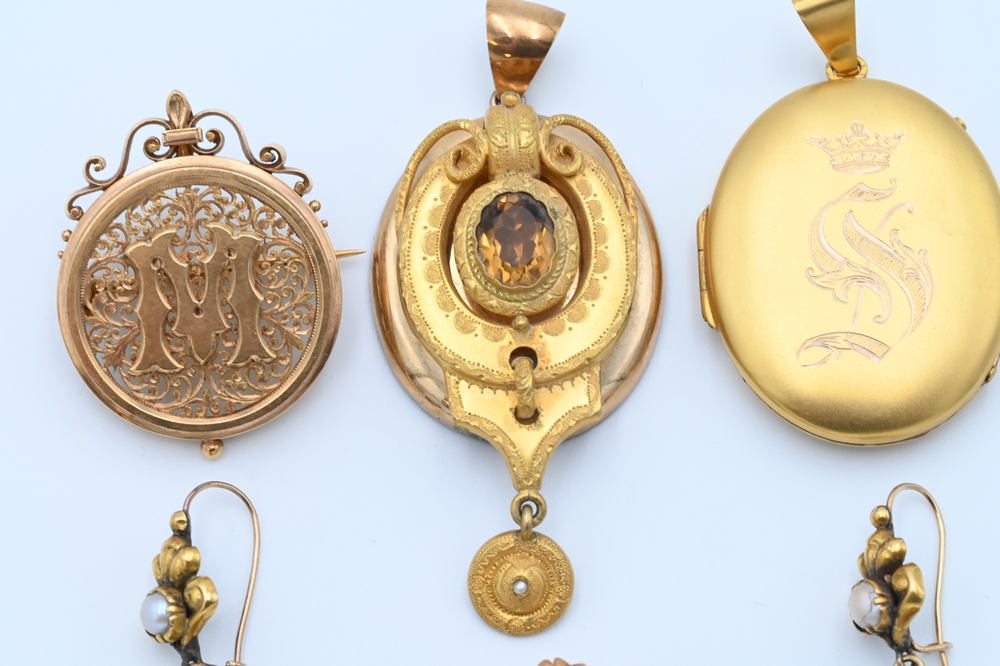 Six Piece Victorian Gold Jewelry Lot, to include a pair of pierced earrings set with pearls; two lockets, one set with citrine; along with two brooches, total weight 61 grams.