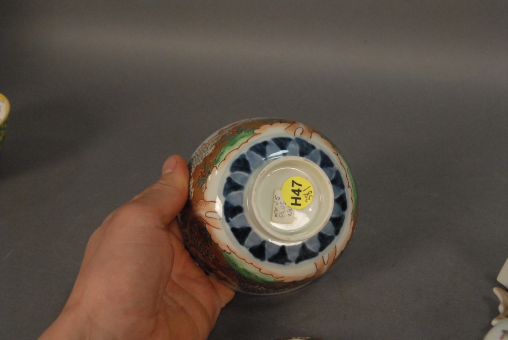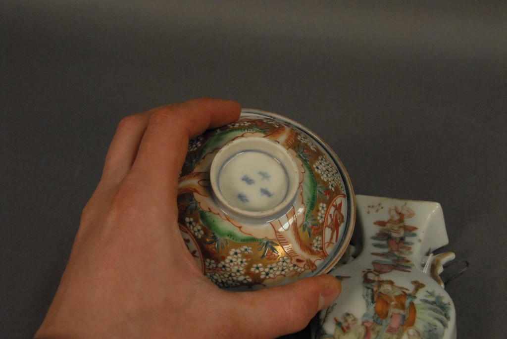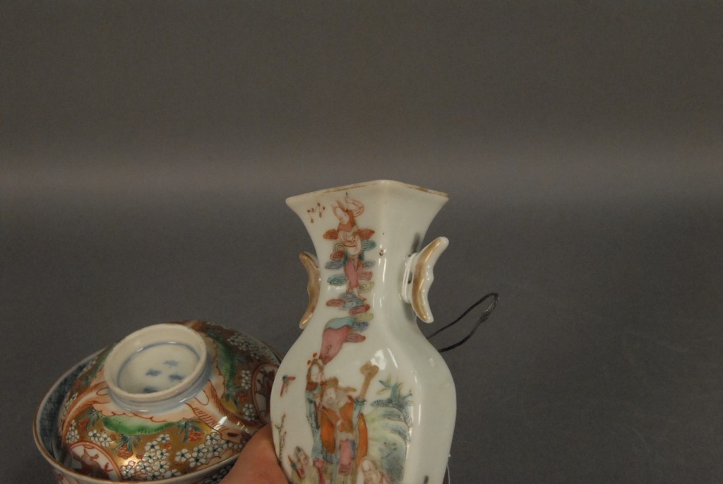 Lot 125: Three Famille Rose pieces to include a wall vase, ht 7, along with a cup with a cover, cup dia 4 1/2.