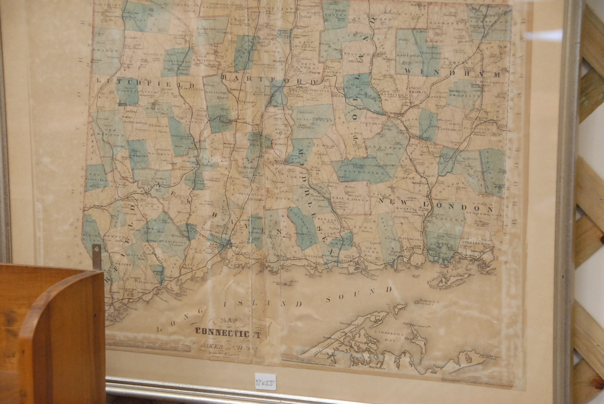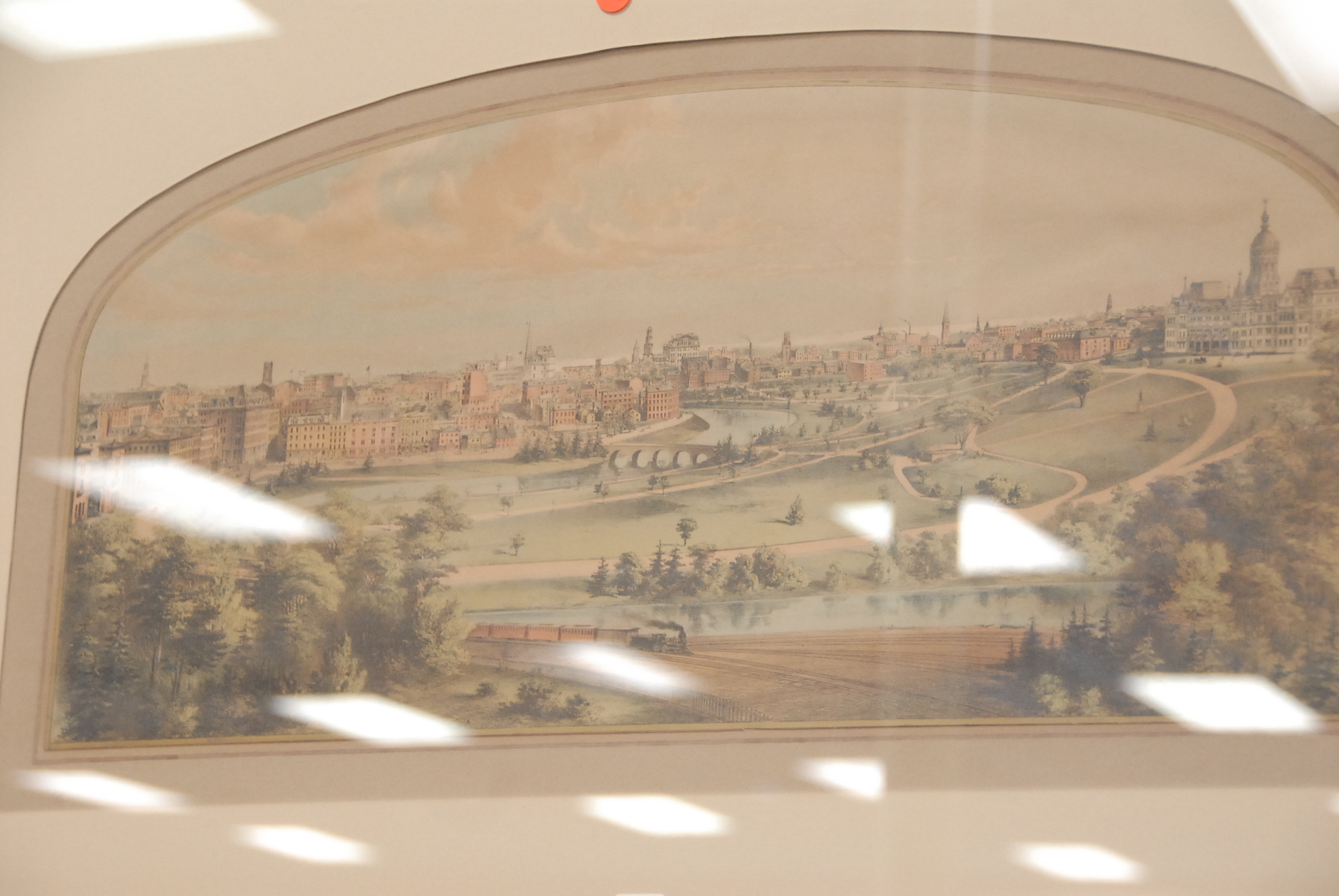 Four piece lot to include reverse painting of Hartford, print of early Hartford circa 1881, Connecticut Fire Insurance Company print of Hartford, and early map of Connecticut.