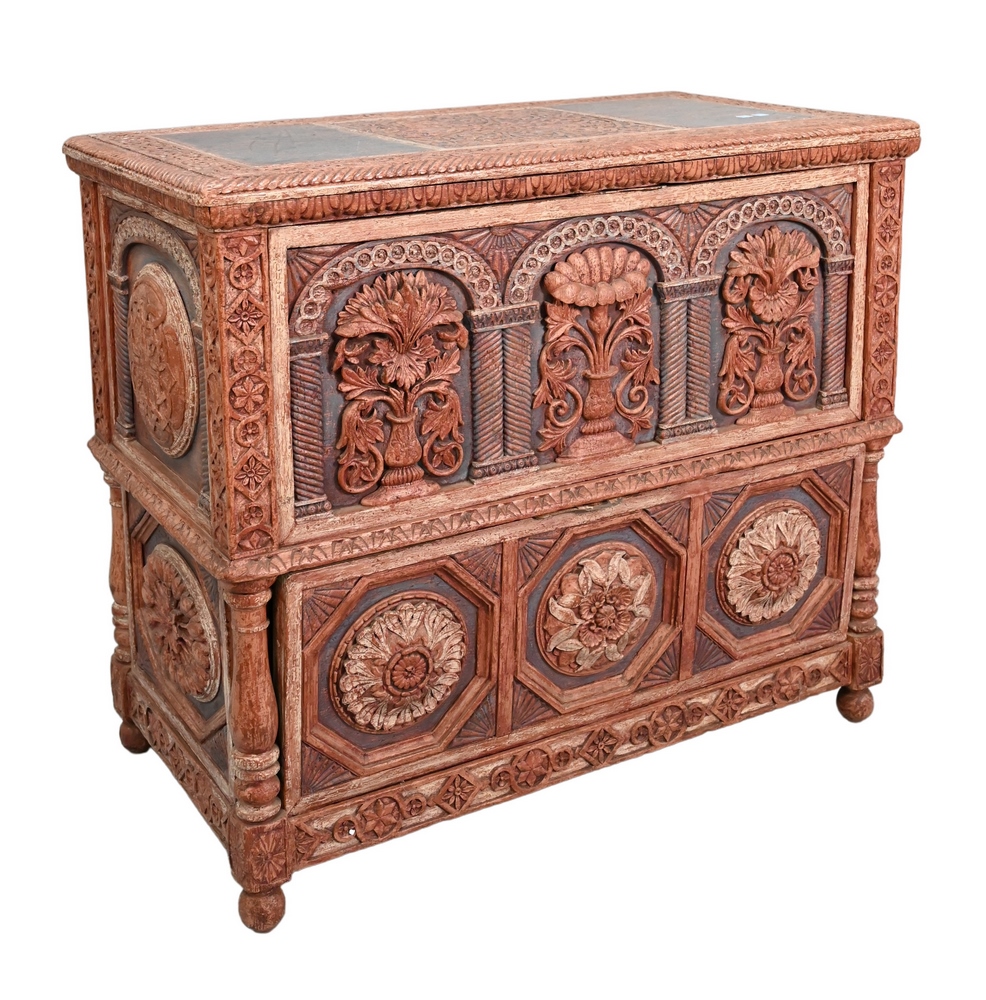 Lot 126: Carved Chest, having removable top and drop door in bottom, height 35 inches, top 22″ x 40 1/2″.