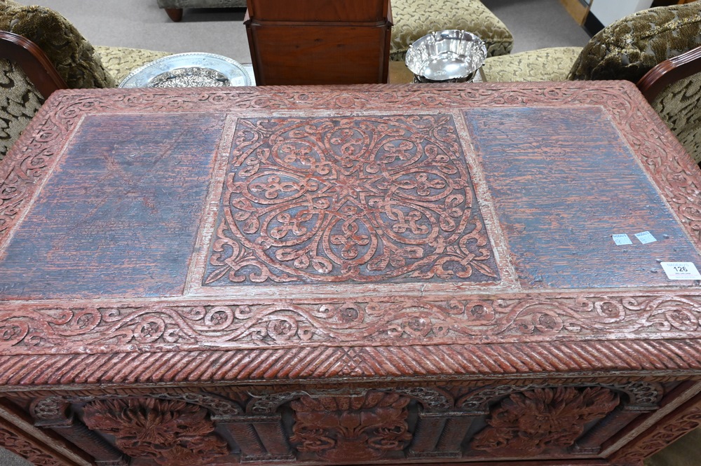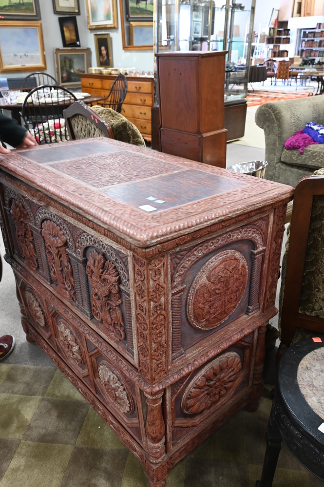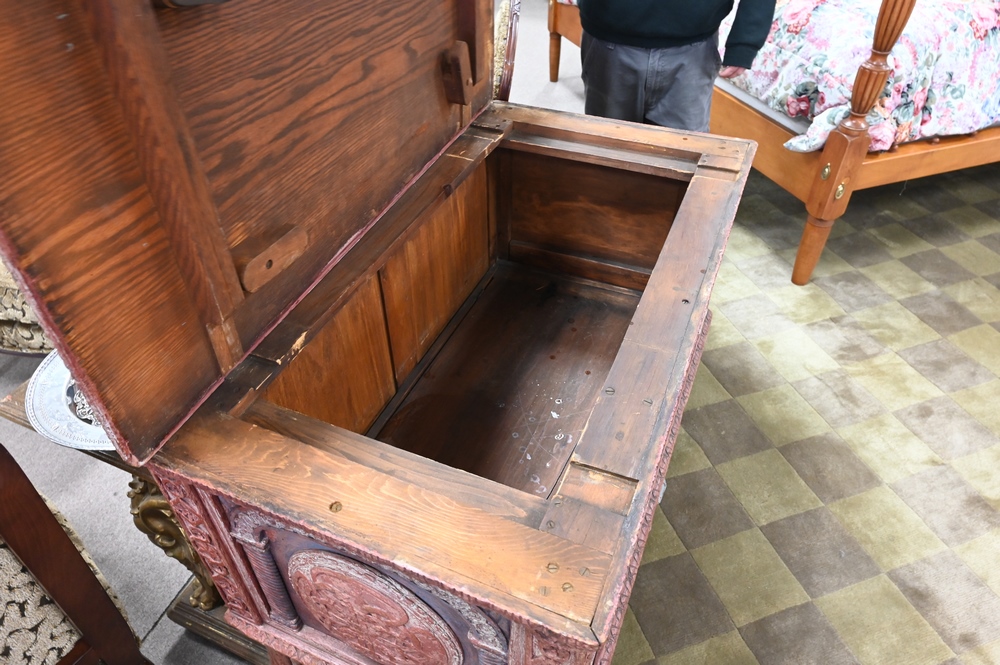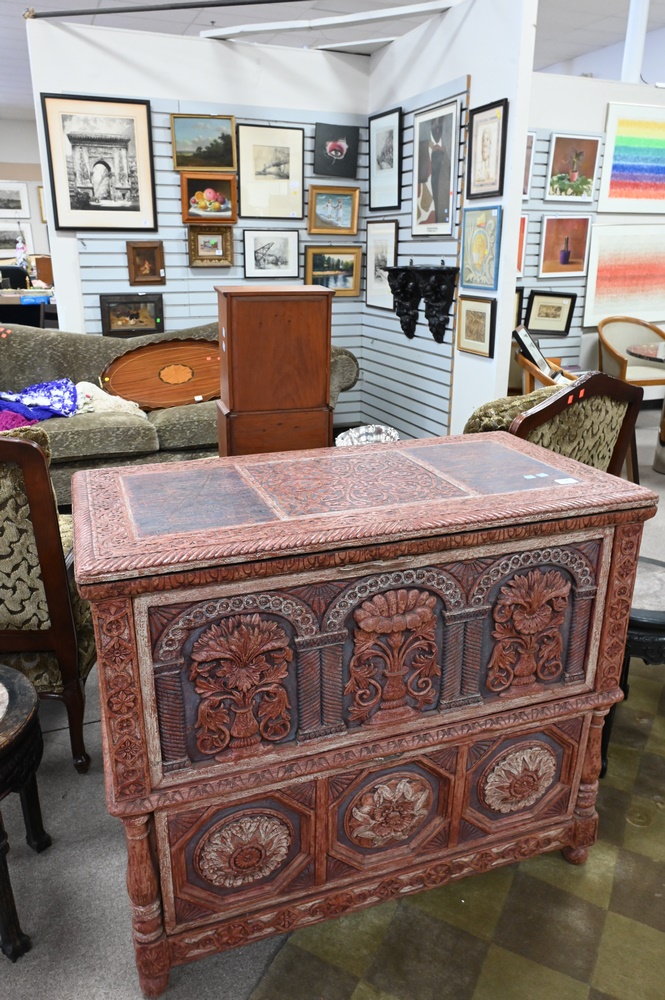 Lot 126: Carved Chest, having removable top and drop door in bottom, height 35 inches, top 22″ x 40 1/2″.
