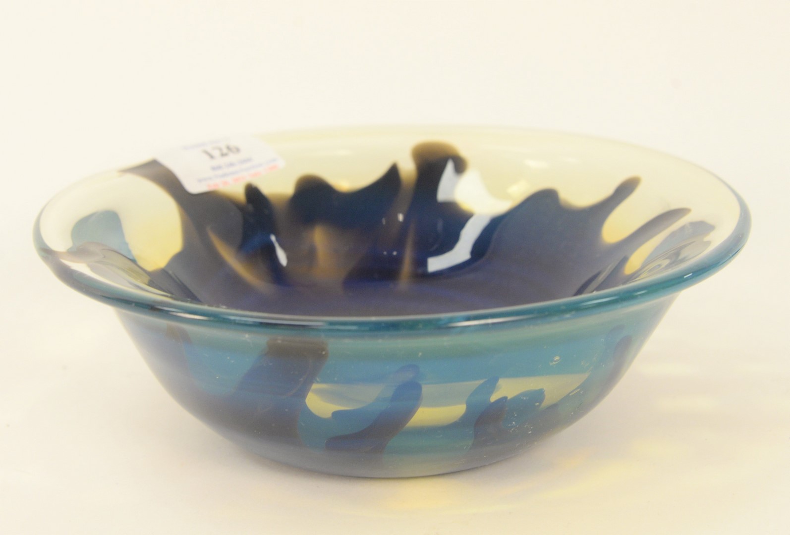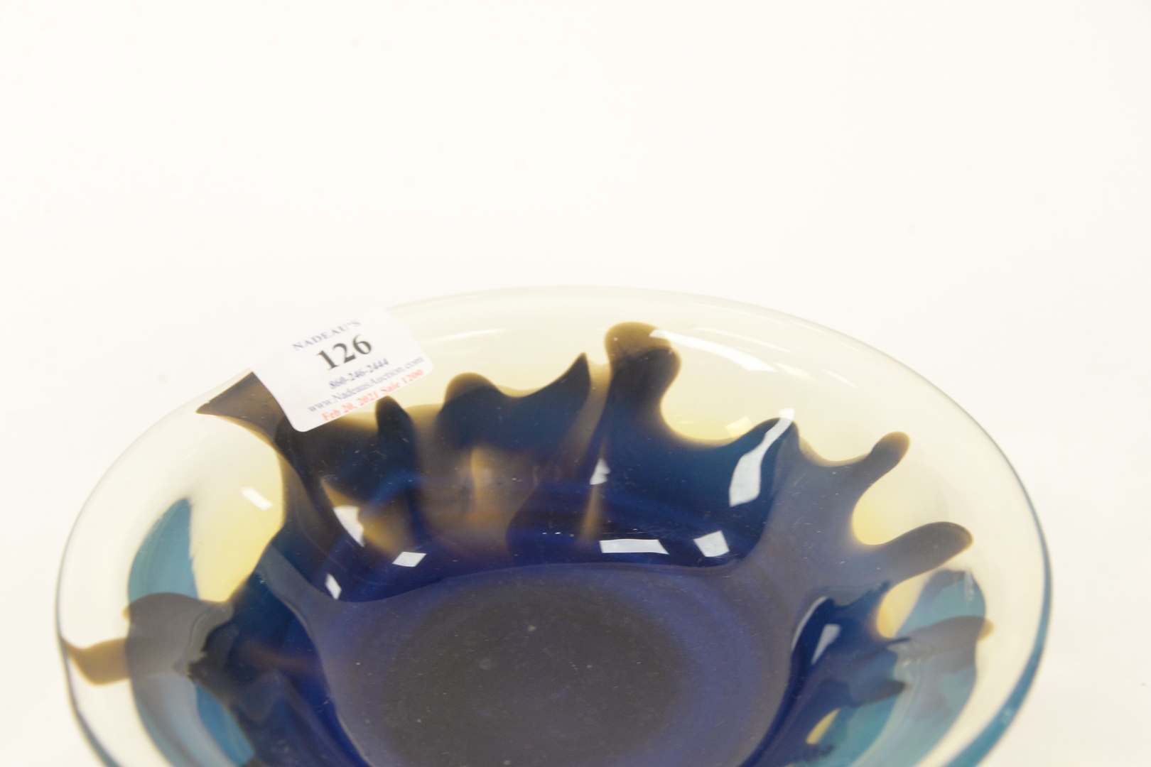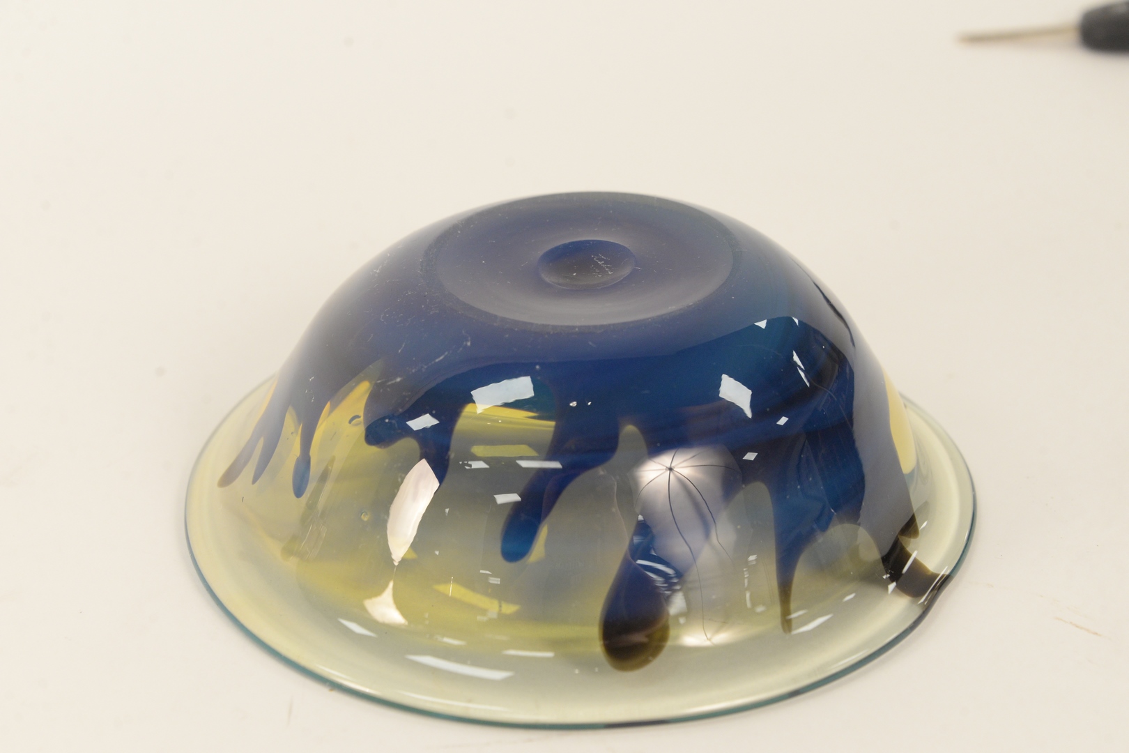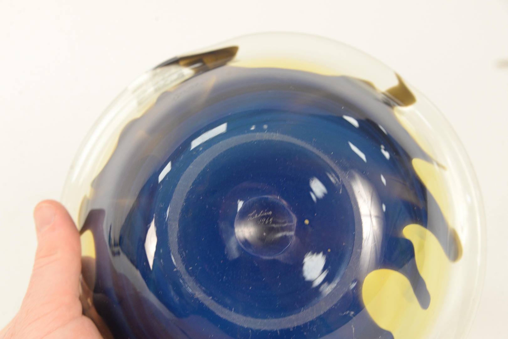 Dominick Labino Art Glass Bowl, clear with blue, signed on bottom Labino, 1969, height 2 1/2 inches, diameter 8 inches. Provenance: The Estate of Alina Roisen, Park Avenue, New York.