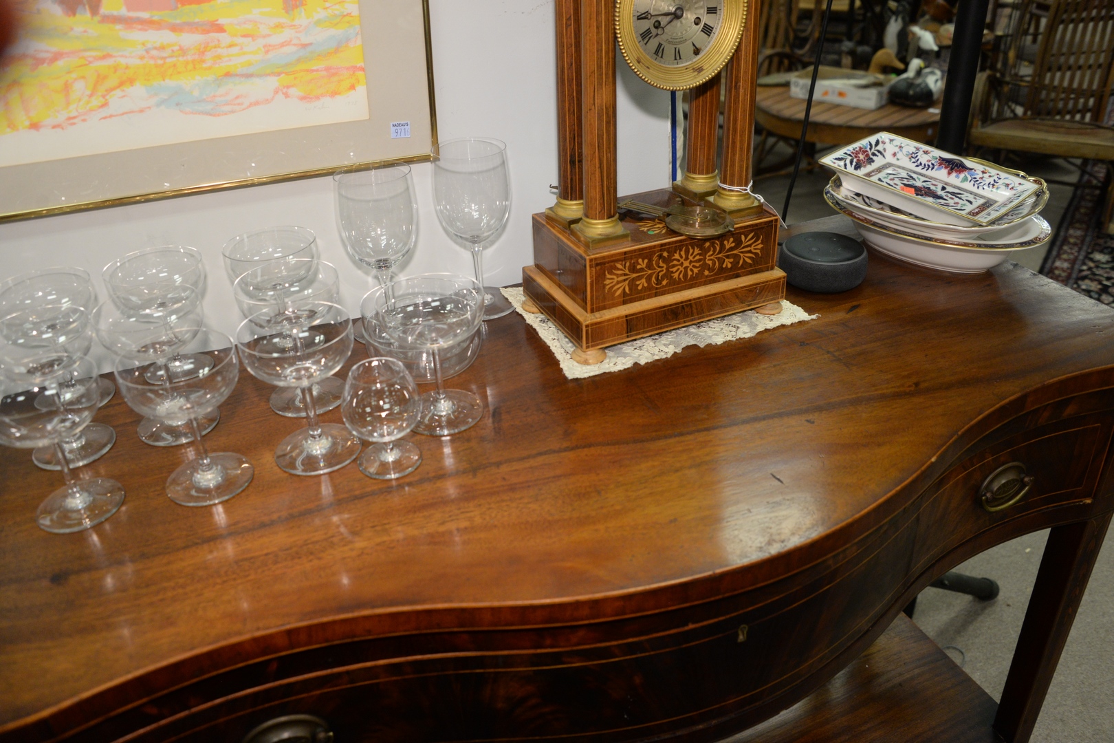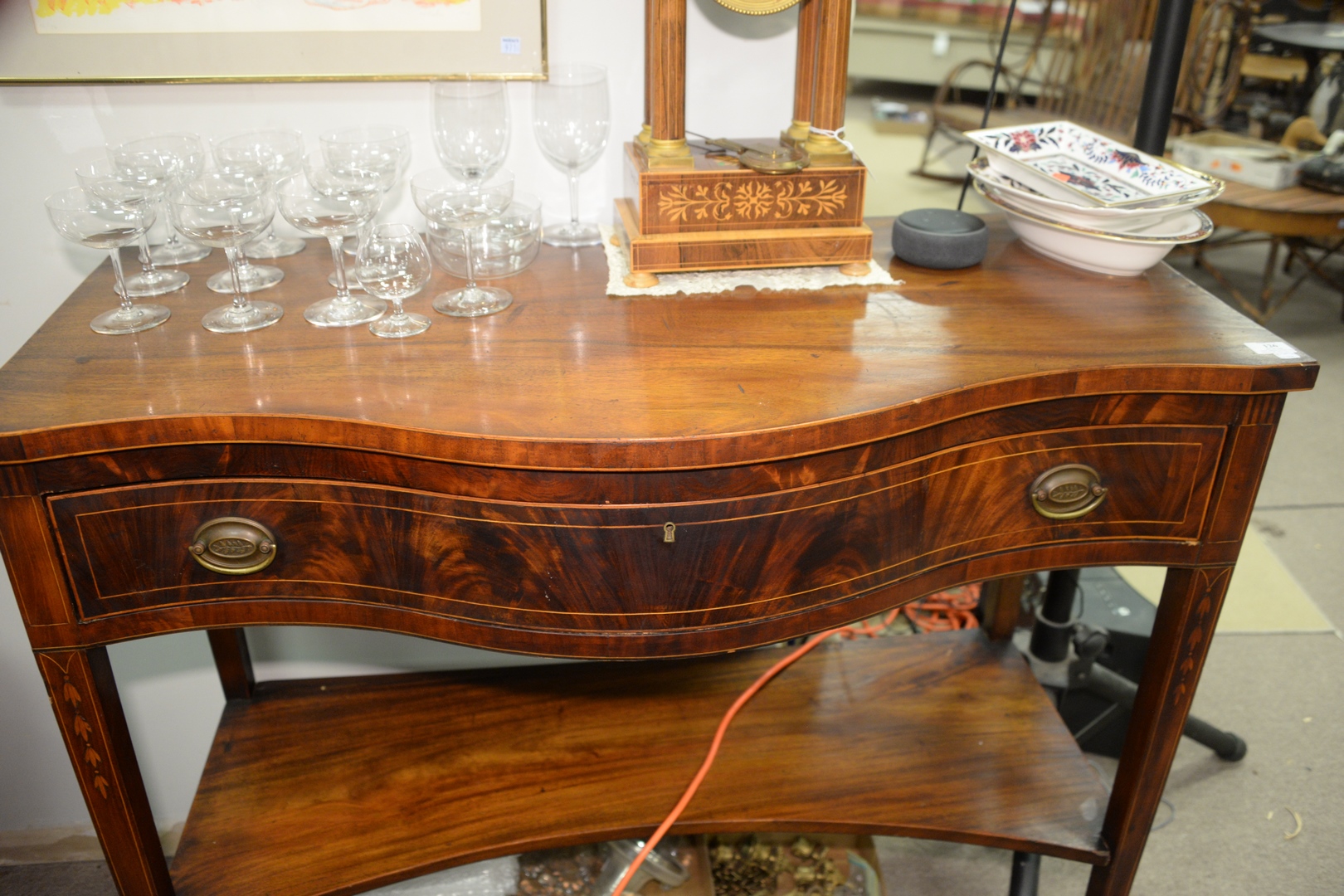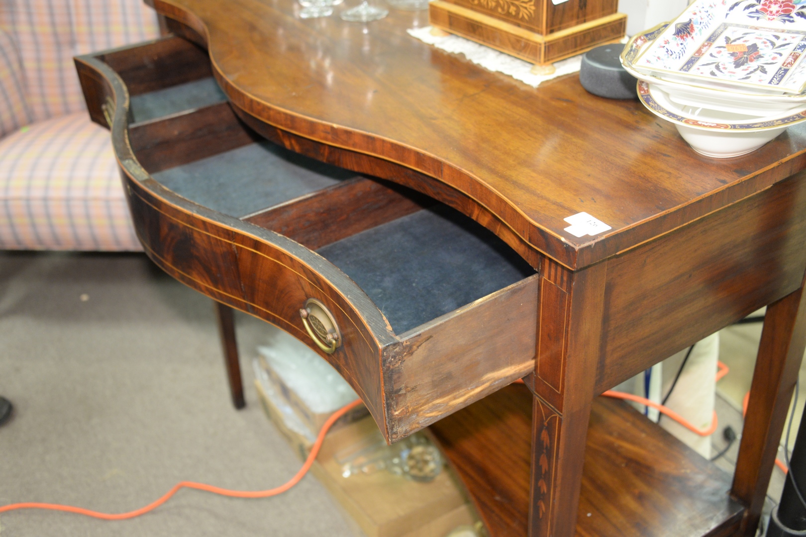 Lot 126: Federal Style Mahogany One Drawer Server with Bell Flower Inlaid Legs height 38 1/2 inches, width 44 inches