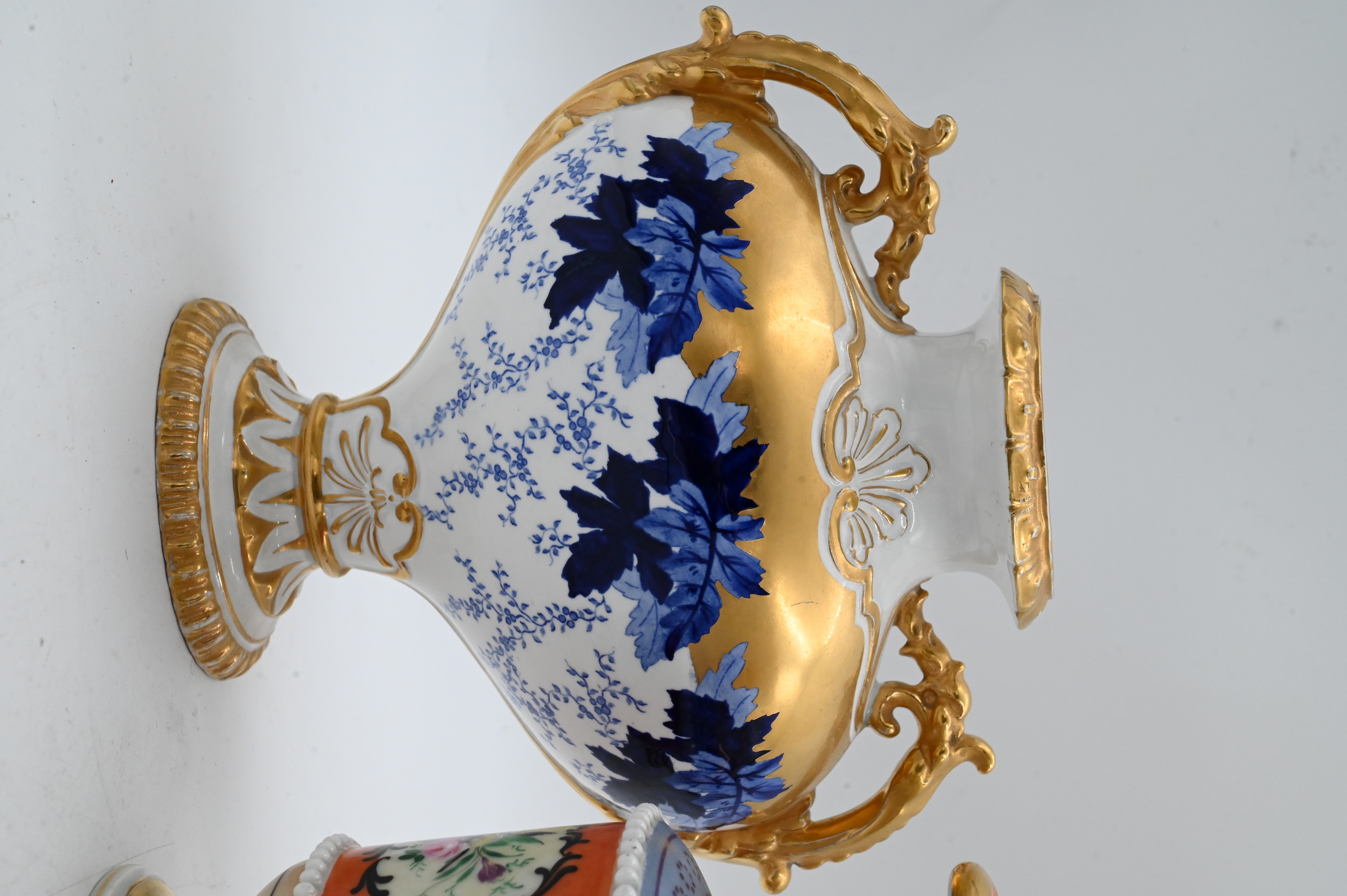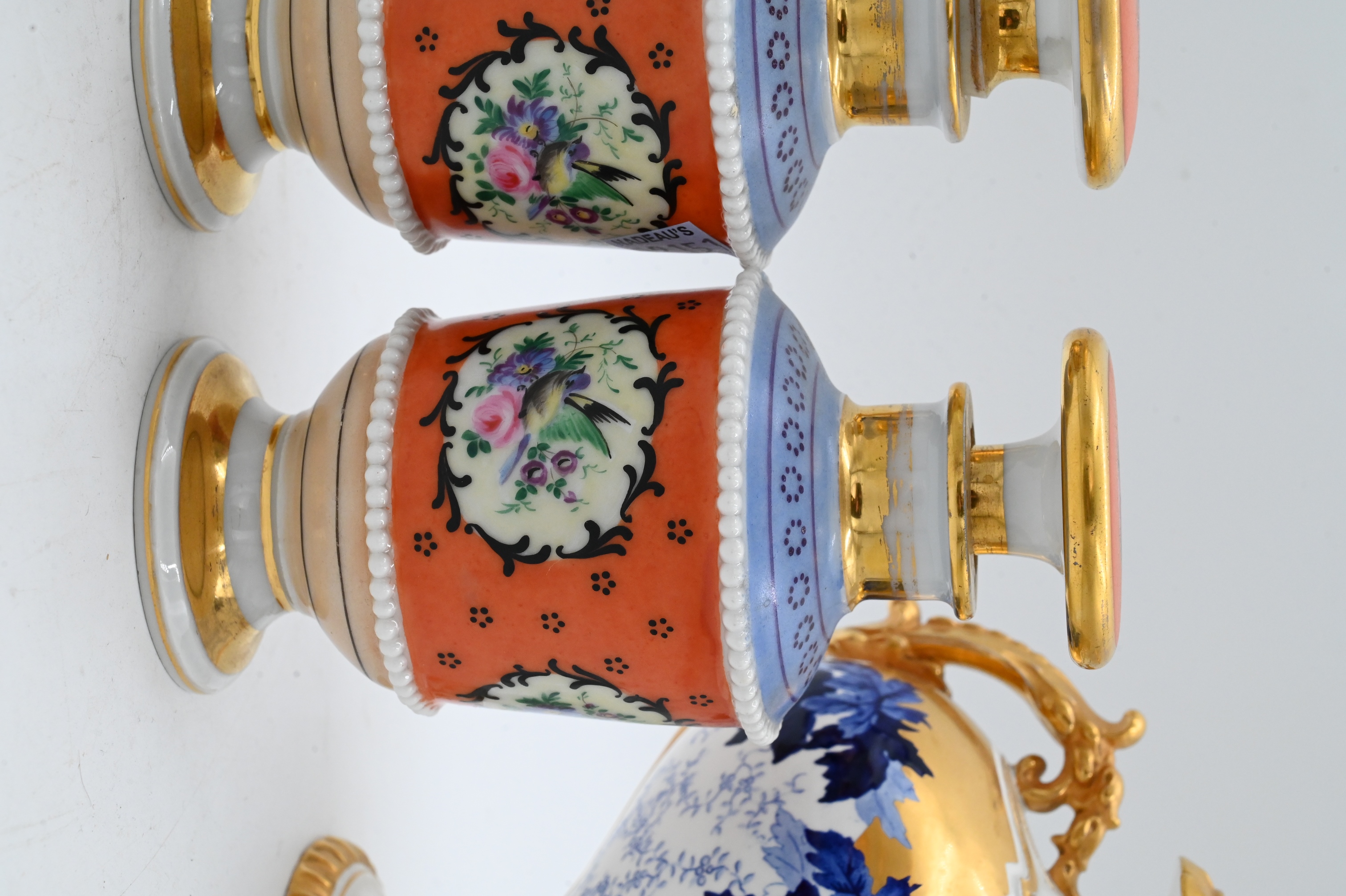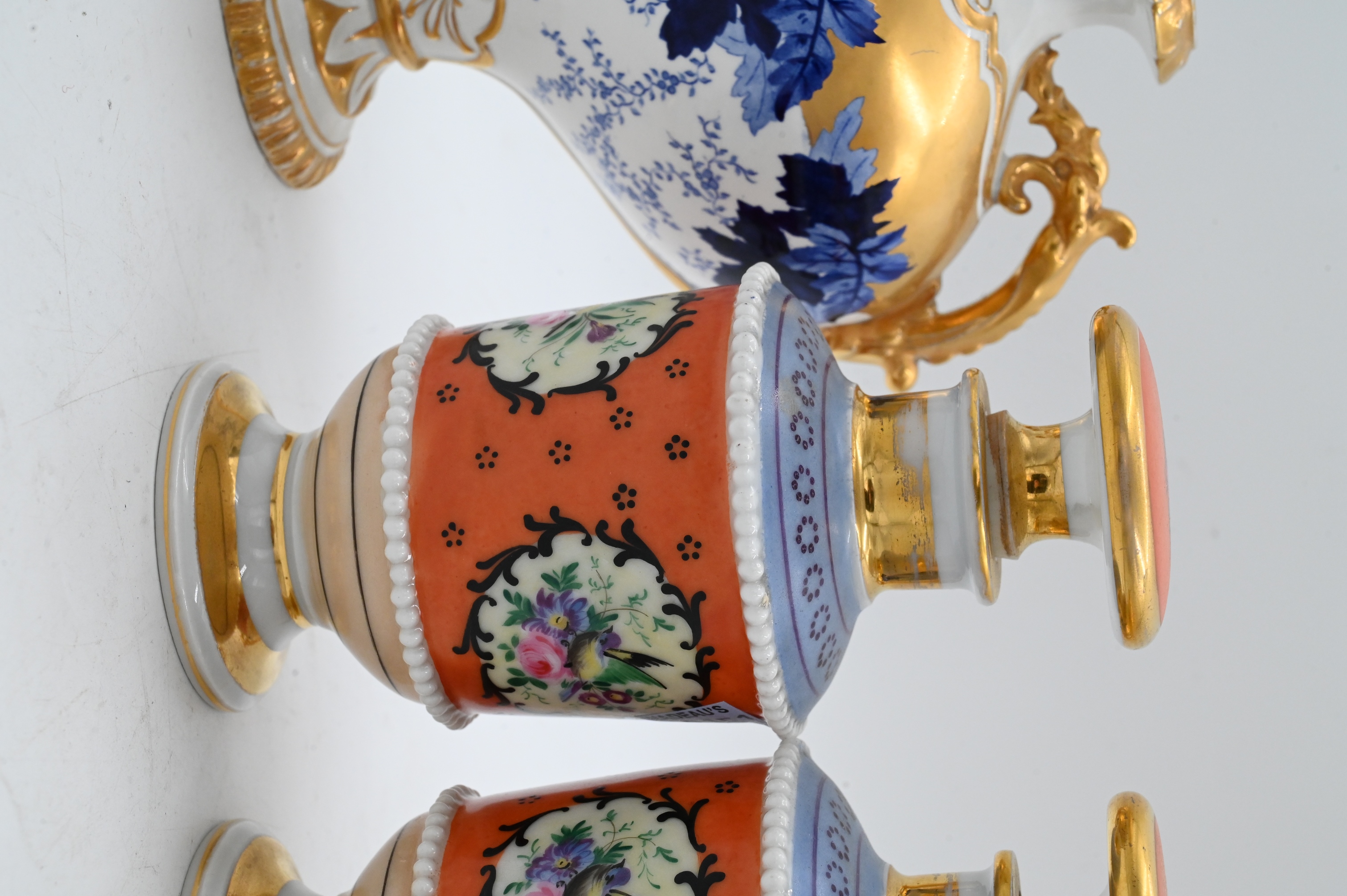 pair of porcelain decanters with gilt and floral accents, along with a pair of Schutz double handled urns