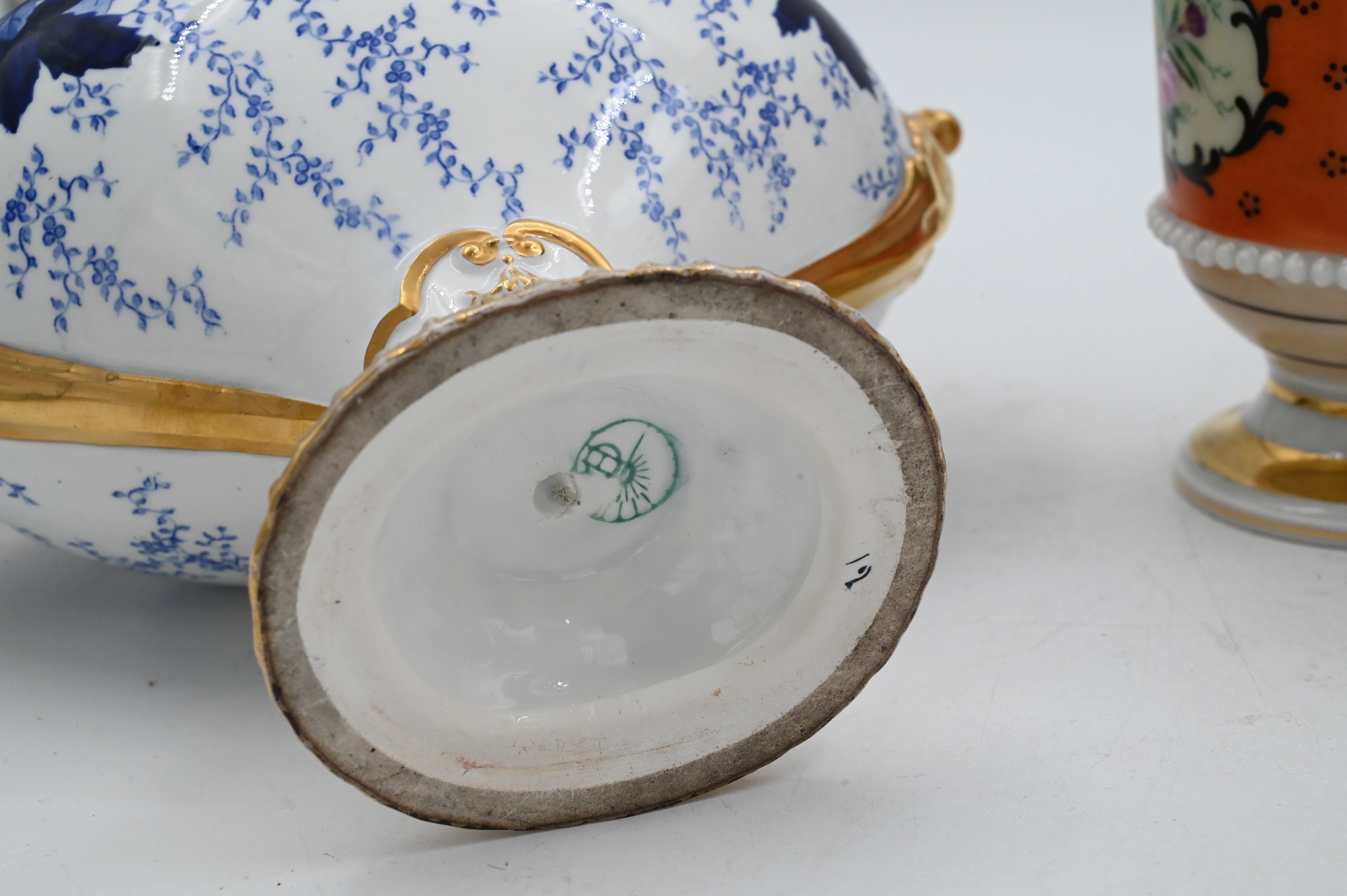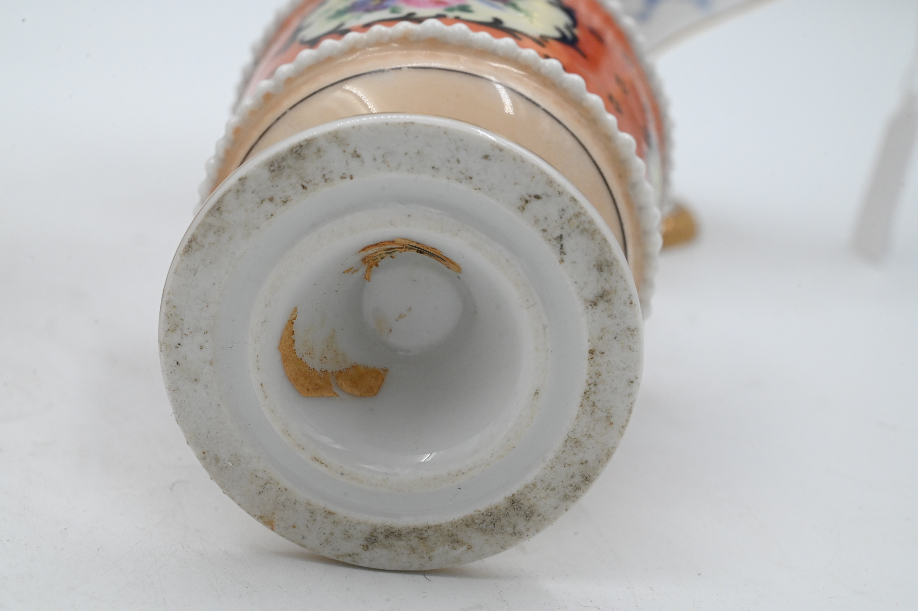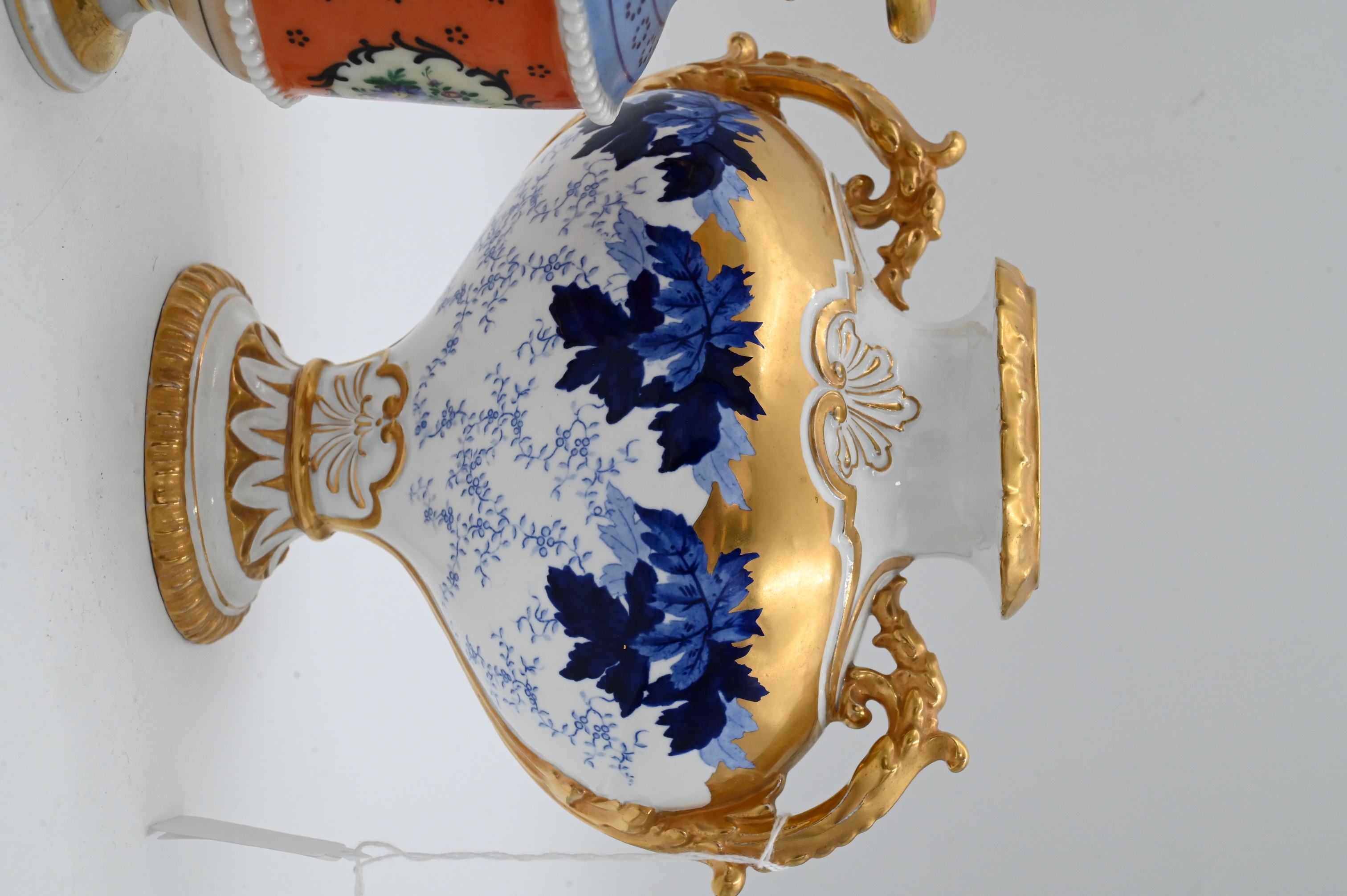 pair of porcelain decanters with gilt and floral accents, along with a pair of Schutz double handled urns