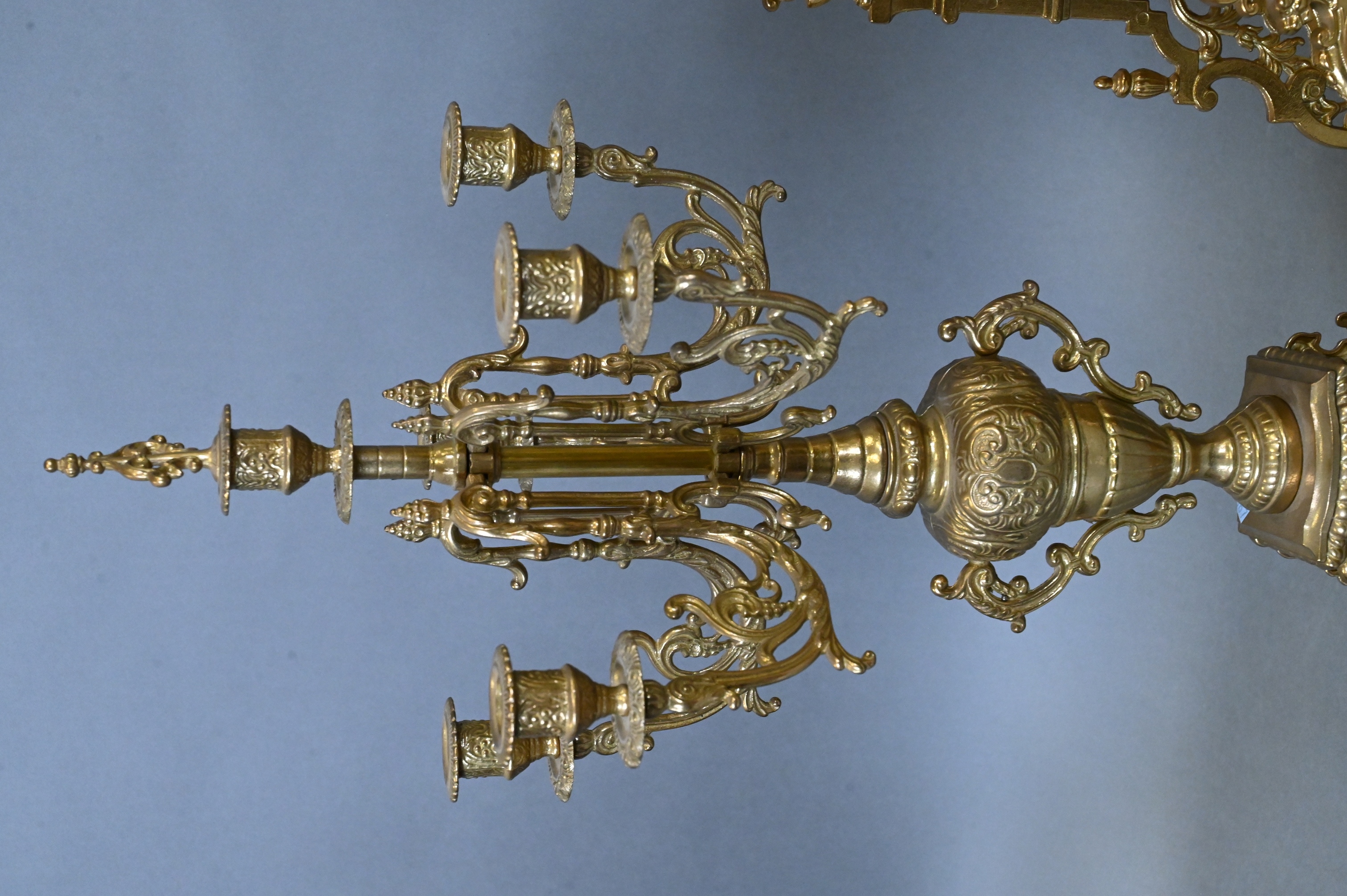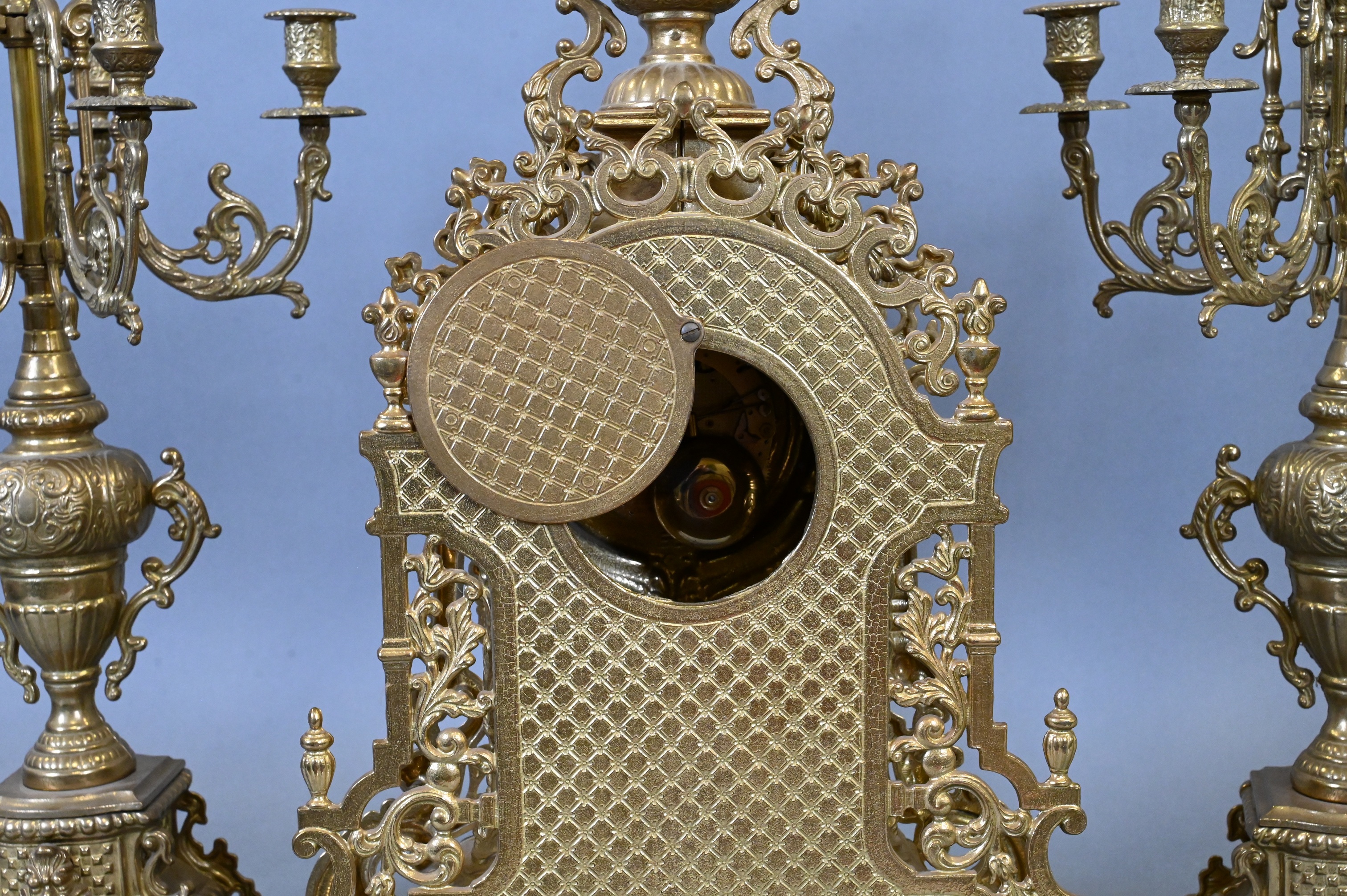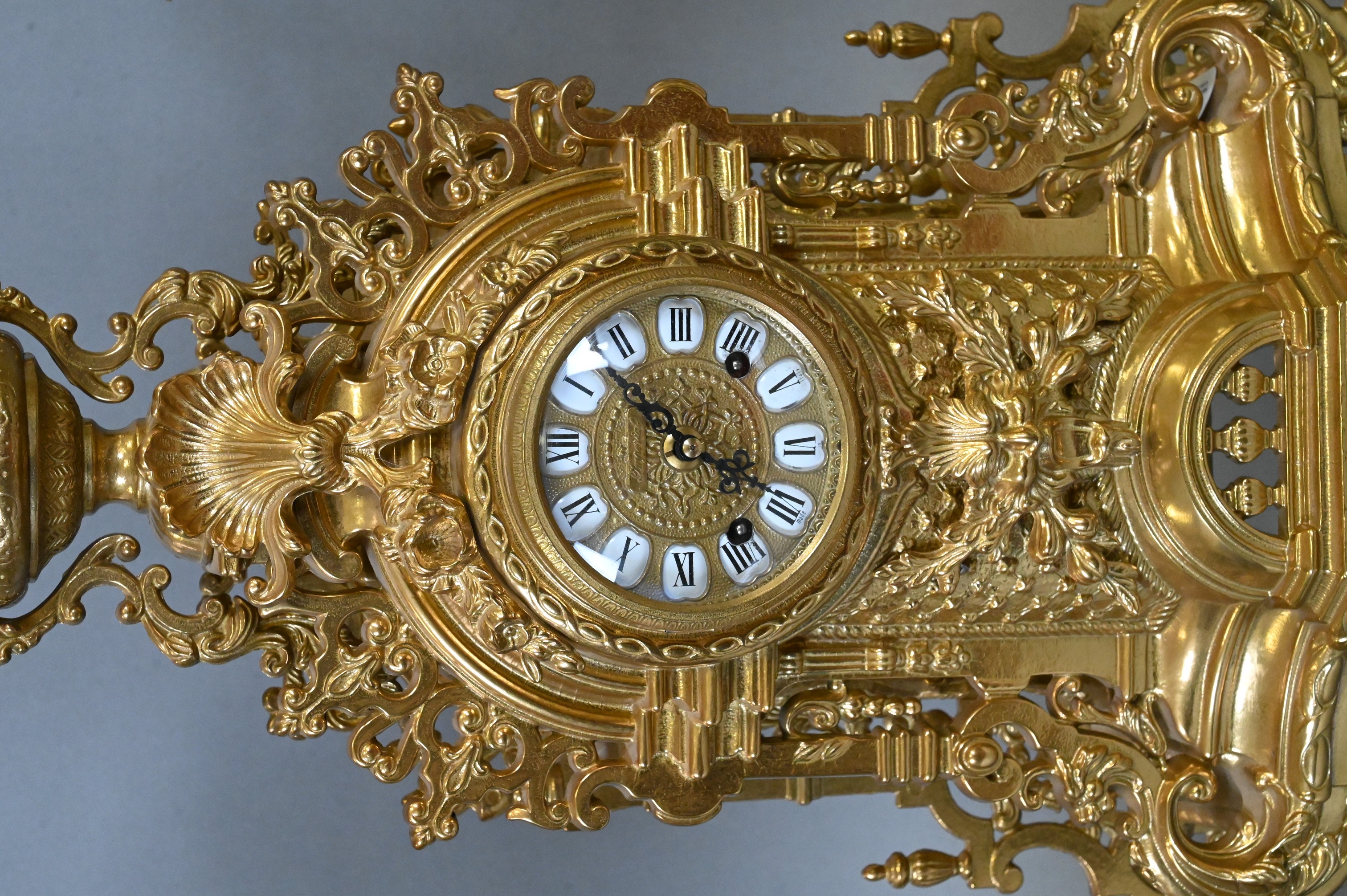 having clock with Hermle movement along with pair of matching five light candelabras