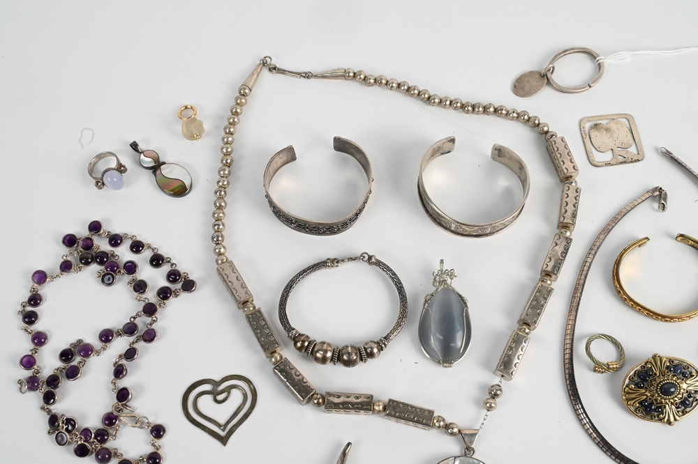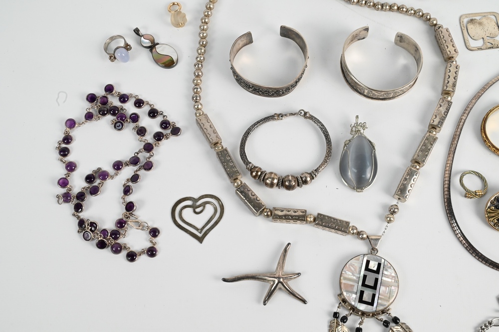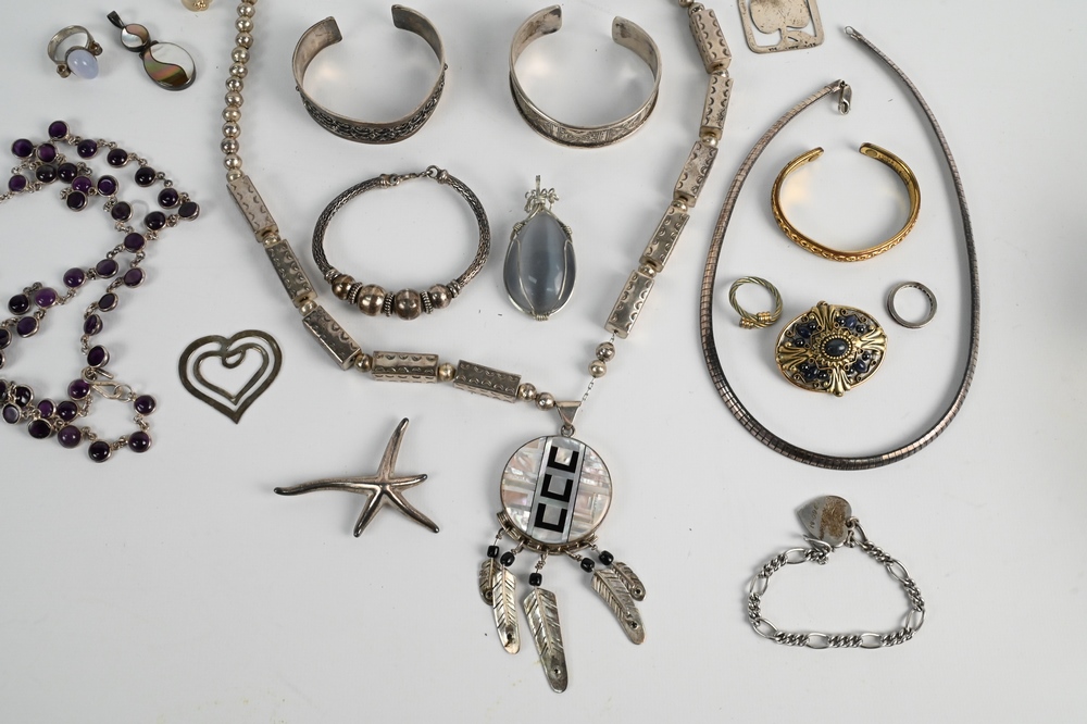 Group of Mostly Sterling Silver Jewelry, to include a Tiffany & Company starfish pin; a Tiffany & Company key ring; two Mexican silver bookmarks; Michal Golan pin; moonstone pendant, weighable 7.2 t.oz.