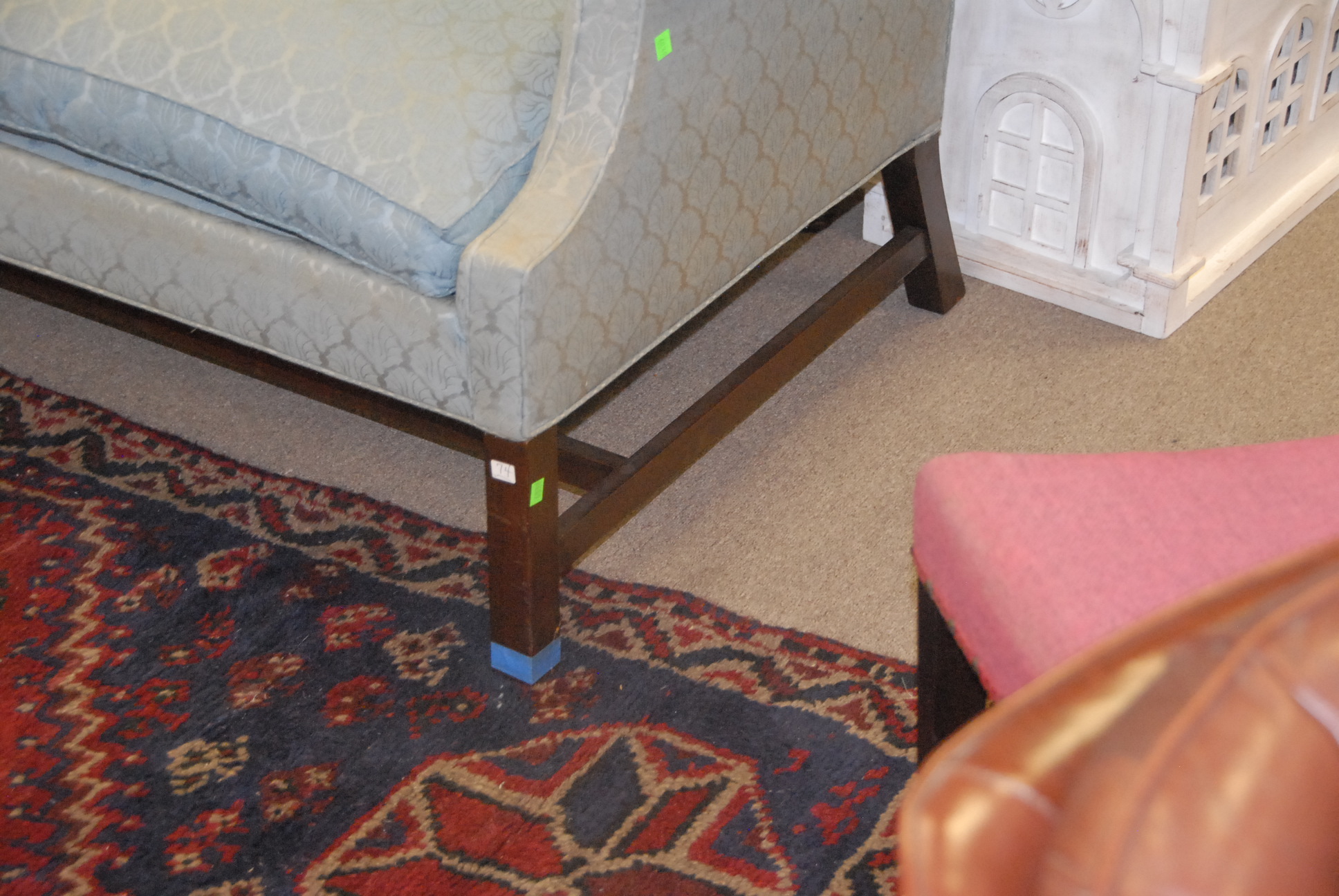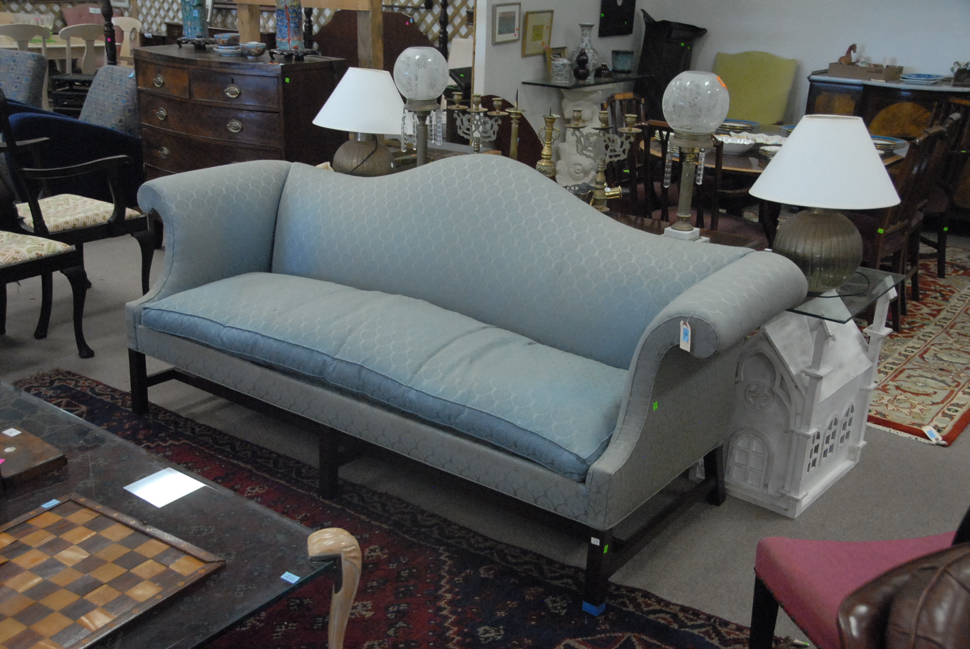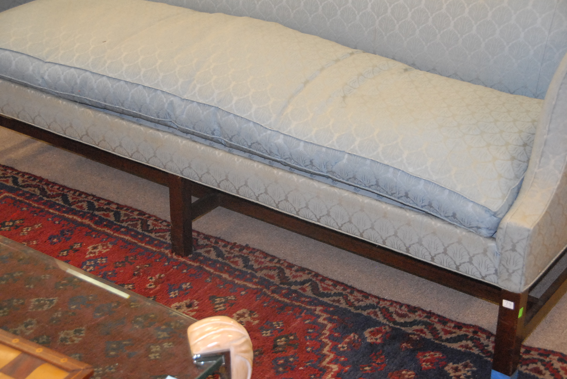 Lot 126: Kittinger Colonial Williamsburg Chippendale style sofa with camel back and rolled arms on plain square legs and stretchers signed on…