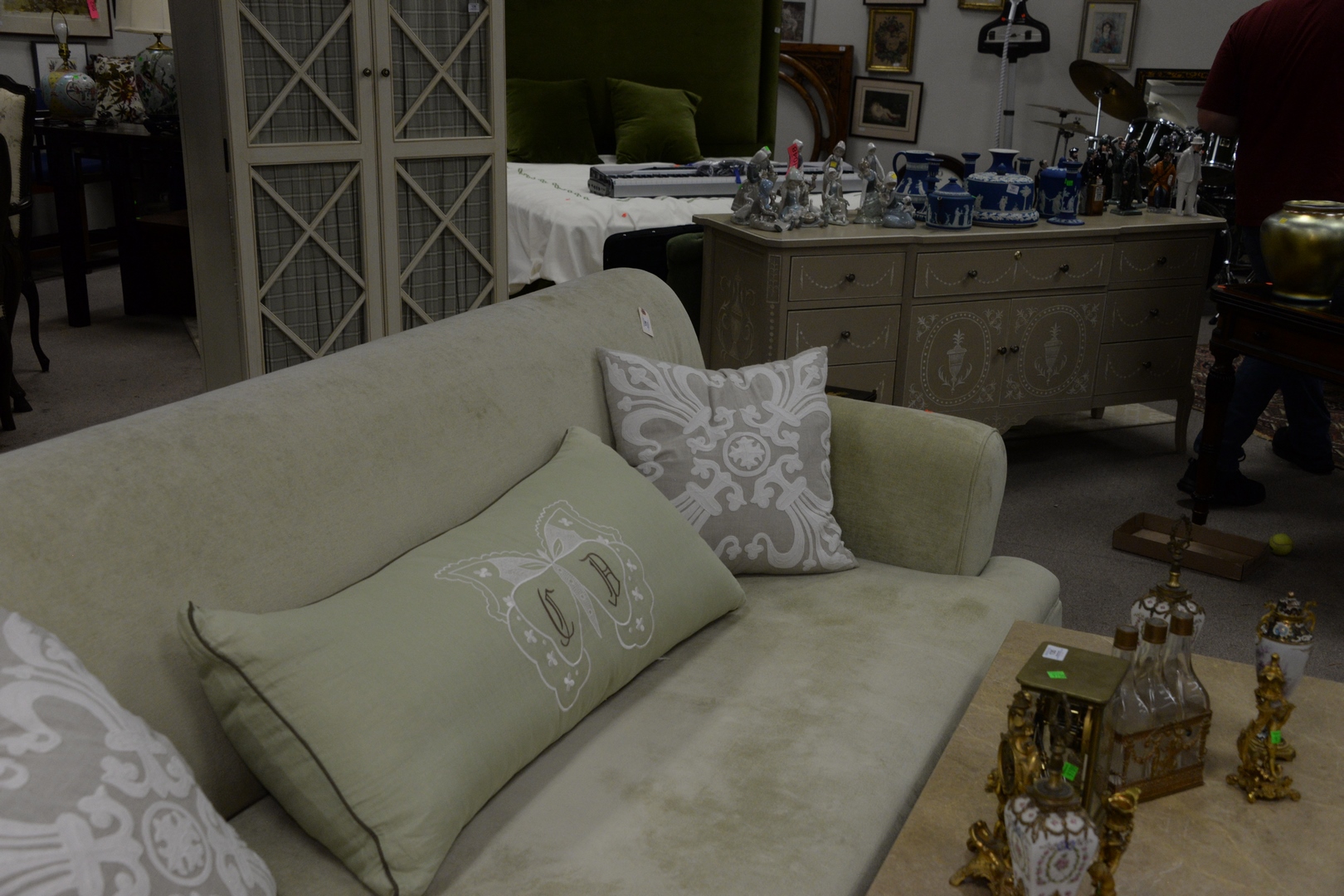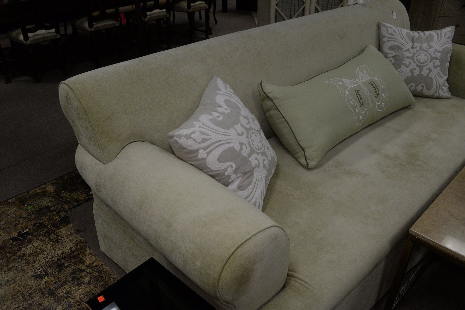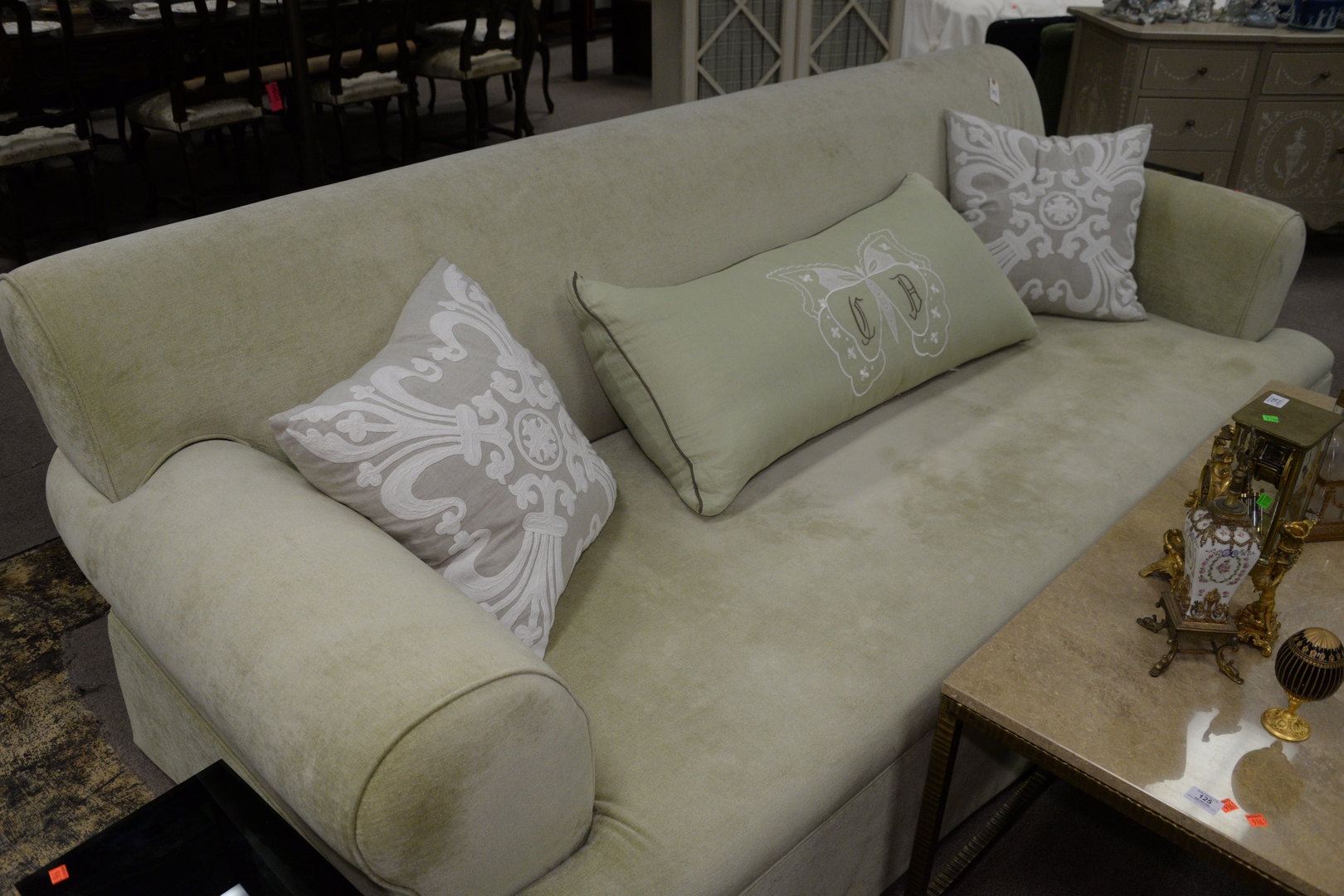 Lot 126: Large Custom Upholstered Sofa, light green with three throw pillows, length 97 inches. Provenance: David and Cynthia Kim, 22 Stoney Wylde Lane, Greenwich, Connecticut. View home by visiting: https://www.zillow.com/homedetails/22-Stoney-Wylde-Ln-Greenwich-CT-06830/177238281_zpid/