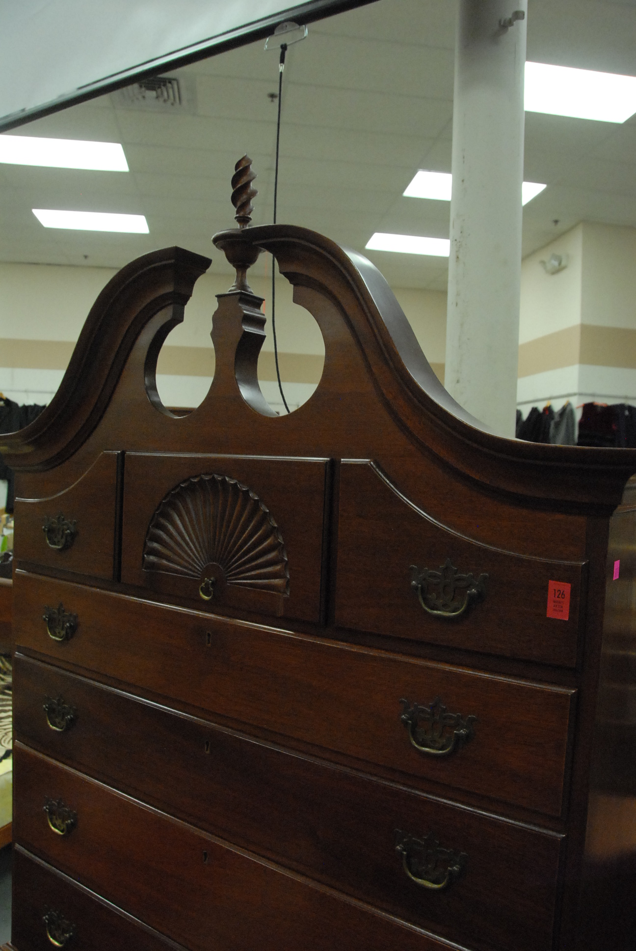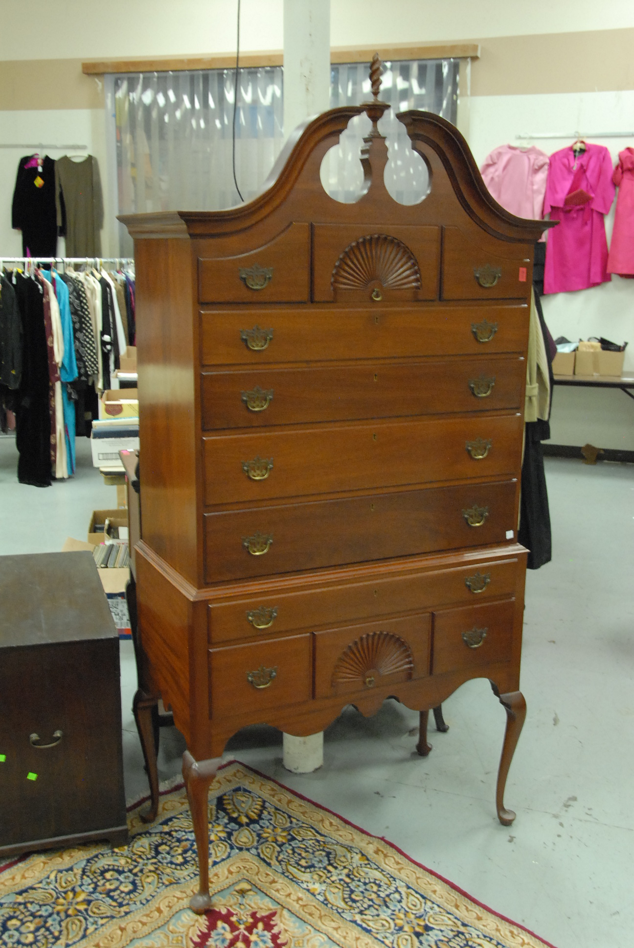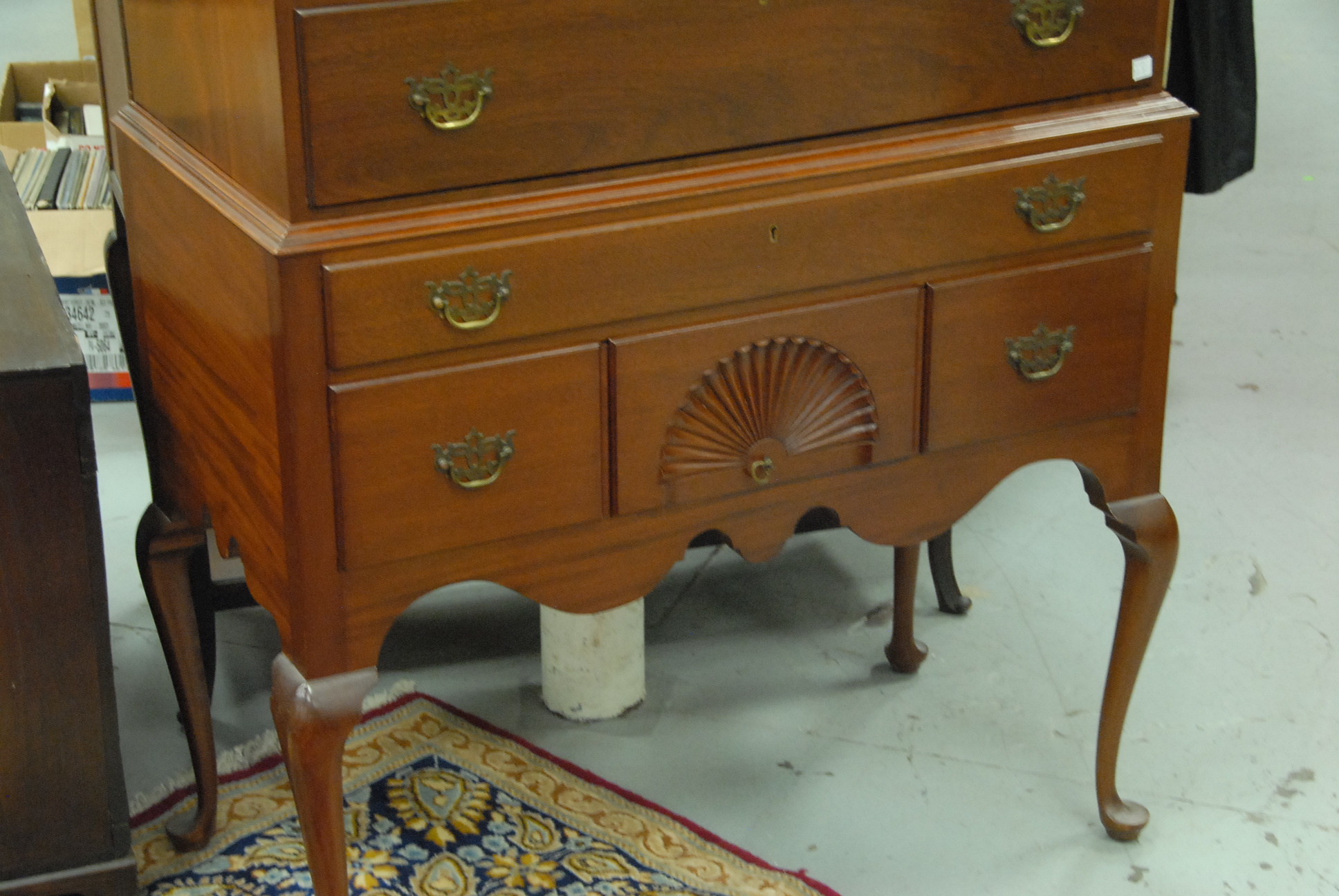 Lot 126: Margolis mahogany Queen Anne style highboy in two parts with broken arch top. ht. 81in. wd. 38in. very clean condition, signed wi…
