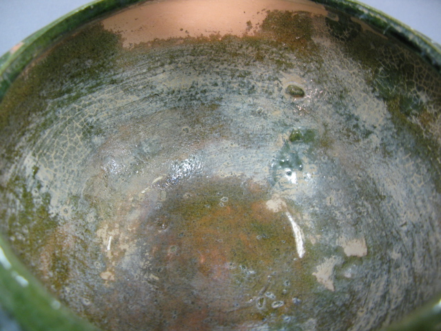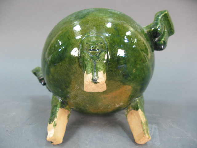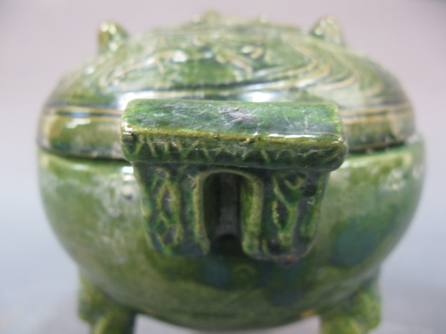 Oriental green glazed Censor having three footed base and molded cover with dragon design.