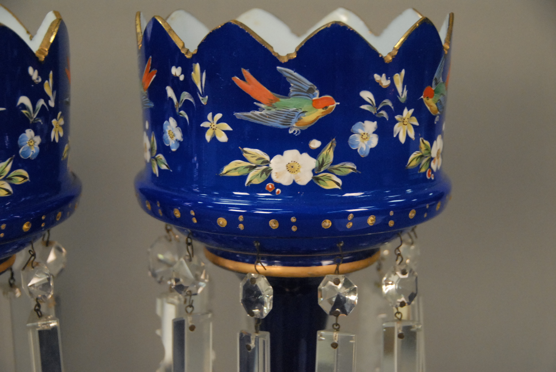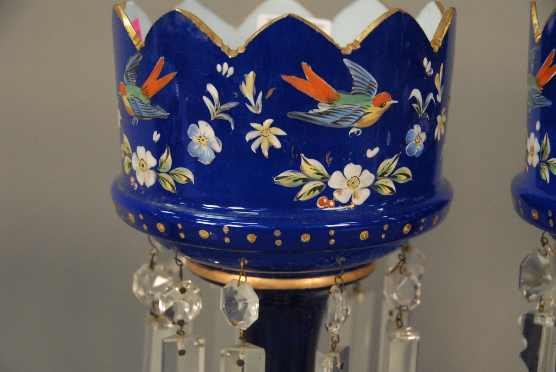 Pair of Bristol glass lusters, cobalt blue with hand painted flowers and birds with gilt trim. ht. 14in.