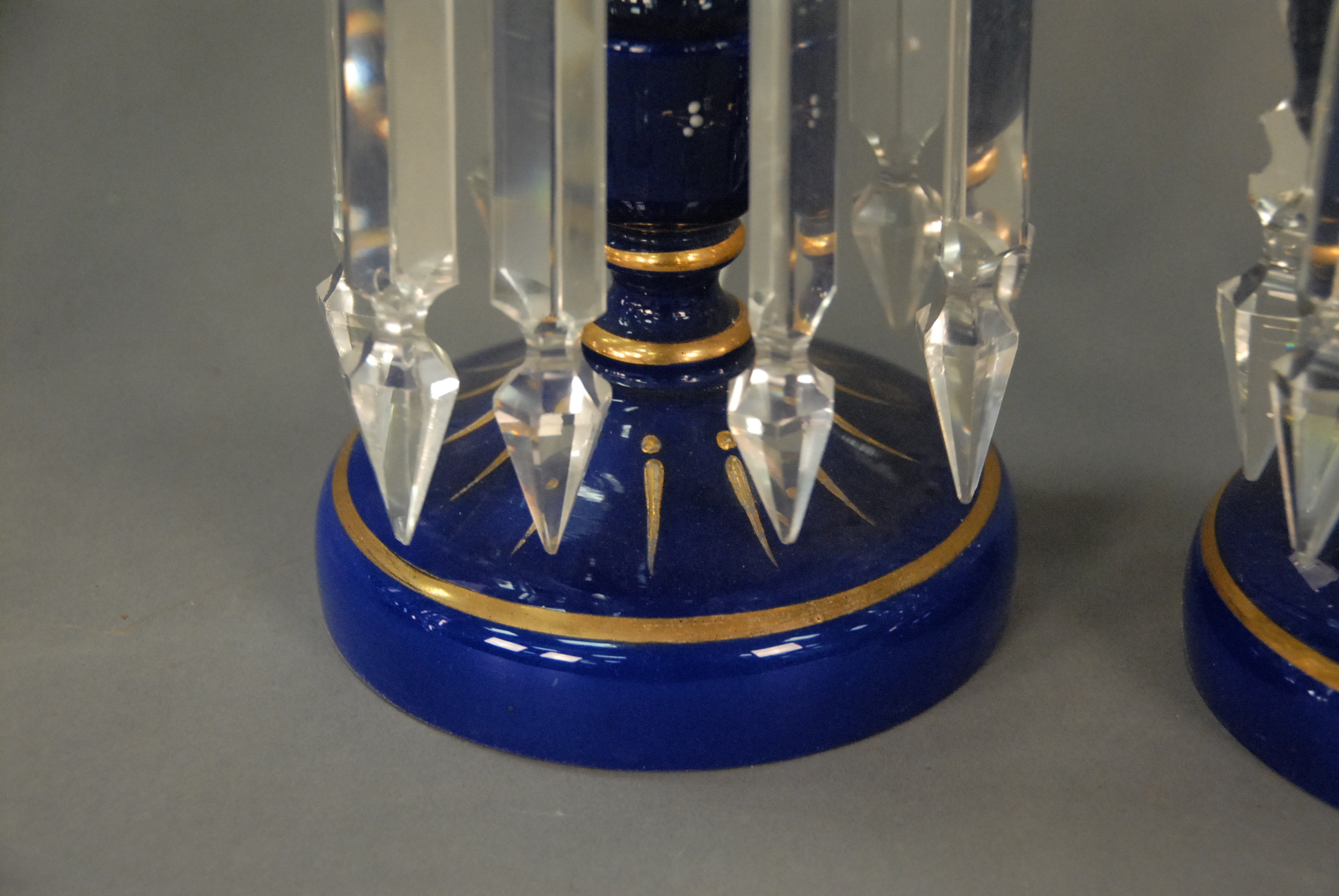 Lot 126: Pair of Bristol glass lusters, cobalt blue with hand painted flowers and birds with gilt trim. ht. 14in.
