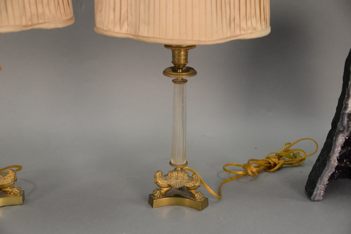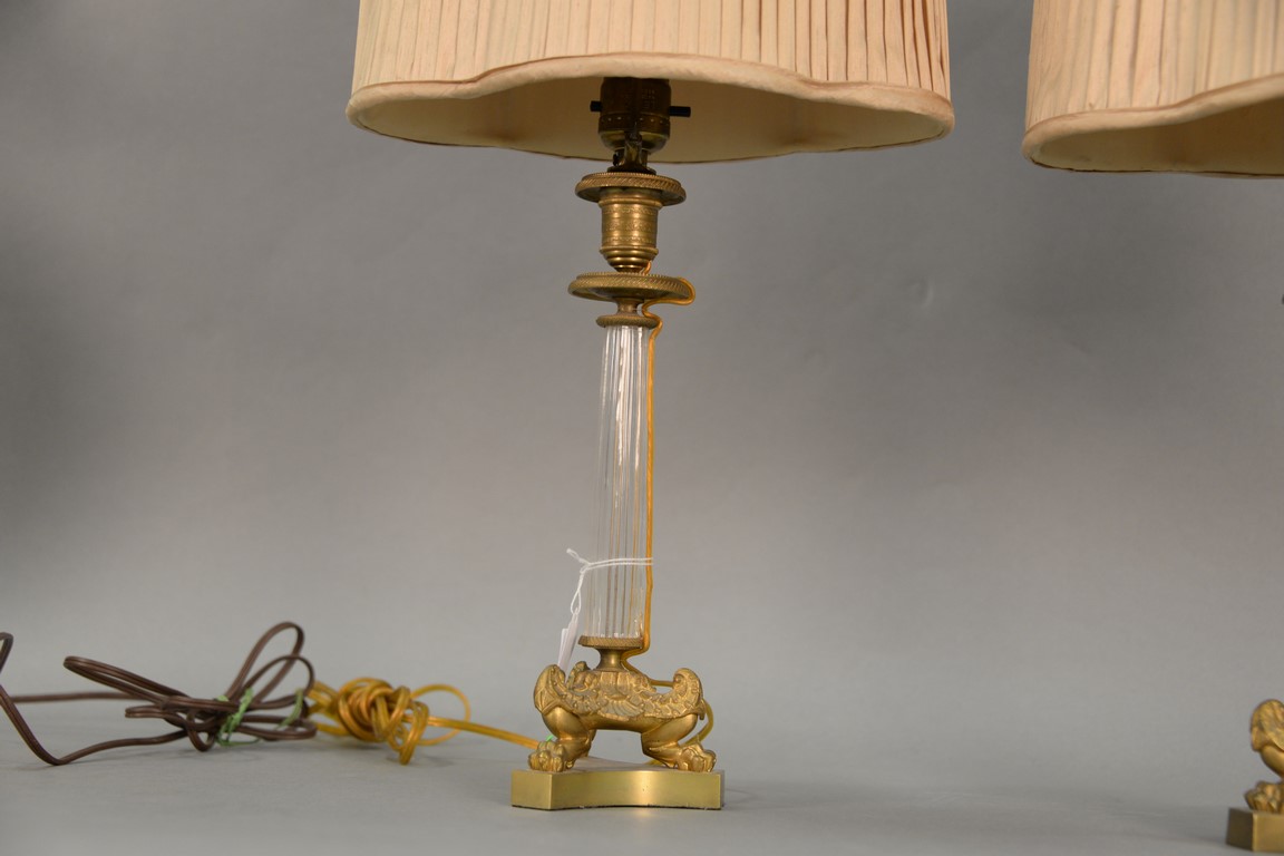 Lot 126: Pair of bronze and crystal boudoir table lamps made from candlesticks with crystal stems and bronze paw feet. candlestick ht. 11 1/2in.