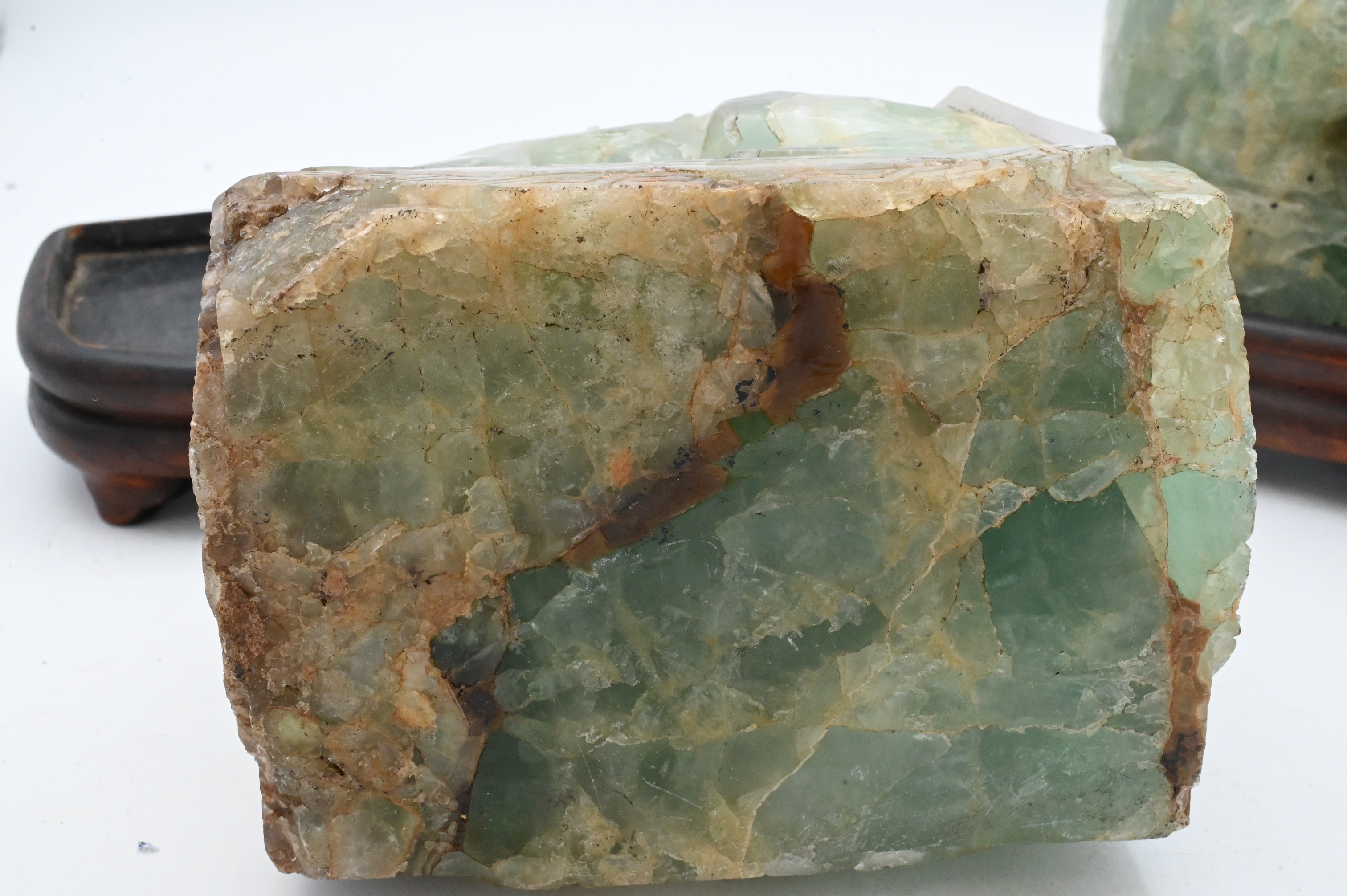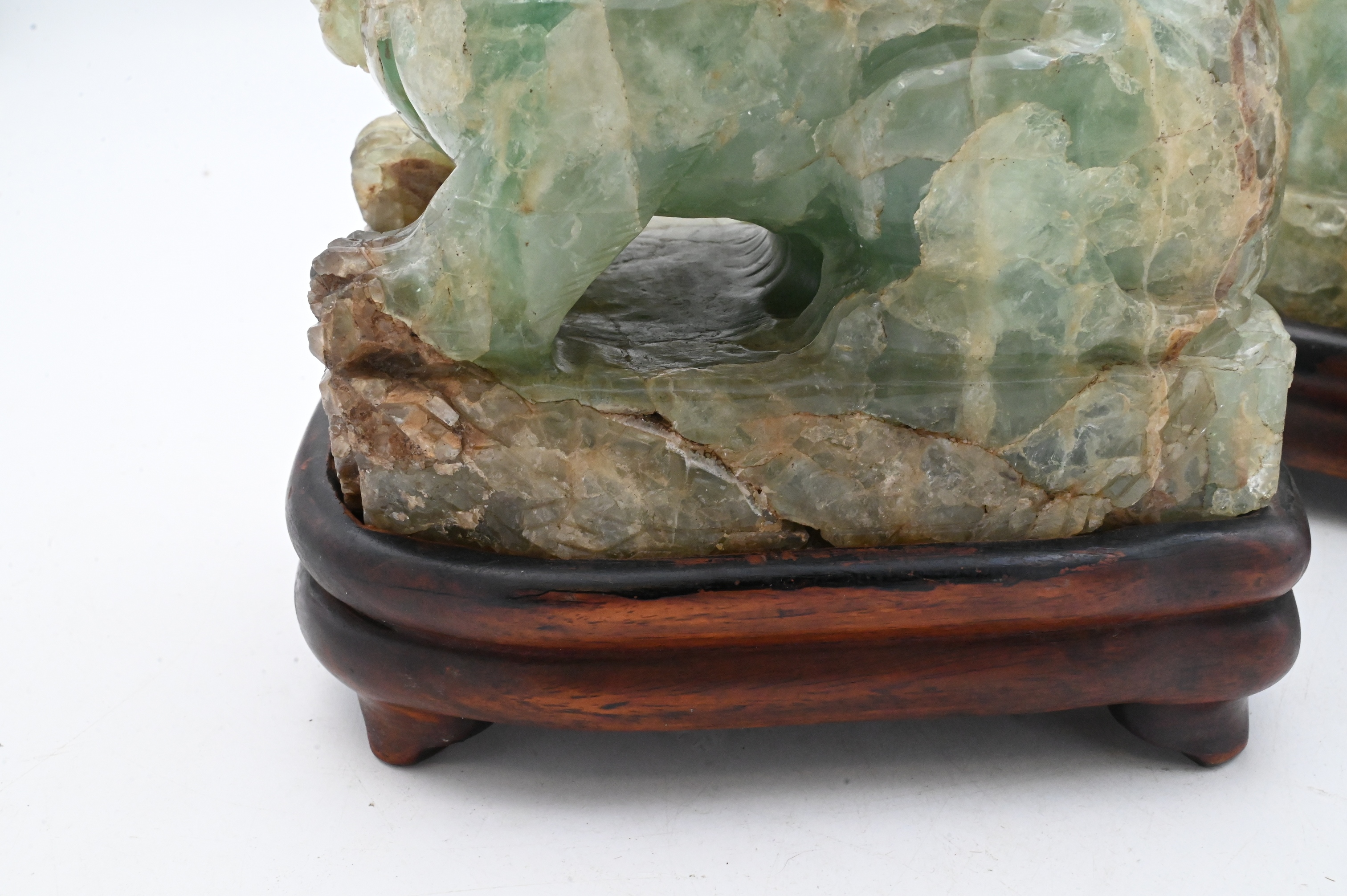 A pair of Chinese carved hardstone foo dogs, rendered in pale green stone with russet inclusions, each seated on a rectangular base. Mounted on fitted wooden stands.