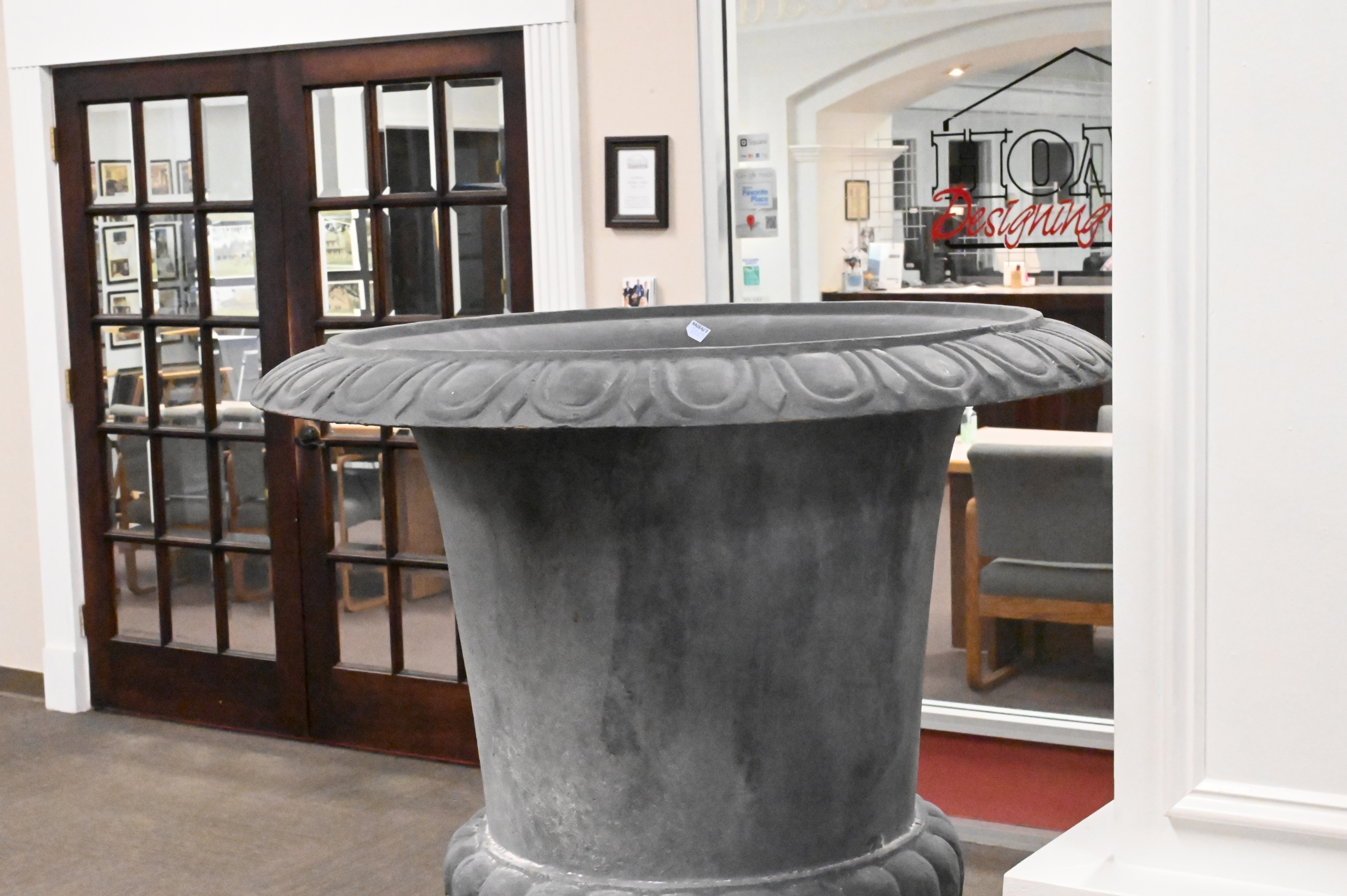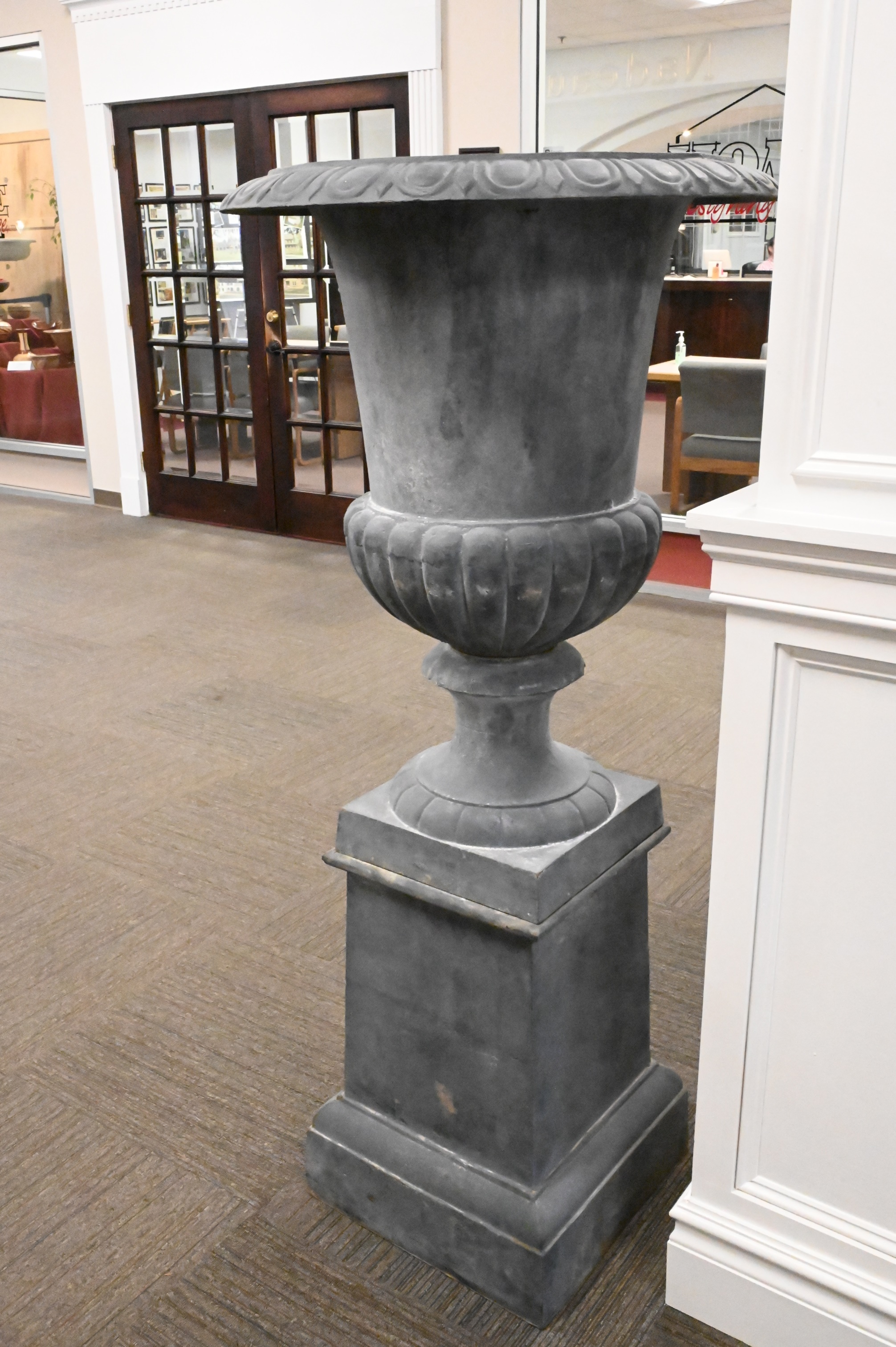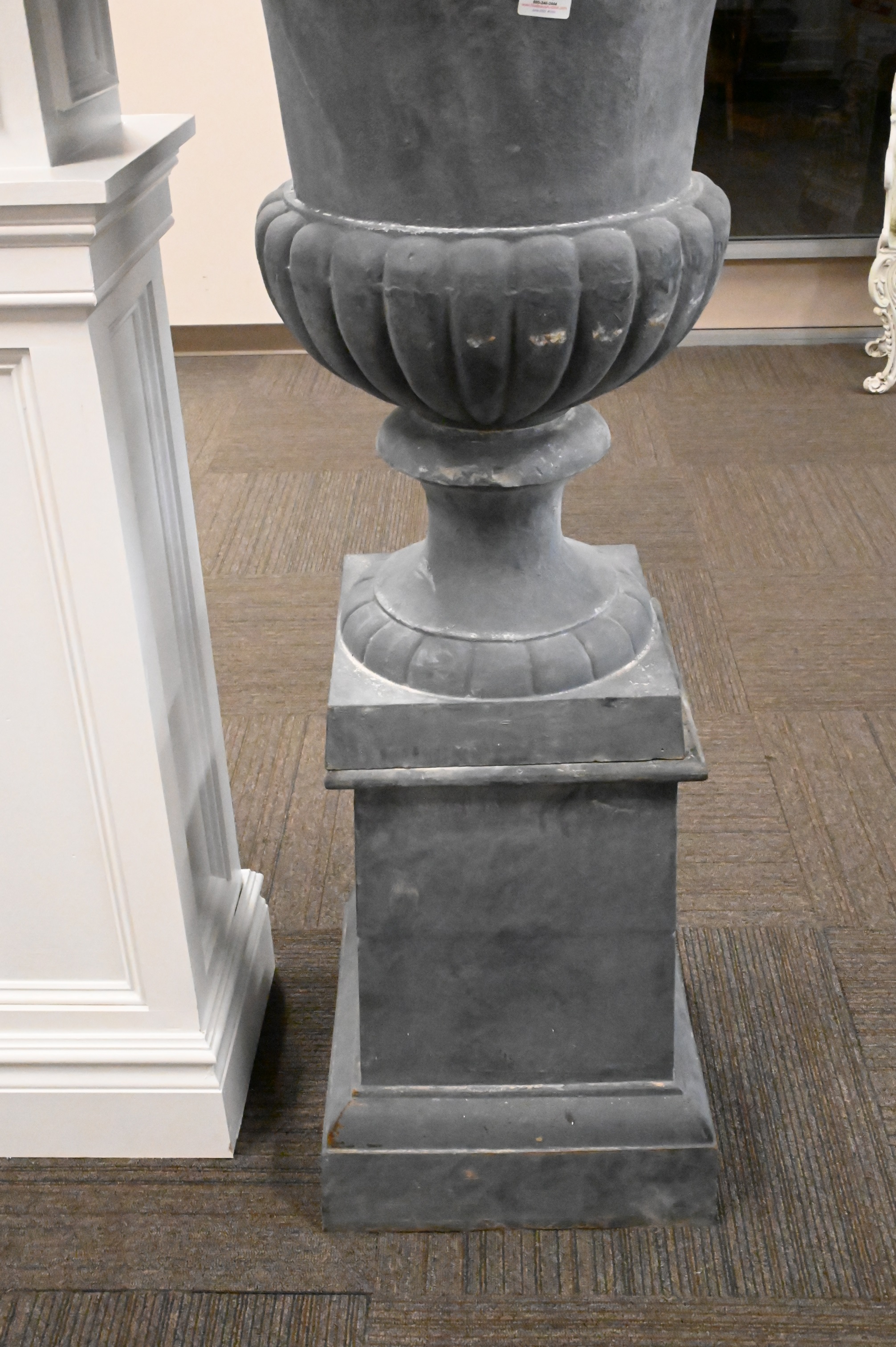 Pair of Two Part Iron Outdoor Planters, in urn form, each with holes at base for drainage, height 59 1/2 inches, diameter 22 inches.