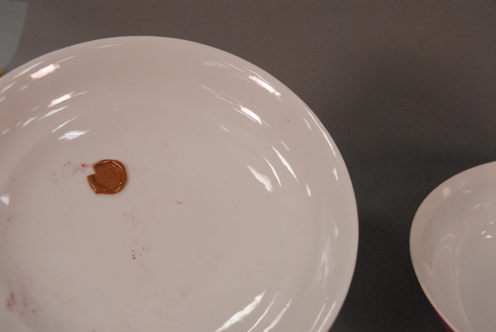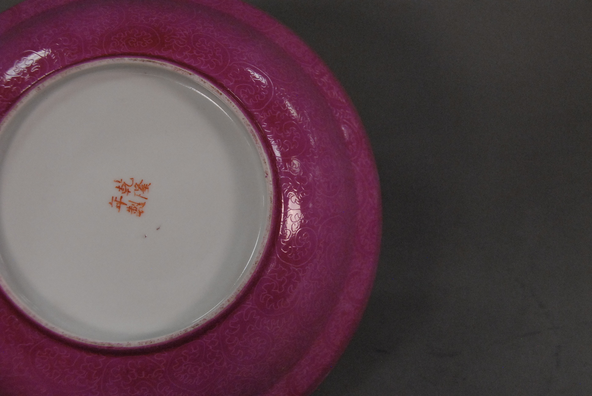 Pink ground covered serving bowl with an overall incised scrolling line decoration having four character marks on bottom and wax seal.